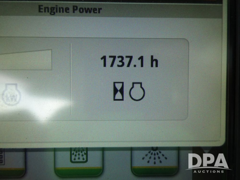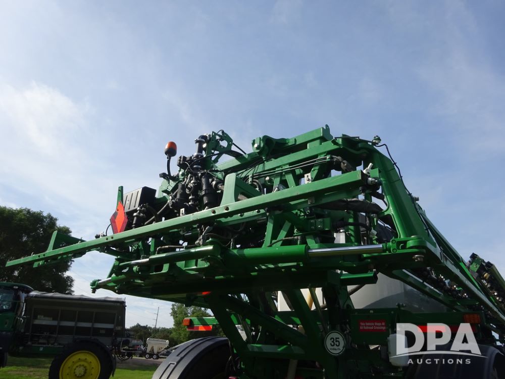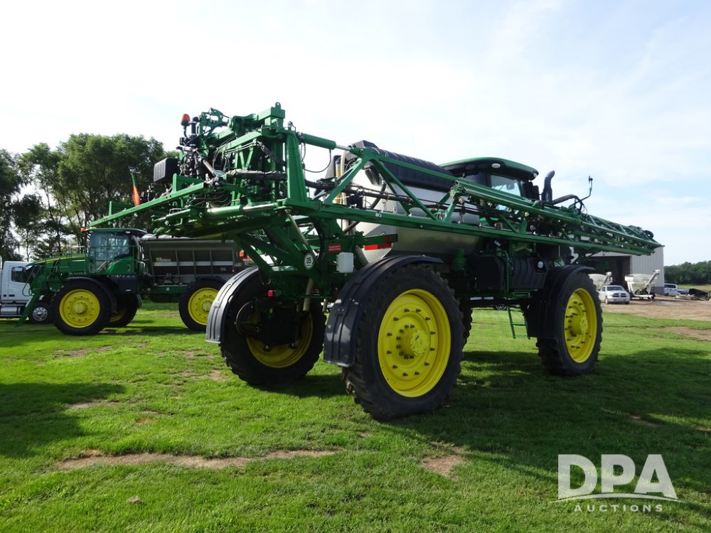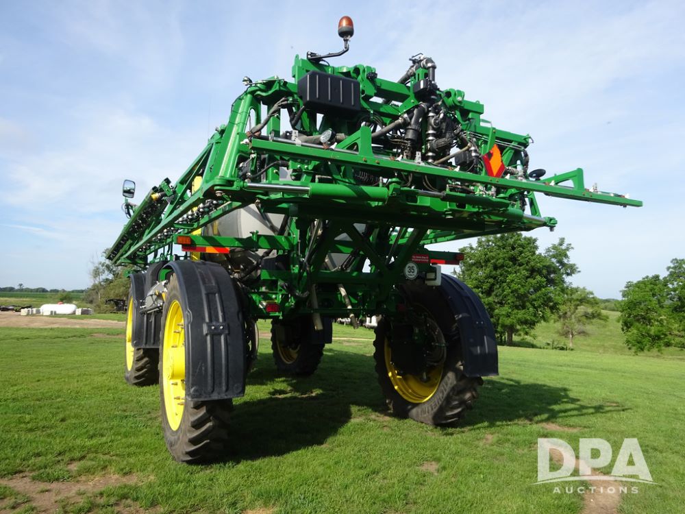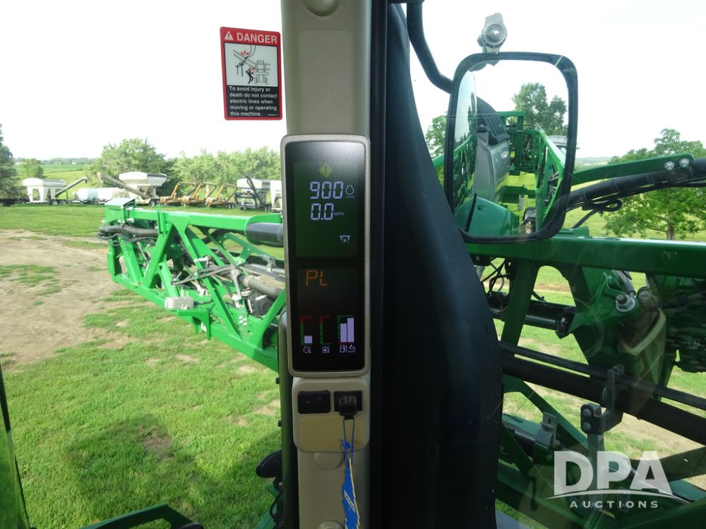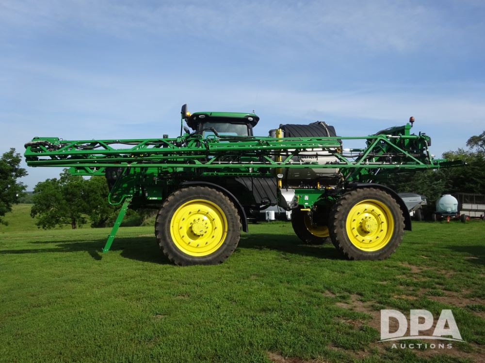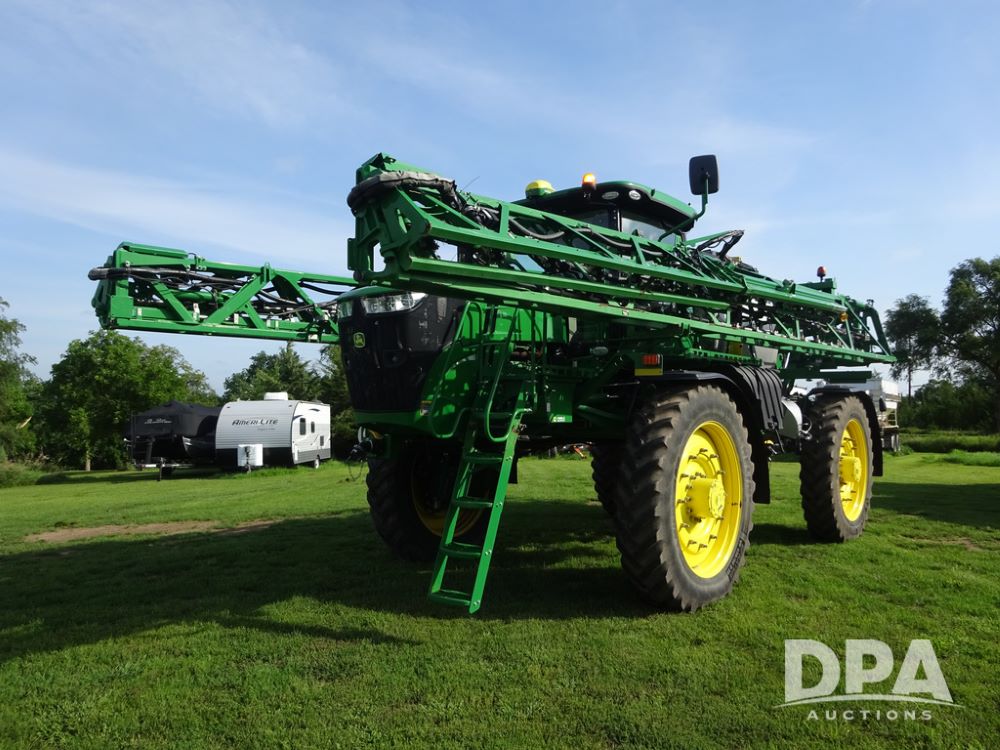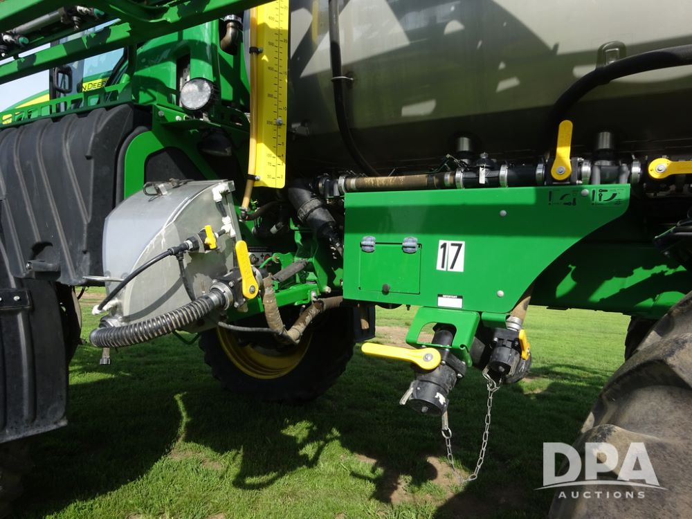 2018 John Deere R4045 Sprayer (PZ13716 Unit 106354), John Deere diesel engine, hydrostatic drive, 1200 gallon stainless steel liquid system, 120' boom, stainless steel chemical inductor, saddle mounted poly rinse tank, auto height adjust sensors, front and side load, StarFire 6000 globe, Green Star 3 display, buddy seat, cab heat/air conditioning, Michelin 420/95R50 row crop tires, full set fenders, shows 1,737 hours.