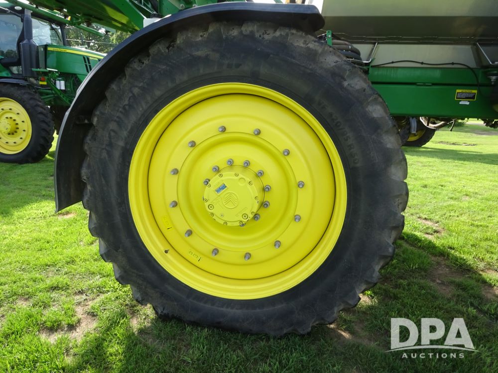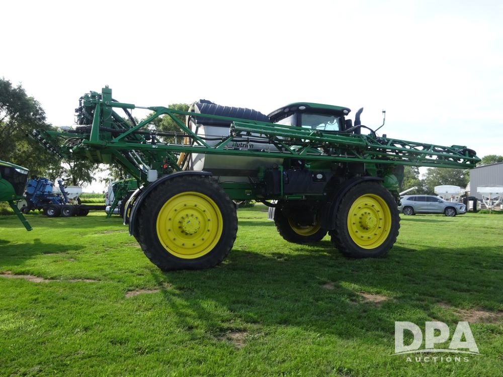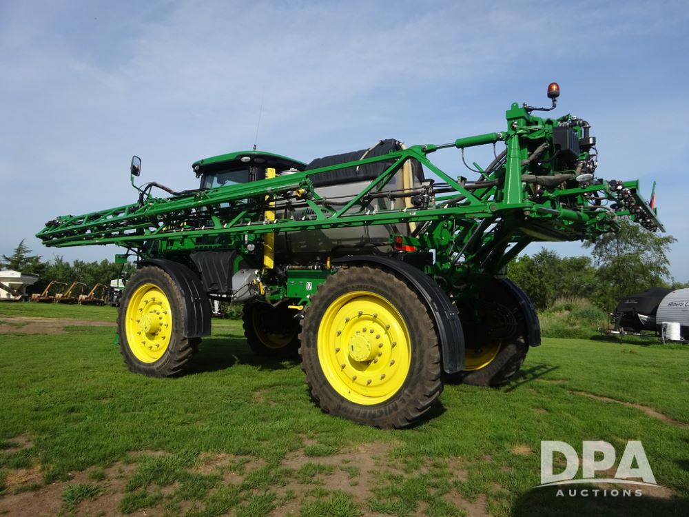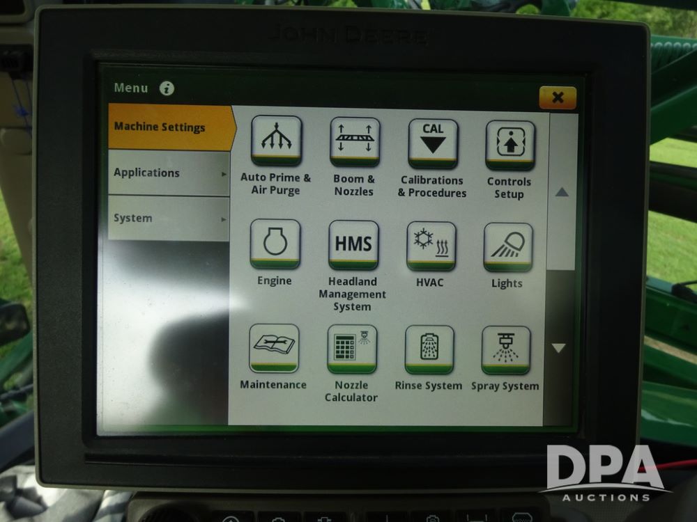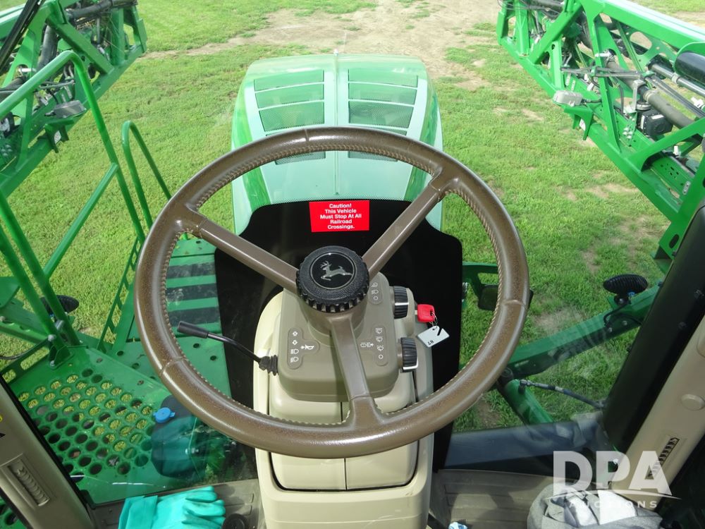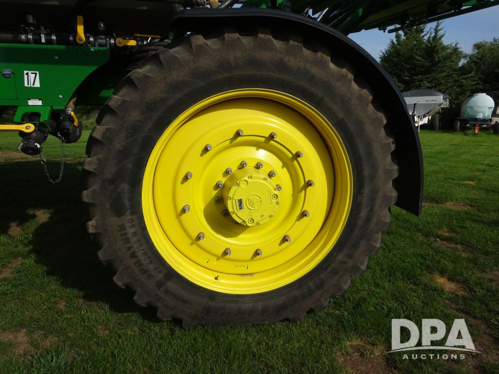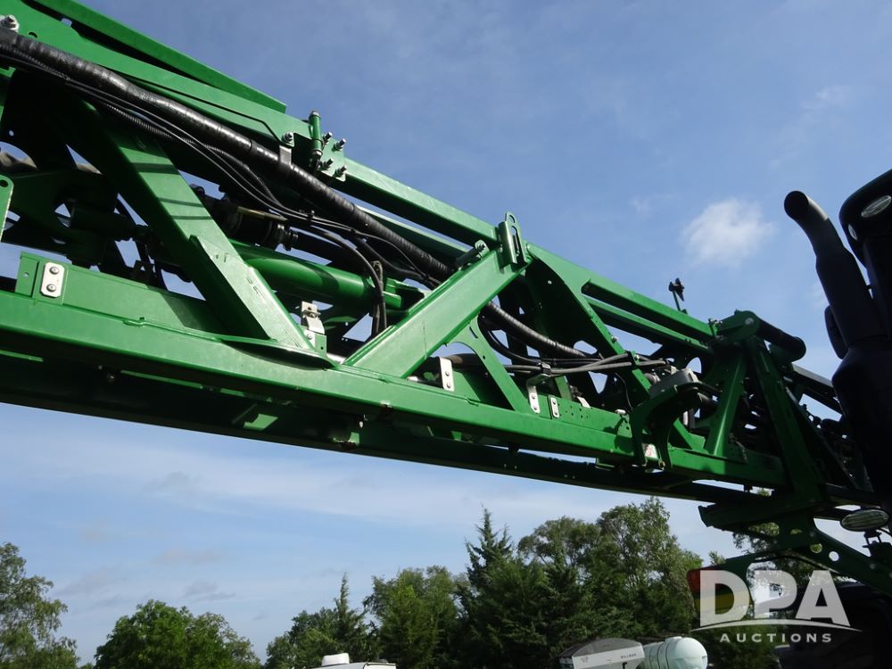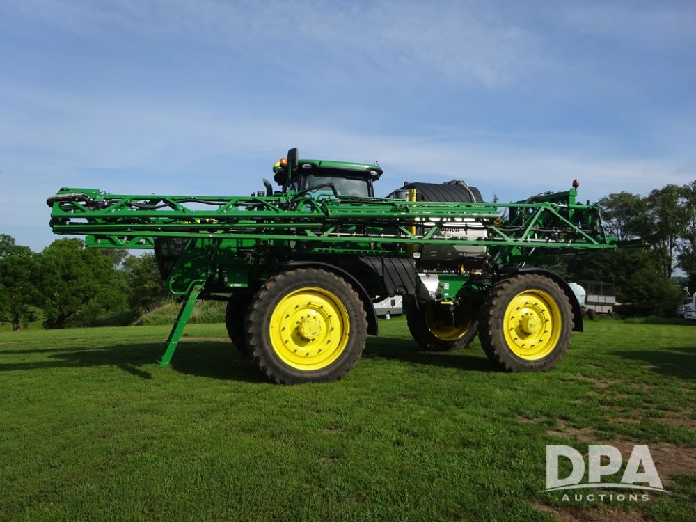 2018 John Deere R4045 Sprayer (PZ13716 Unit 106354), John Deere diesel engine, hydrostatic drive, 1200 gallon stainless steel liquid system, 120' boom, stainless steel chemical inductor, saddle mounted poly rinse tank, auto height adjust sensors, front and side load, StarFire 6000 globe, Green Star 3 display, buddy seat, cab heat/air conditioning, Michelin 420/95R50 row crop tires, full set fenders, shows 1,737 hours.