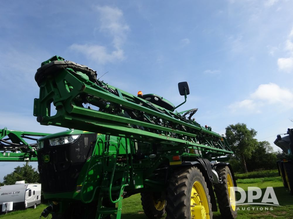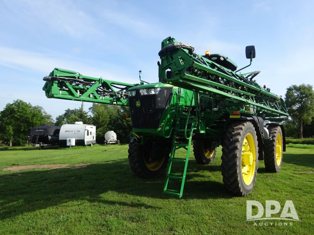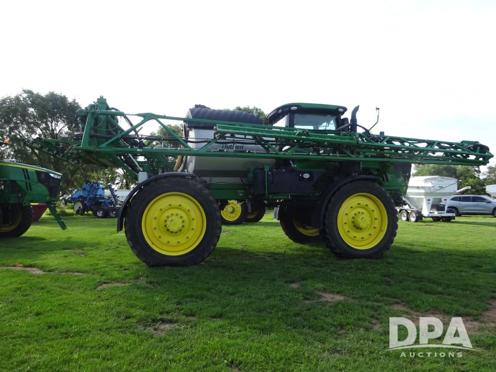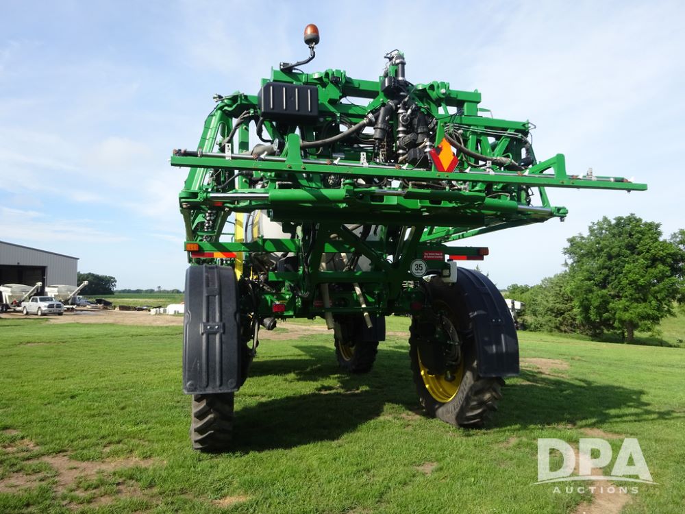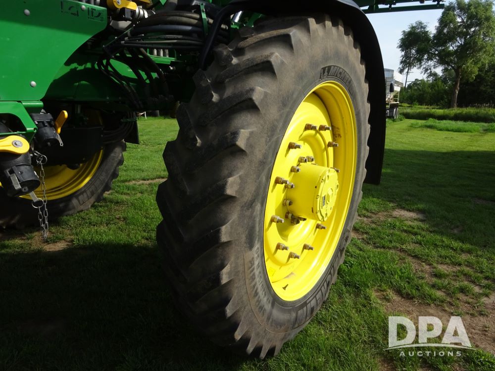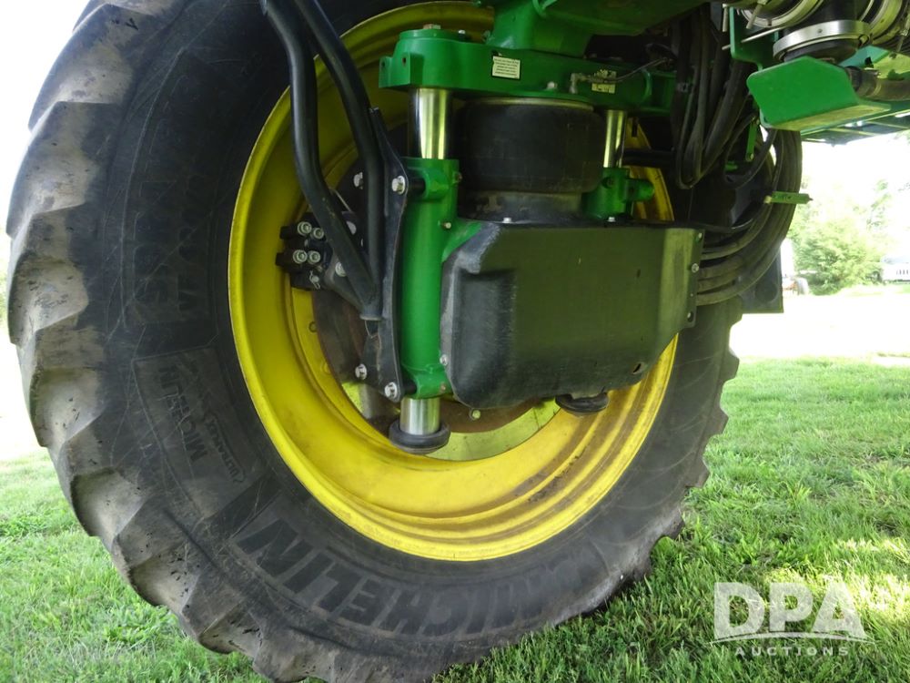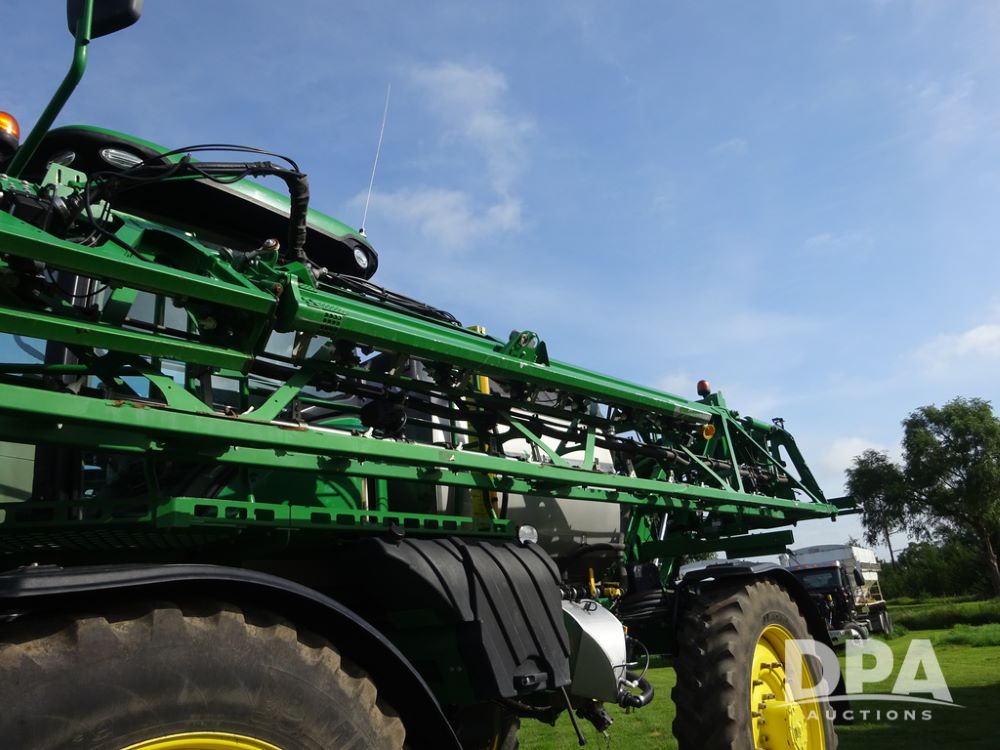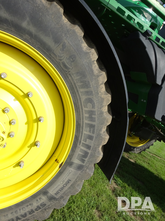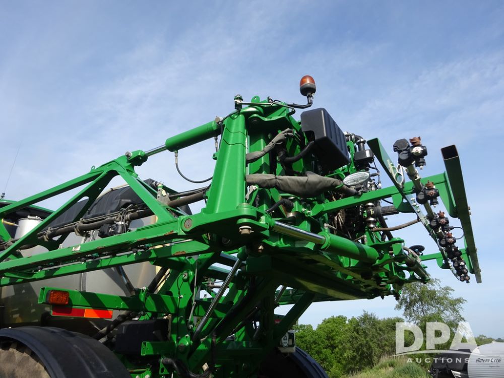 2018 John Deere R4045 Sprayer (PZ13716 Unit 106354), John Deere diesel engine, hydrostatic drive, 1200 gallon stainless steel liquid system, 120' boom, stainless steel chemical inductor, saddle mounted poly rinse tank, auto height adjust sensors, front and side load, StarFire 6000 globe, Green Star 3 display, buddy seat, cab heat/air conditioning, Michelin 420/95R50 row crop tires, full set fenders, shows 1,737 hours.