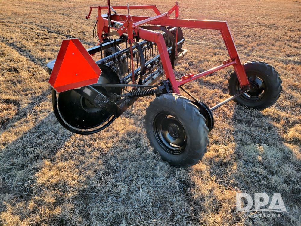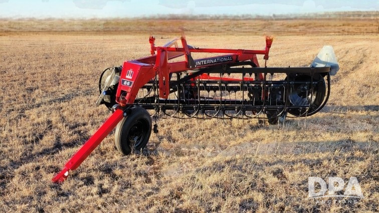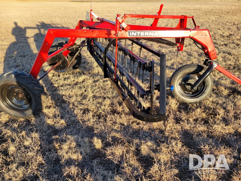 International 86 Side Load Rake (NJP486), completely refurbished in 2026, brand new teeth, belt, drive, manual raise and lower, all lights work, new tires, on back.