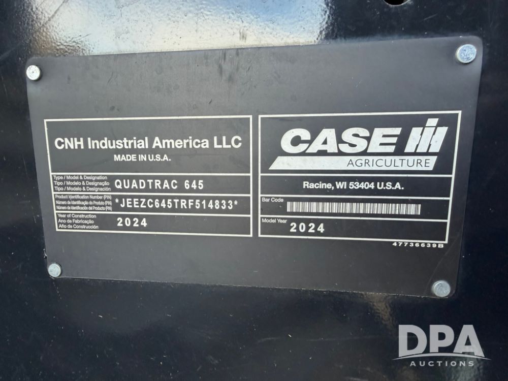 2024 Case IH 645 Quadtrac Tractor (PD5454), 4WD, FPT Cursor 13 turbocharged diesel engine, powershift transmission, Luxury cab, 36 inch Trackman T700 tacks, differential lock, 1000 PTO, 6 rear remotes, 2 high capacity pumps, CIH lighting, air conditioning/heat, AM/FM radio, high capacity drawbar, telematics, TWO PUMPS, Luxury technology cab, AFS Vector Pro, Single Pro 1220 display, PCM3, shows 955 hours.