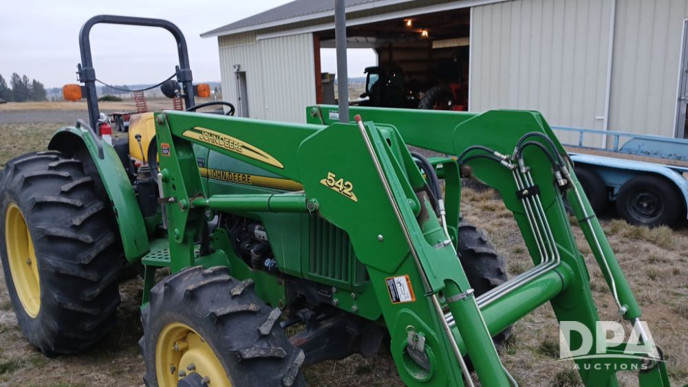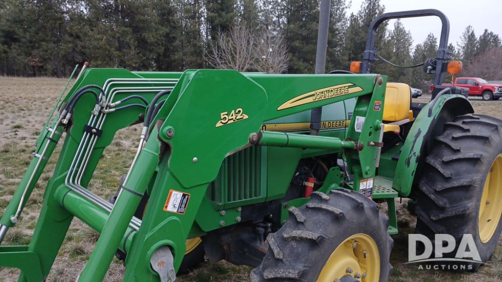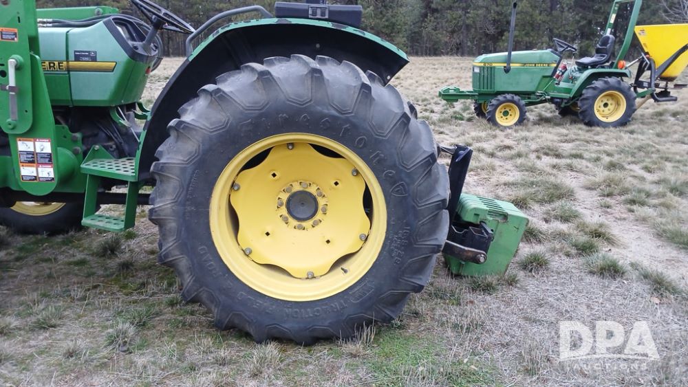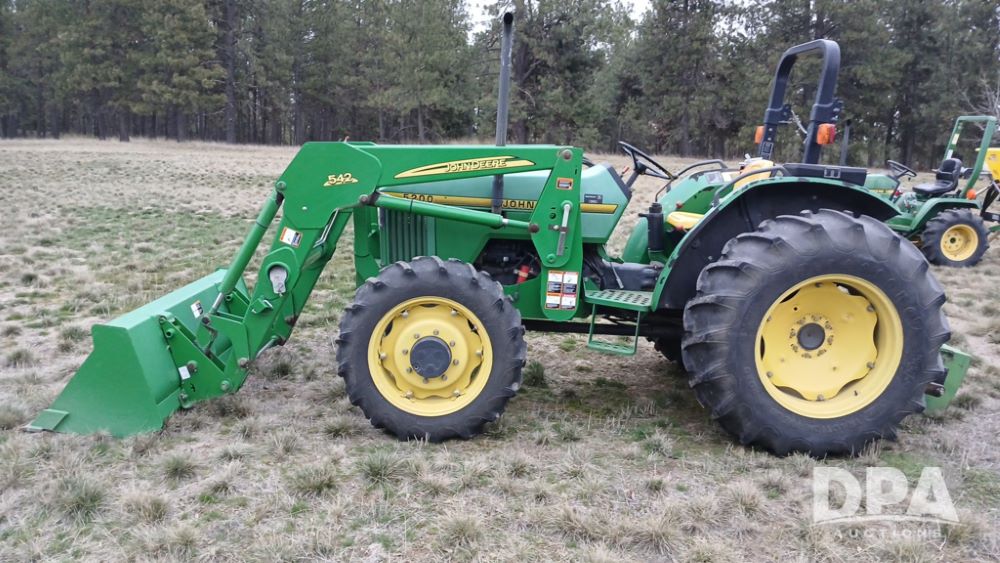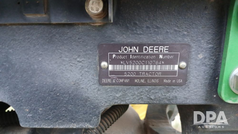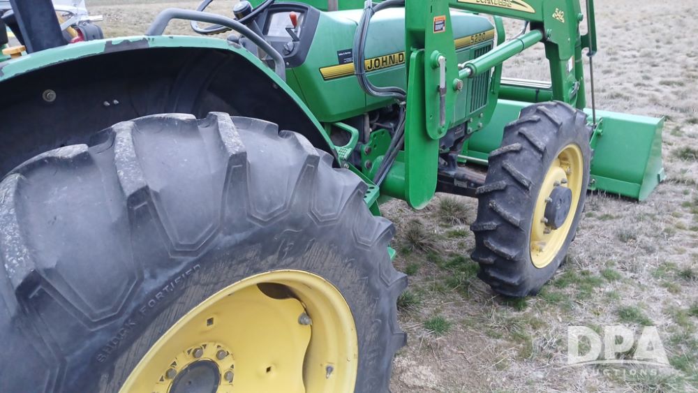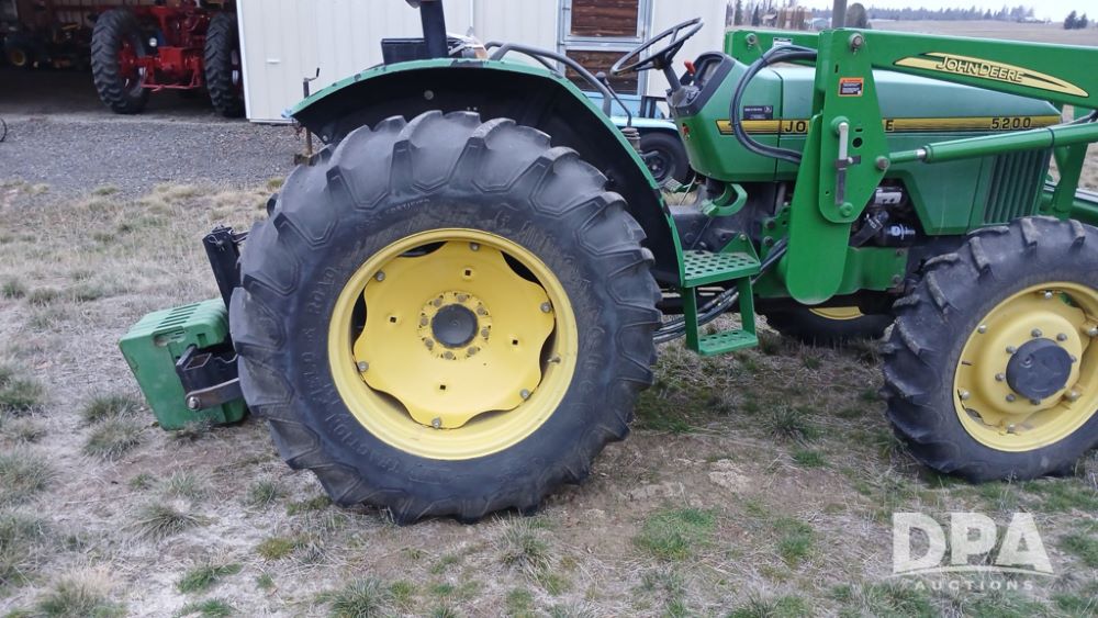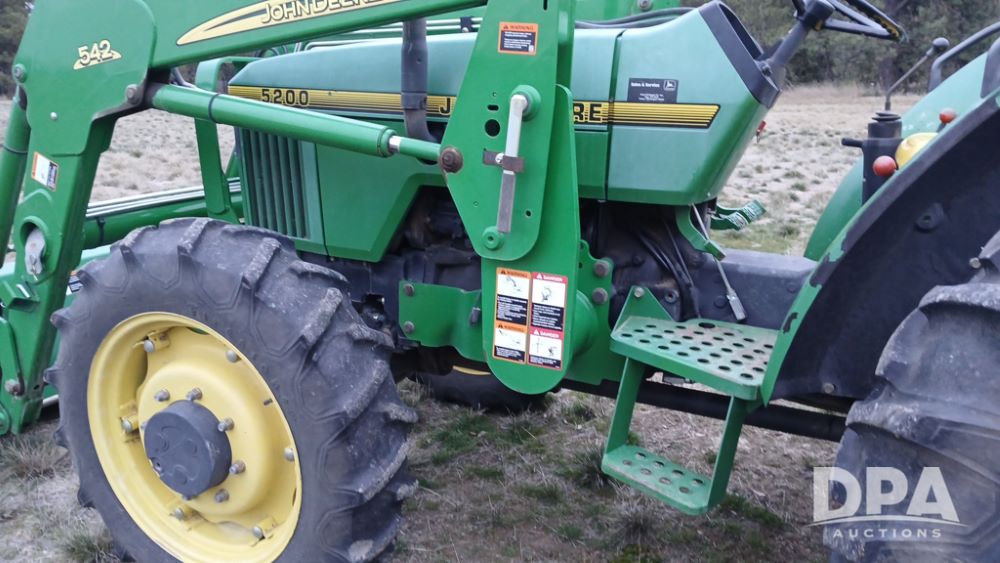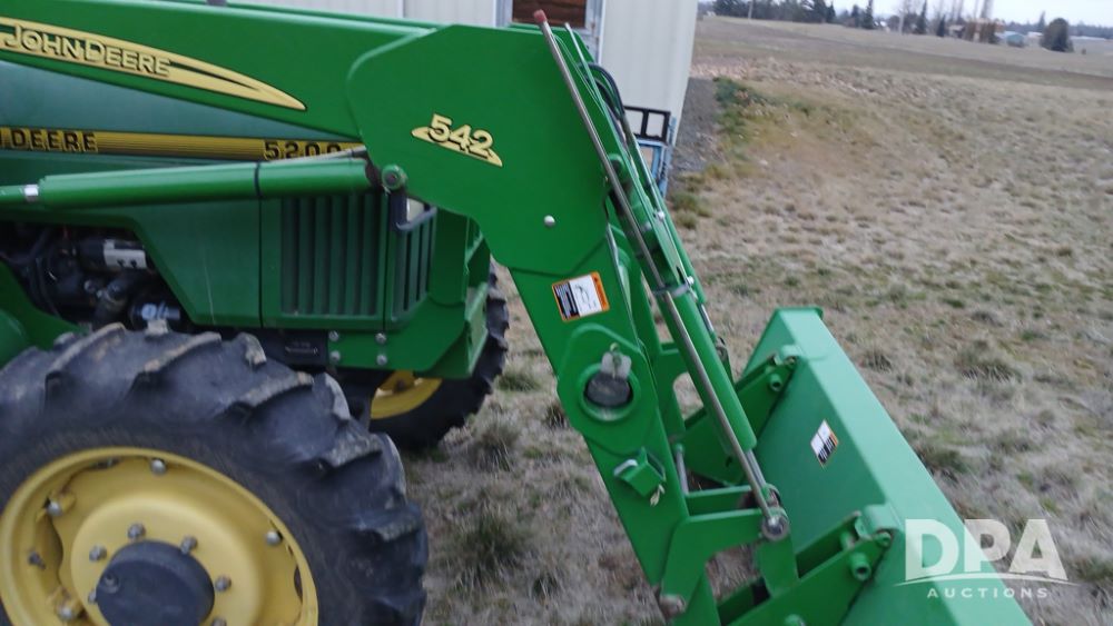 John Deere 5200 Tractor (NP6422), diesel engine, roll bar, John Deere 542 hydraulic front end loader, bucket, 16.9-28 rear tires, (6) rear suitcase weights, PTO, shows 1,421 hours.