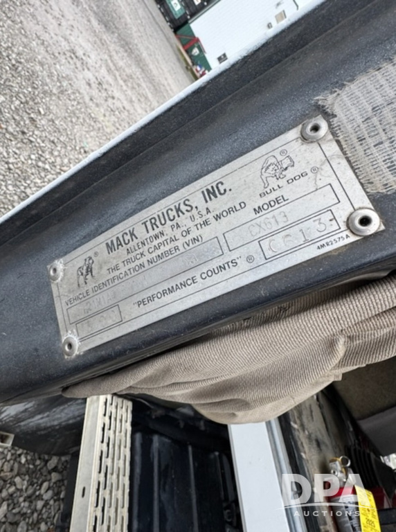 2000 Mack CX613 Dry Tender Truck (PZ14353, Unit 15108), diesel engine, Eaton Fuller transmission, heat, Am/Fm radio, tandem axle, full screw, Adams 16 ton stainless steel dry tender box, side discharge auger, all hydraulic, roll over tarp.