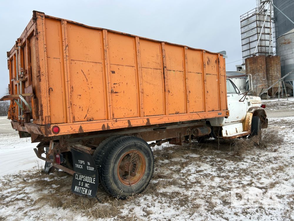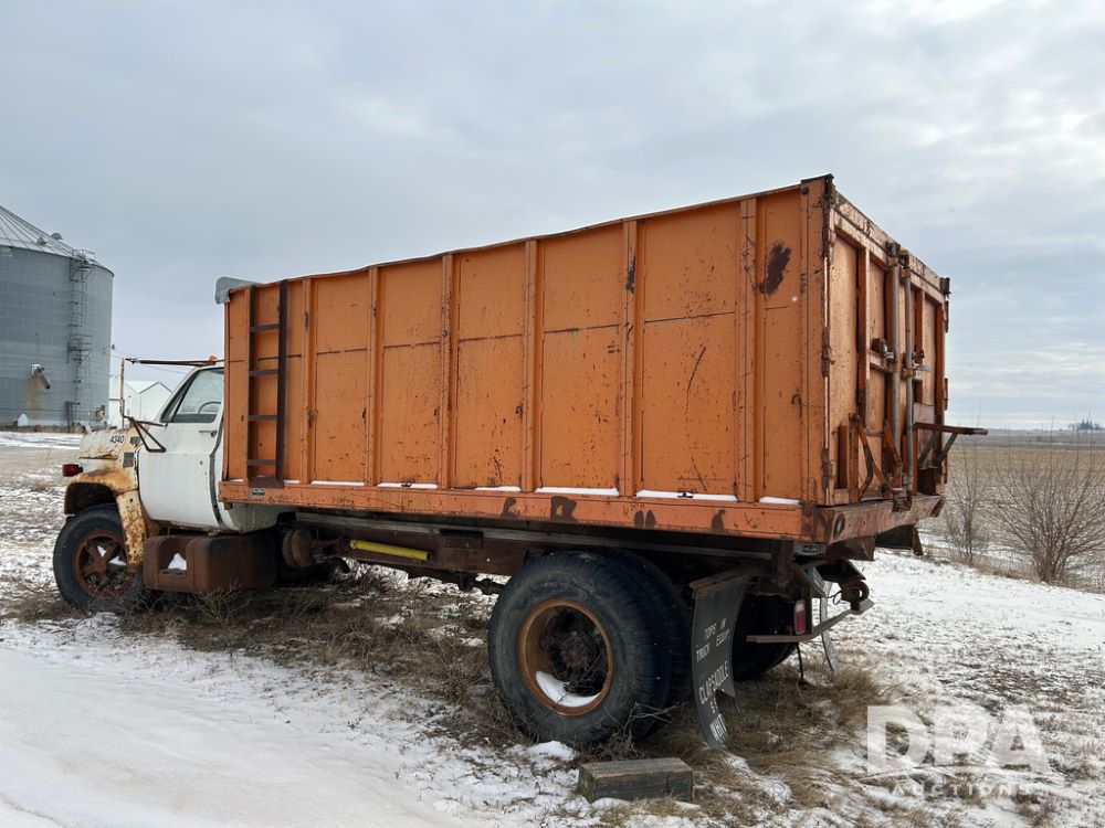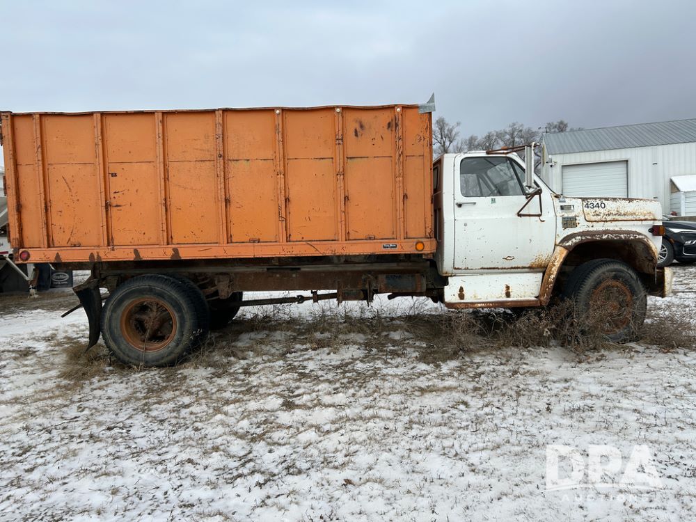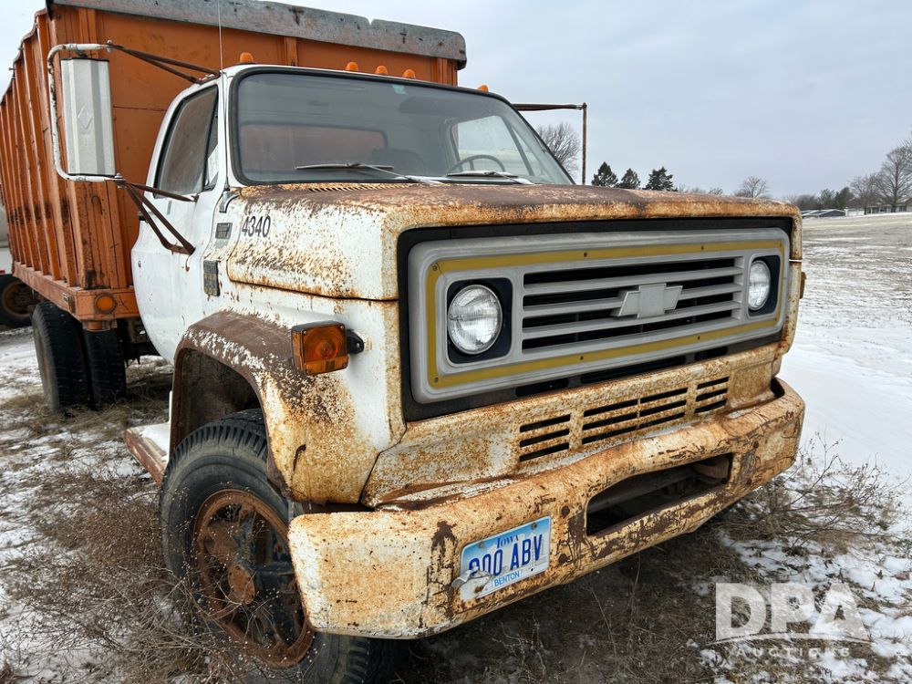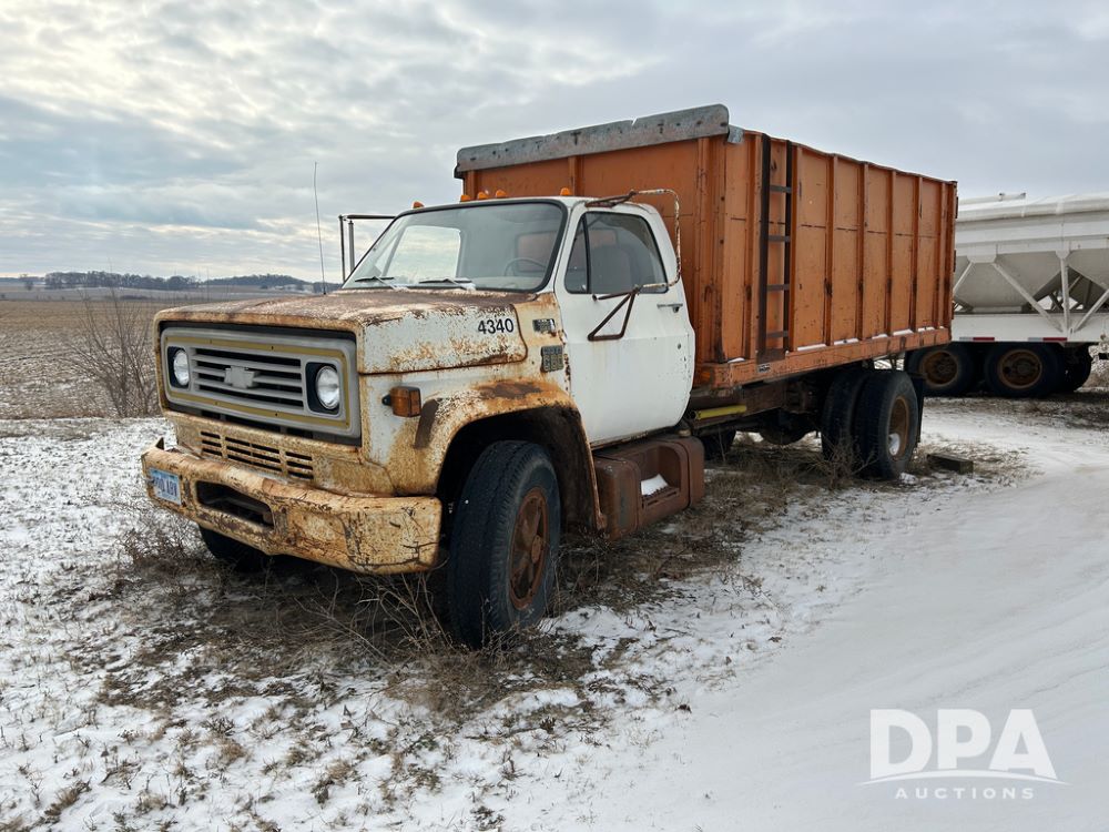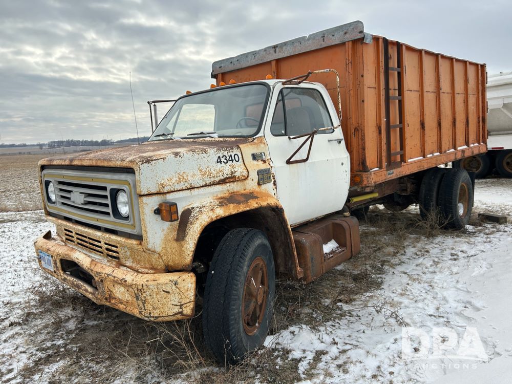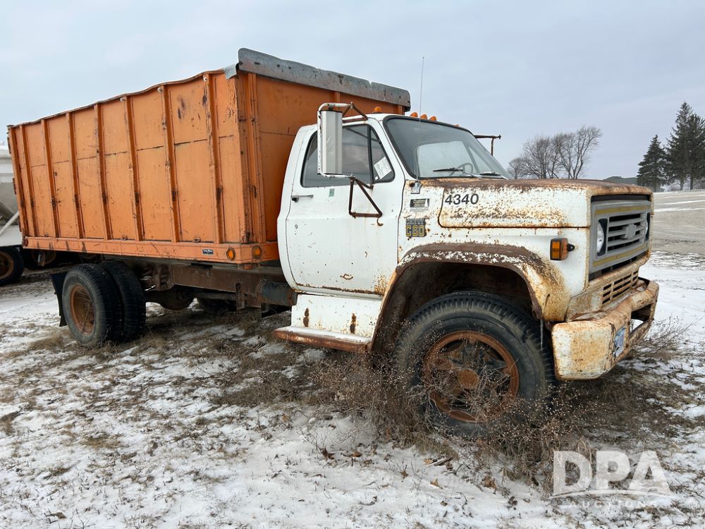 Chevy Grain Truck (CP1505, Unit 4340), NON RUNNER C60 grain truck, gas engine, 5 speed transmission, 2 speed rear end, single axle, 14' steel grain box & hoist, rear barn door tail gate w/grain doors, 9:00-20 tires.
