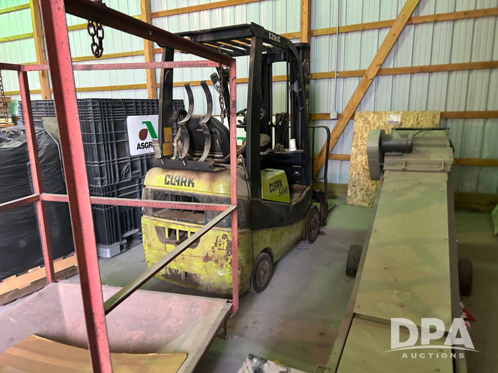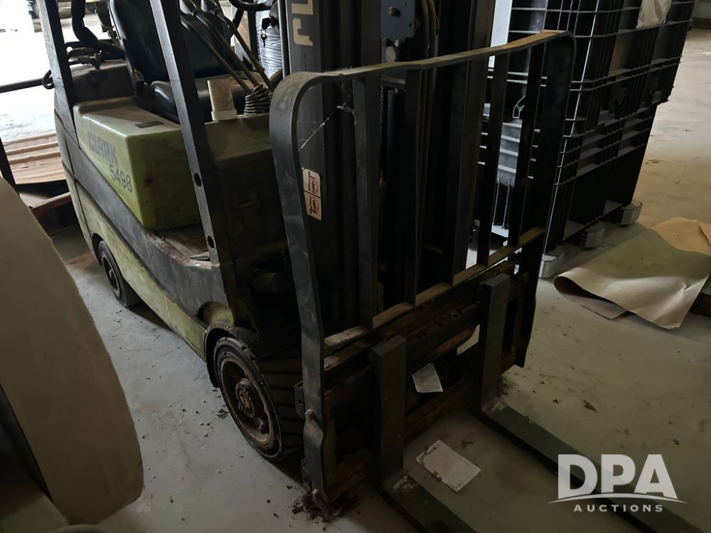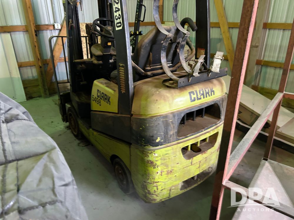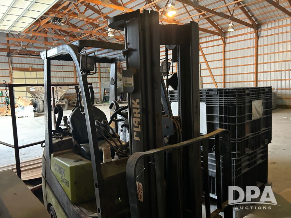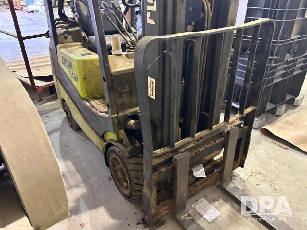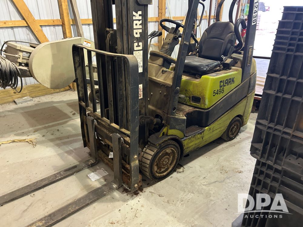 Clark Forklift (CP1471, Unit 5498), model C20, LP engine, no tank, shuttle shift drive, 3 stage mast, 3600lb capacity, 48'' forks, hydraulic side shift, solid tires,
