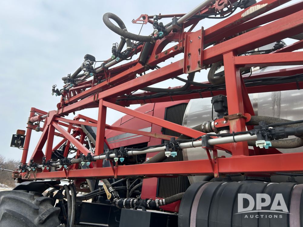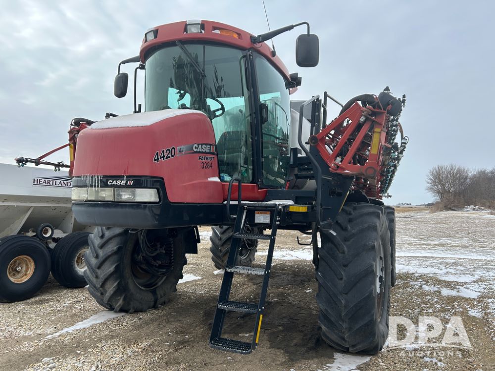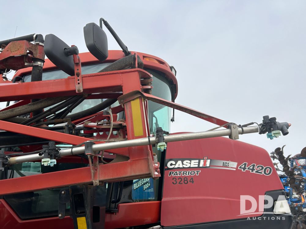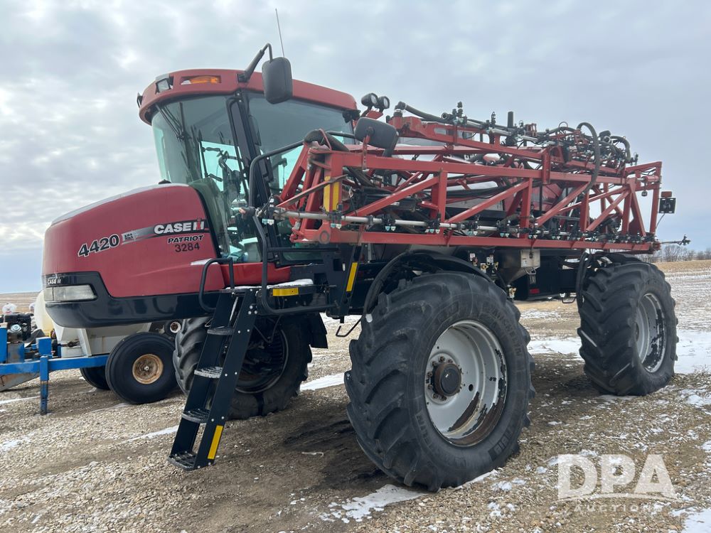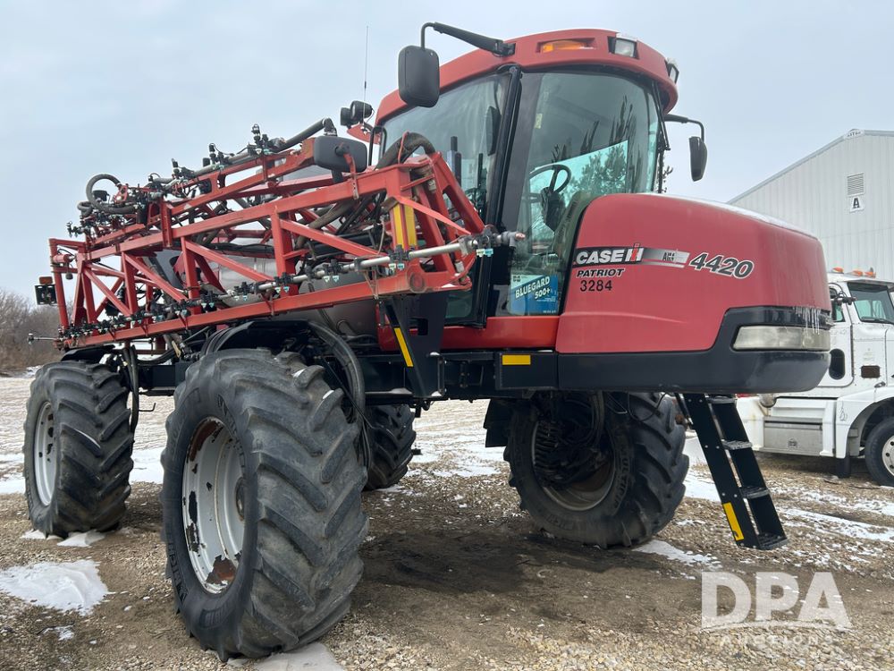 Case IH 4420 Sprayer (CP1488, Unit 3284), diesel engine, hydrostatic drive, 1200 gallon stainless steel liquid system, 120' boom, pulse nozzles, AIM Command, Raven Viper Pro controller, stainless steel chemical inductor, poly rinse tank, cab cam, cab heat/air conditioning, 650/65R38 flotation tires.