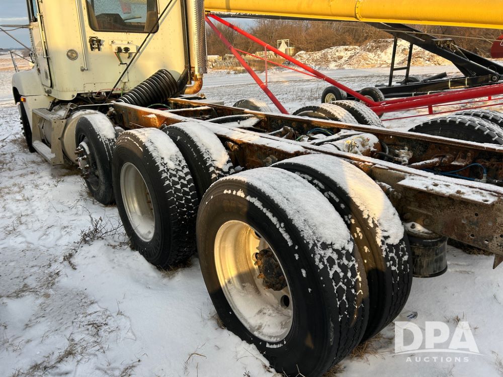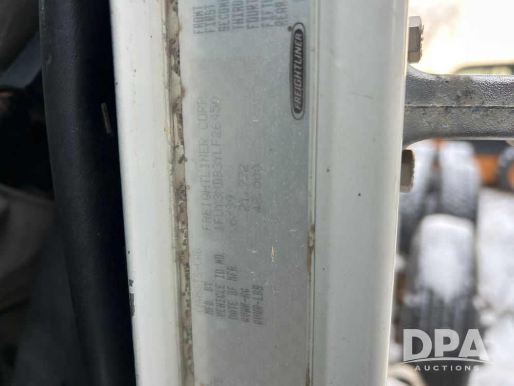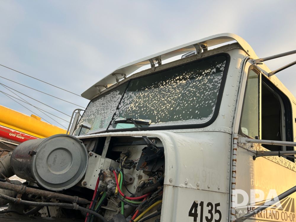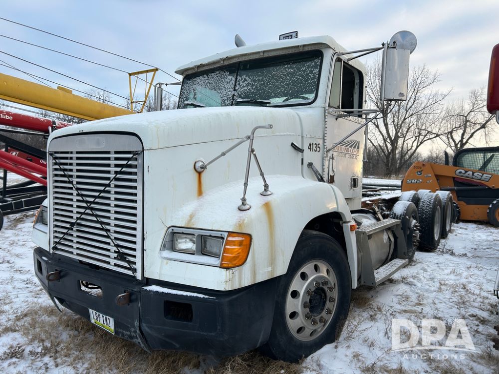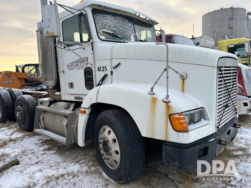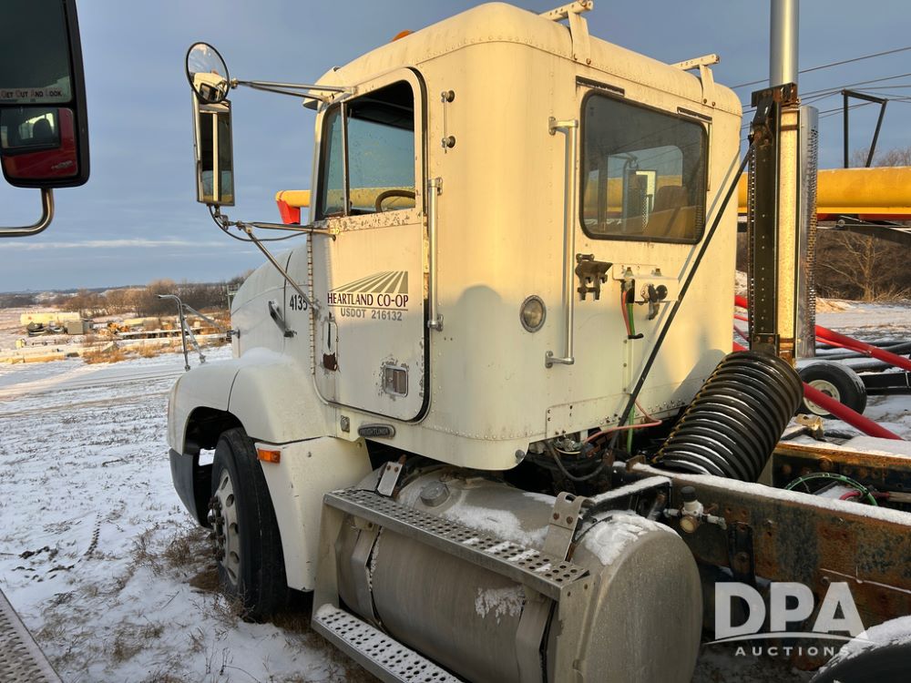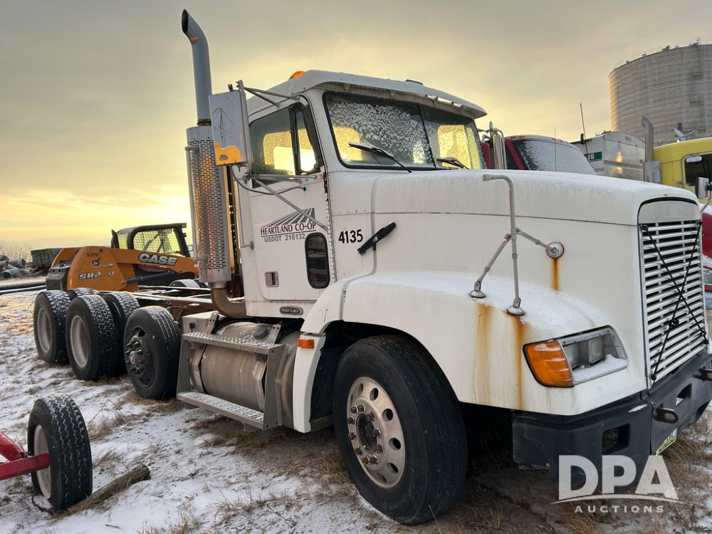 2000 Freightliner FLD112 Truck (CP1494, Unit 4135), cab/chassis, Cummins ISM diesel engine, 10 speed transmission, tandem axle full screw, air lift tag axle, air ride suspension, dual aluminum fuel tanks, cruise control, air dump valve, 22.5 tires, aluminum wheels, odometer reads 766,188 miles.