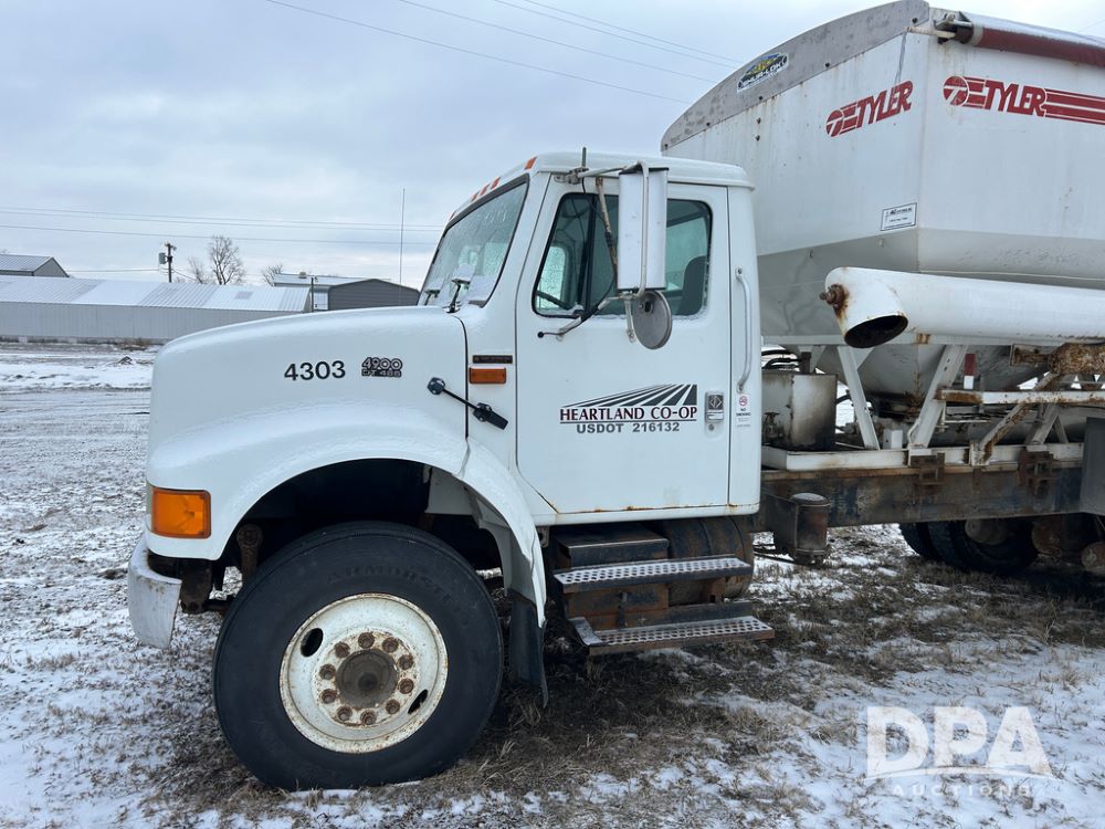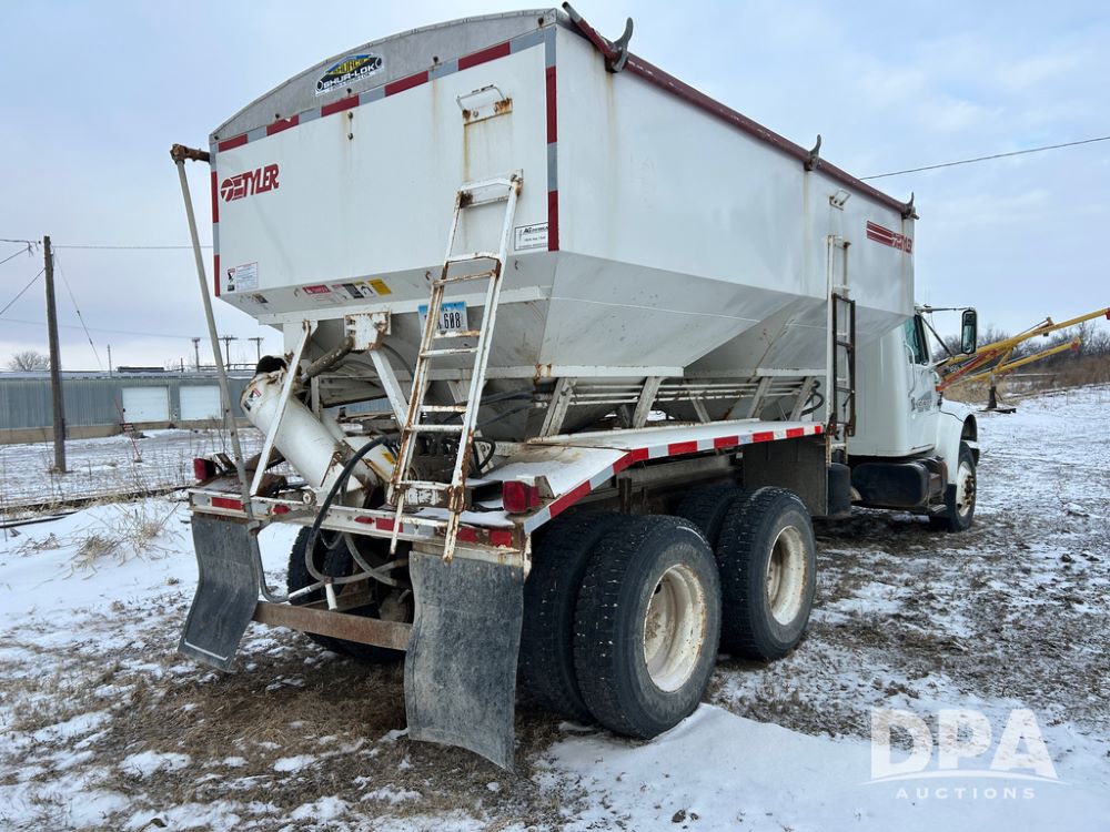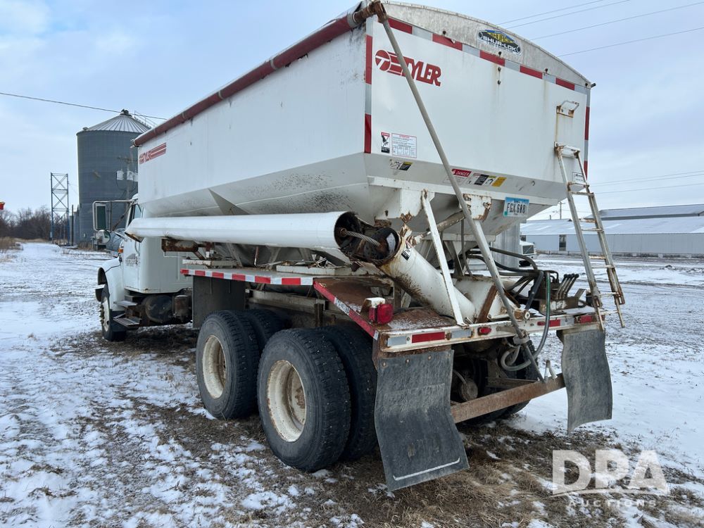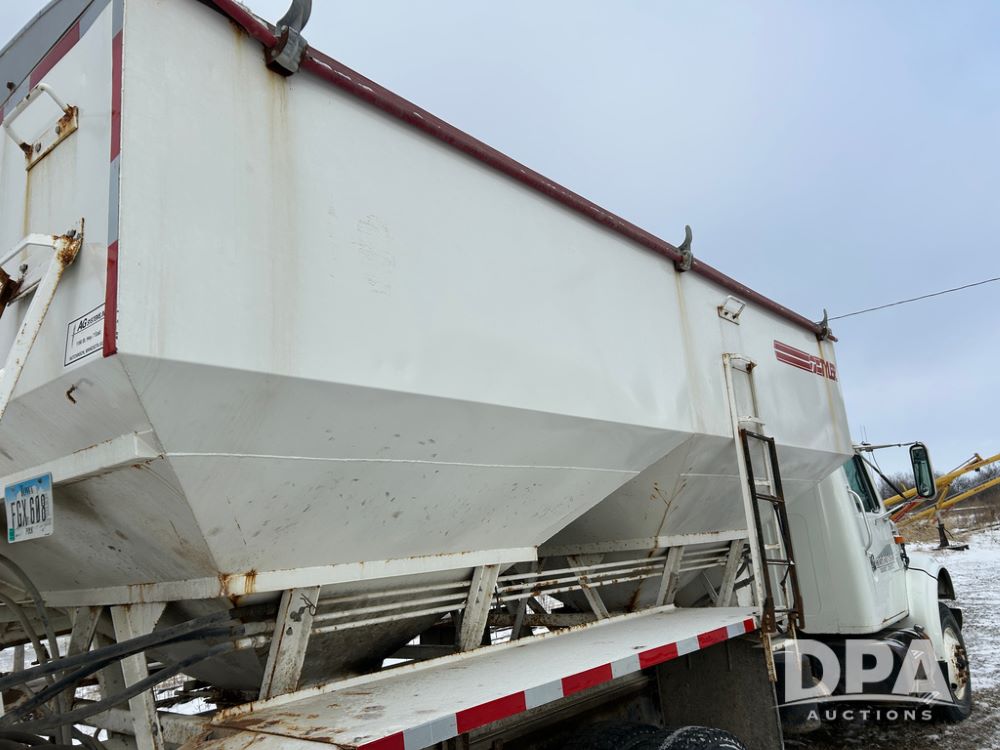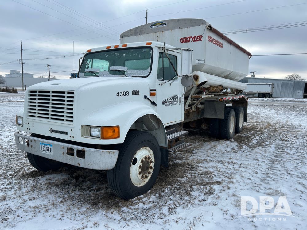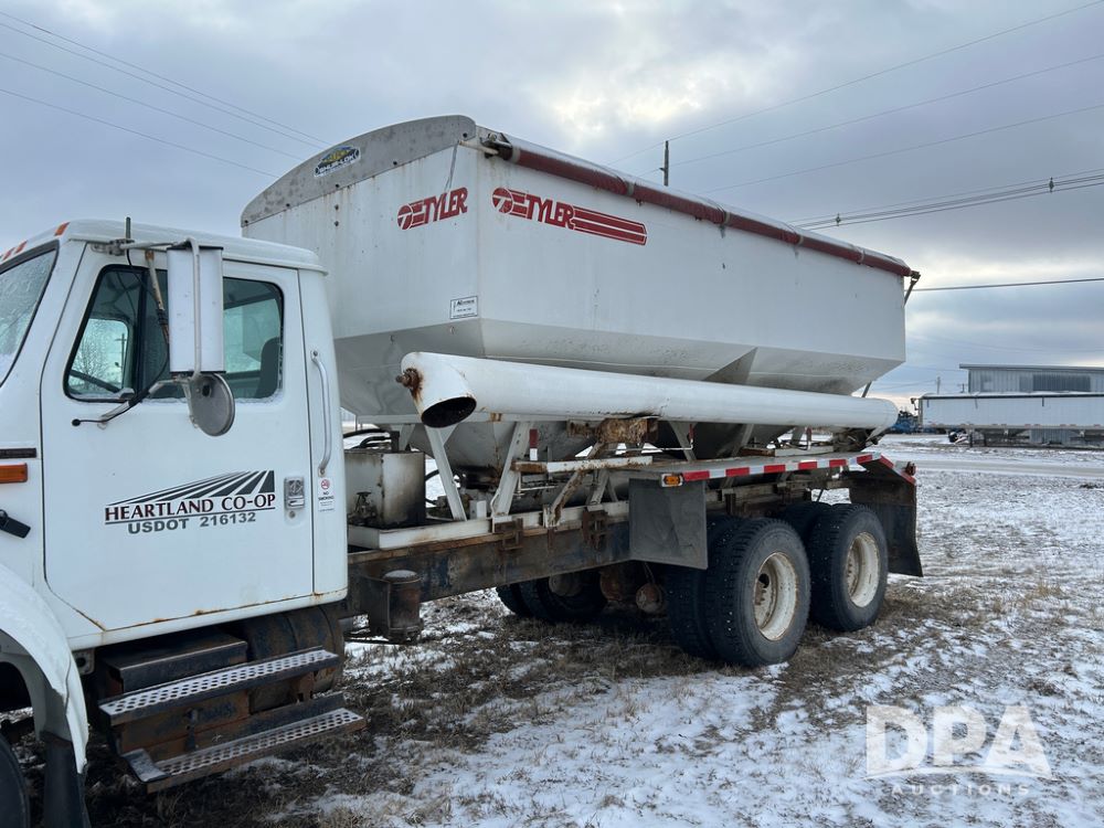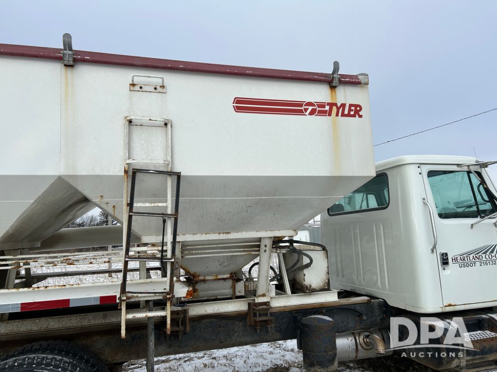 1995 International 4900 Dry Truck (CP1497, Unit 4303), NON RUNNER, DT466 diesel engine, 9 speed transmission, tandem axle full screw, Tyler stainless steel hydraulic 2 compartment dry tender box, side discharge auger, roll over tarp, cab heat/air conditioning, 22.5 tires, odometer reads 635,817 miles.