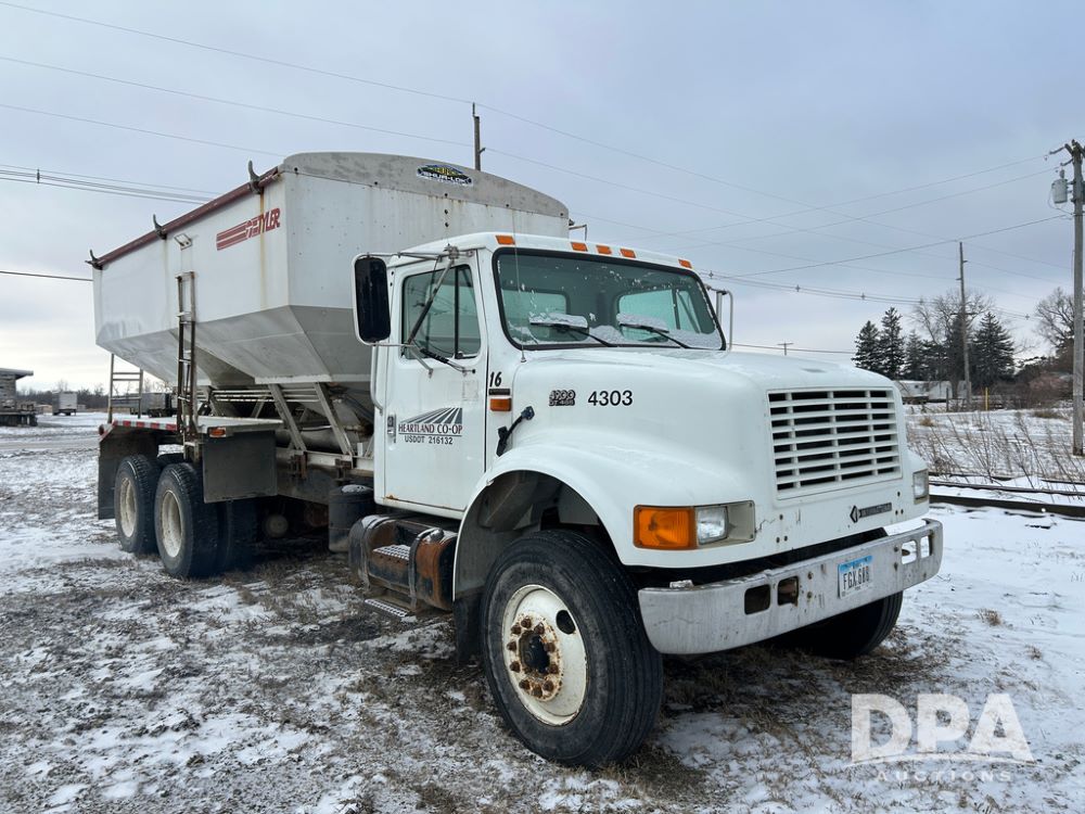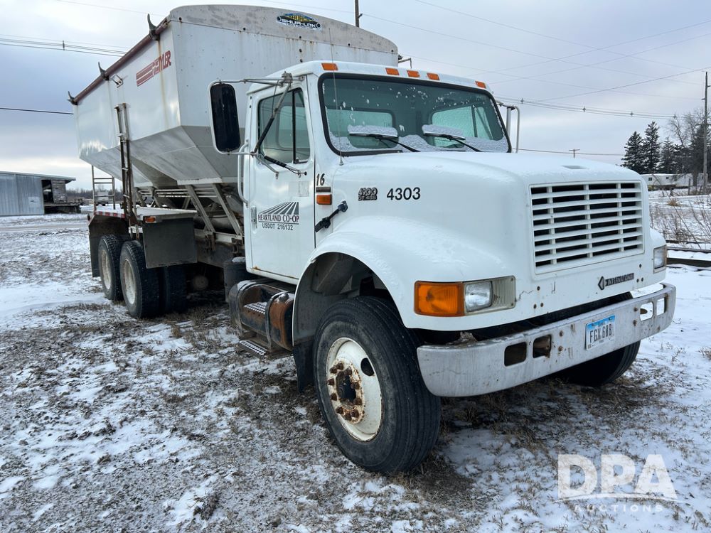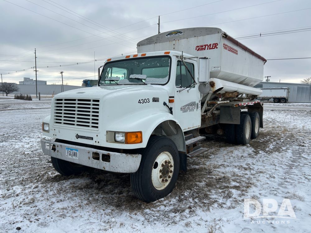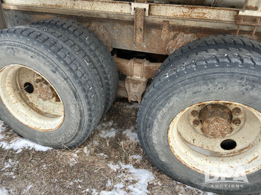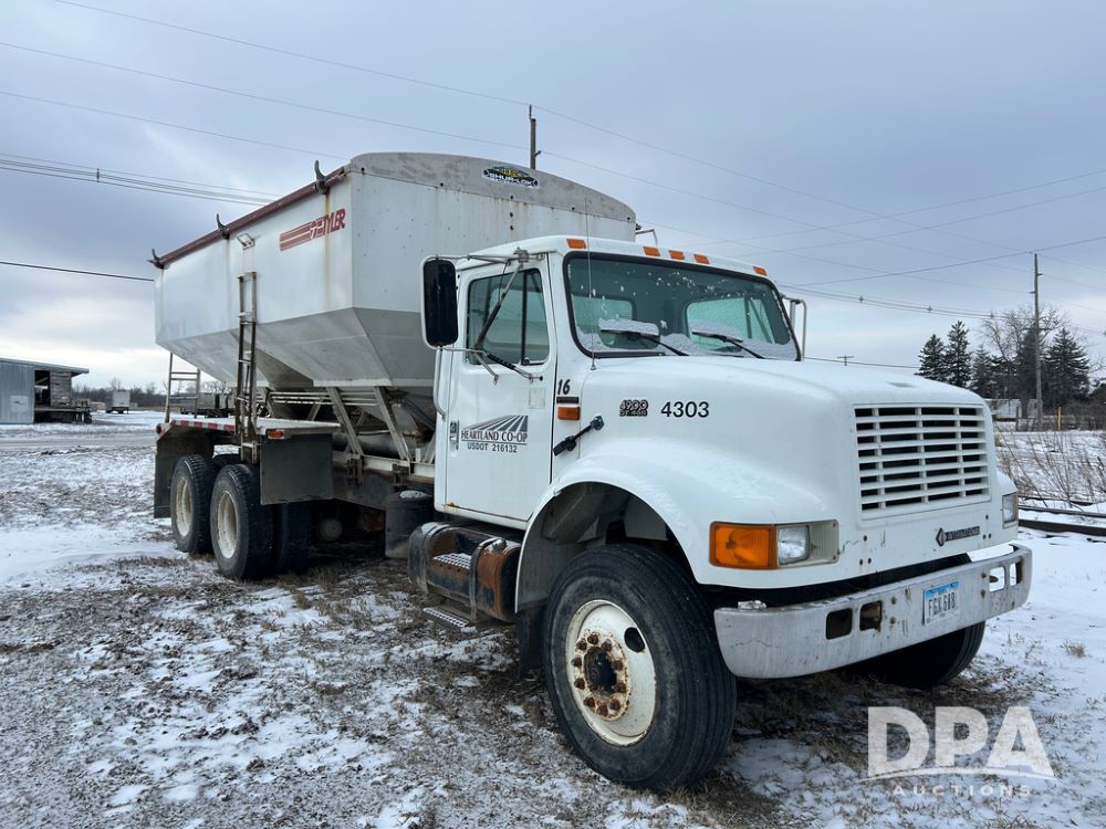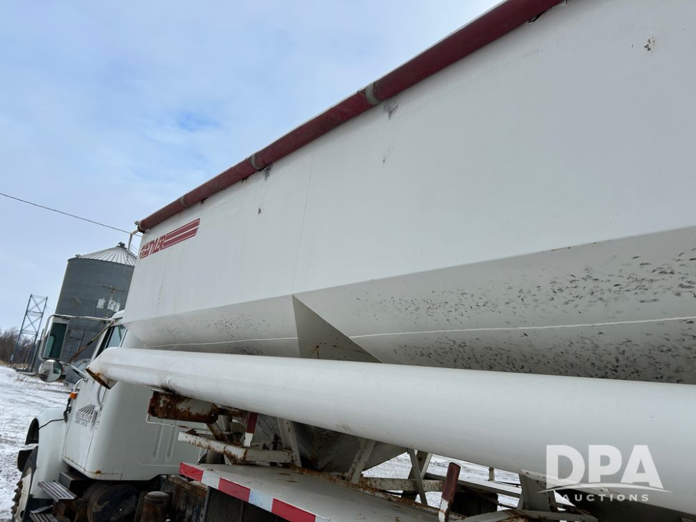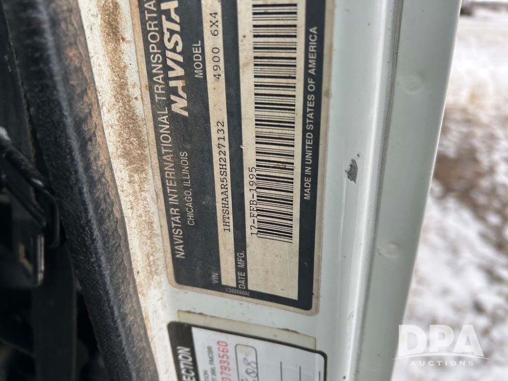 1995 International 4900 Dry Truck (CP1497, Unit 4303), NON RUNNER, DT466 diesel engine, 9 speed transmission, tandem axle full screw, Tyler stainless steel hydraulic 2 compartment dry tender box, side discharge auger, roll over tarp, cab heat/air conditioning, 22.5 tires, odometer reads 635,817 miles.