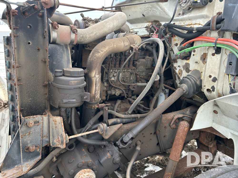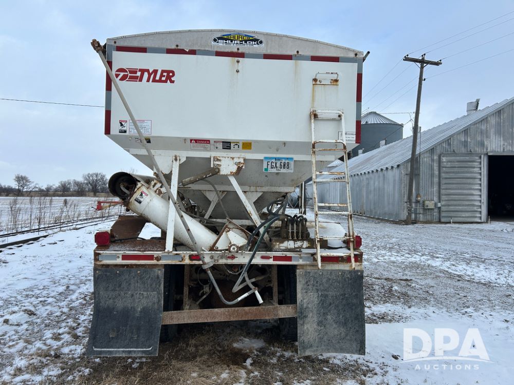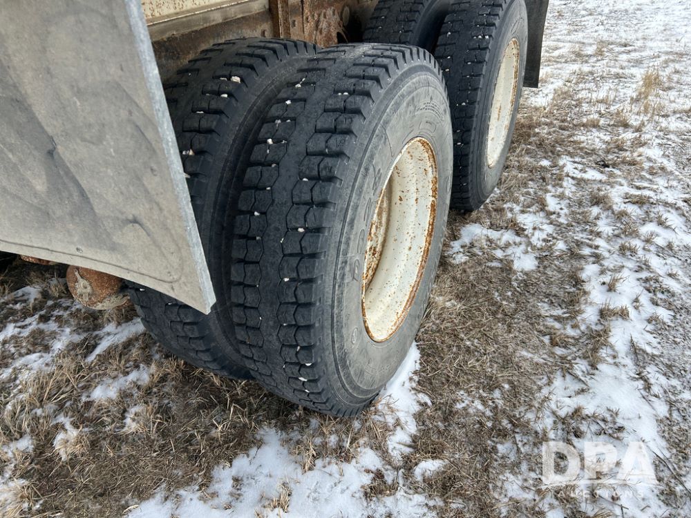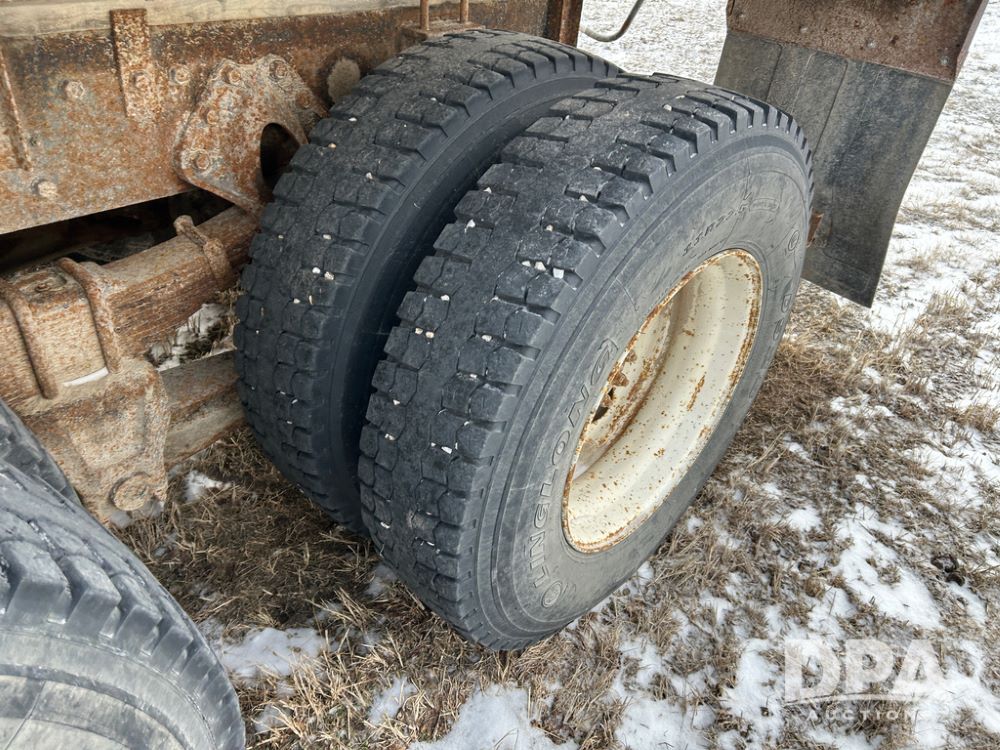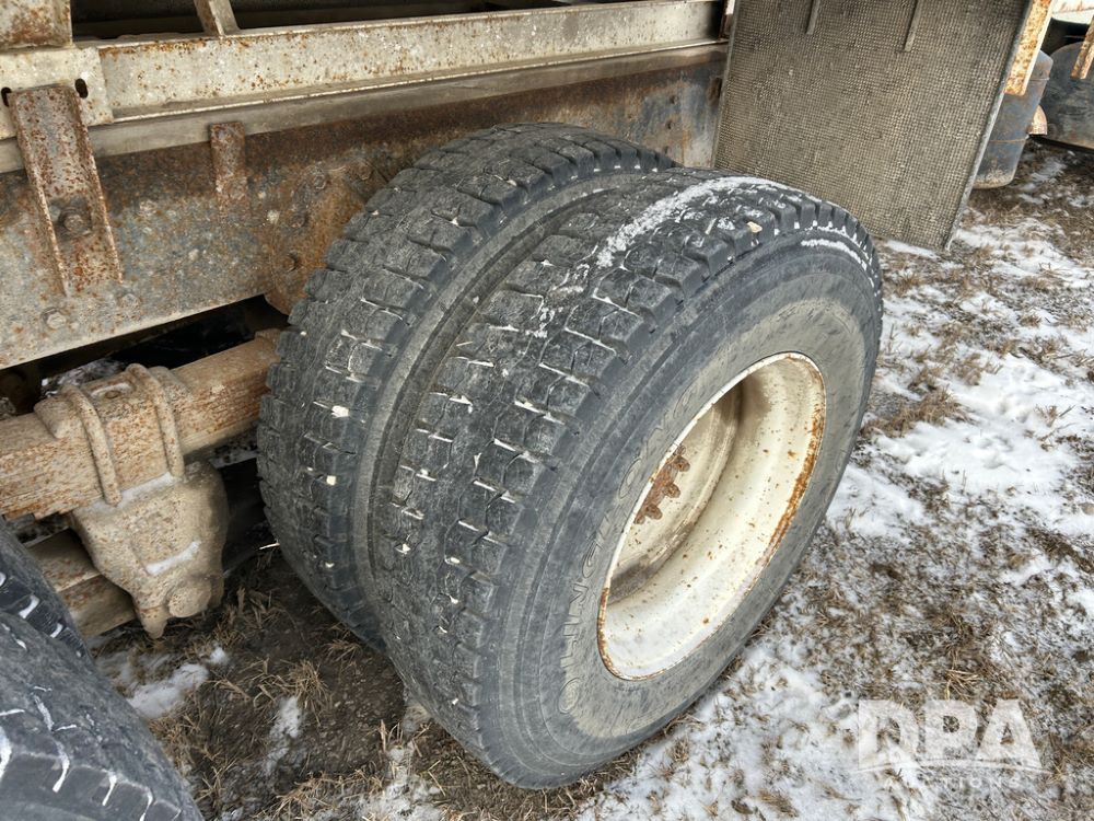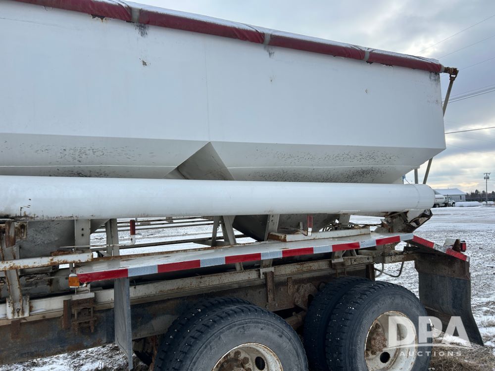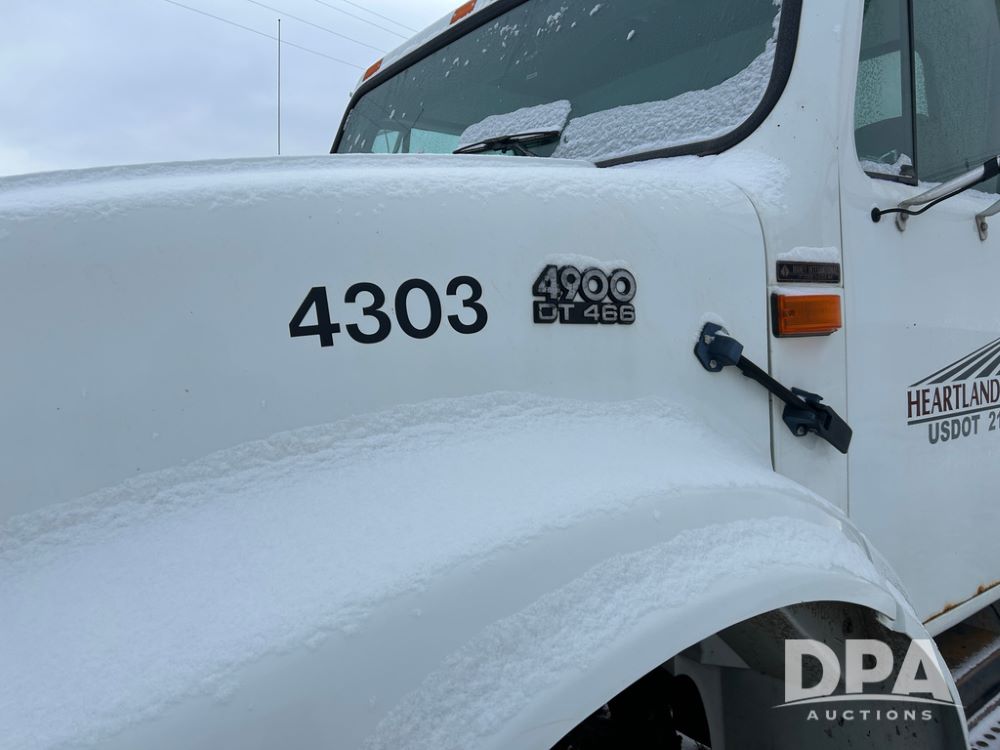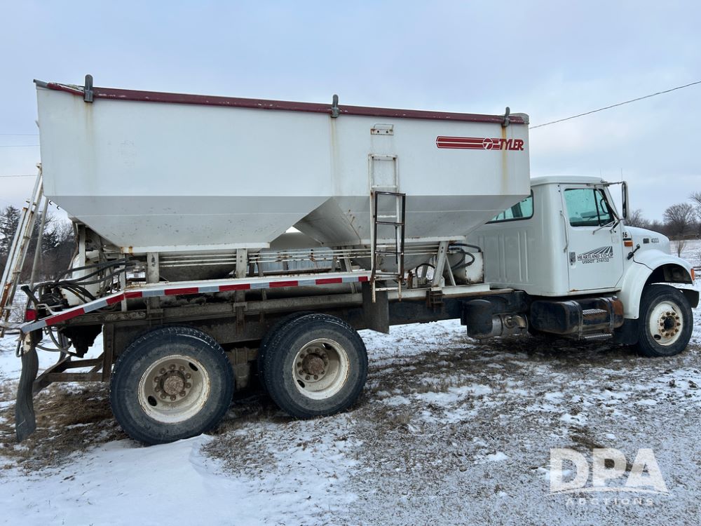 1995 International 4900 Dry Truck (CP1497, Unit 4303), NON RUNNER, DT466 diesel engine, 9 speed transmission, tandem axle full screw, Tyler stainless steel hydraulic 2 compartment dry tender box, side discharge auger, roll over tarp, cab heat/air conditioning, 22.5 tires, odometer reads 635,817 miles.