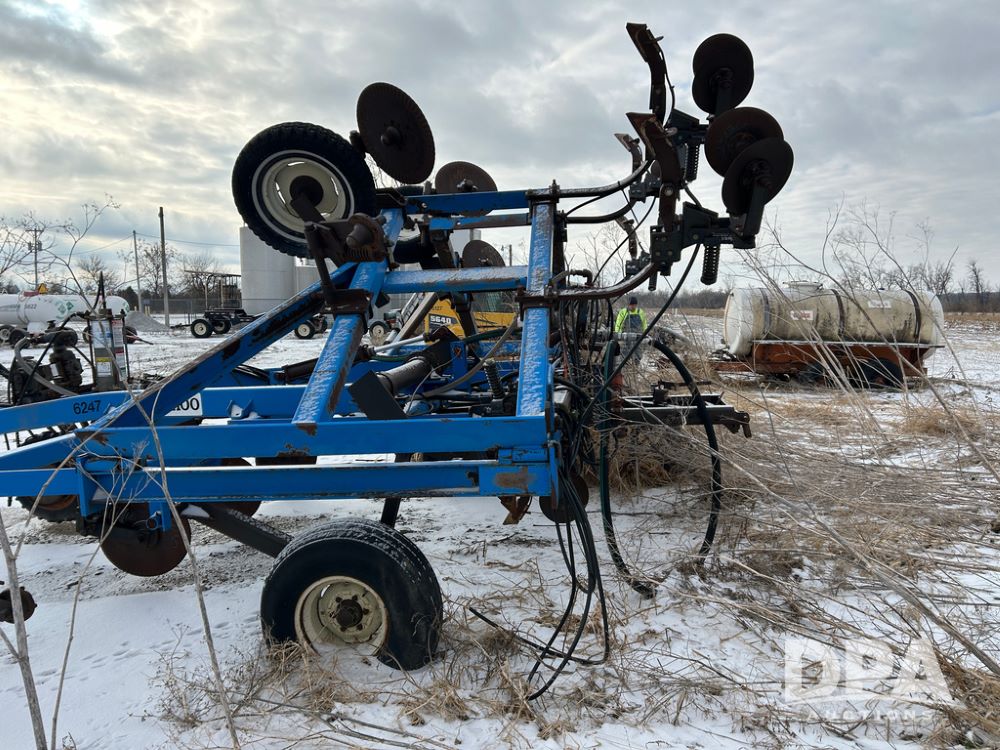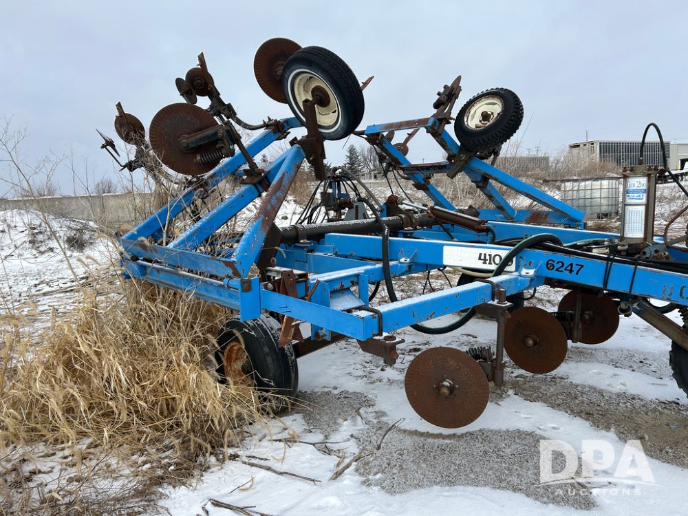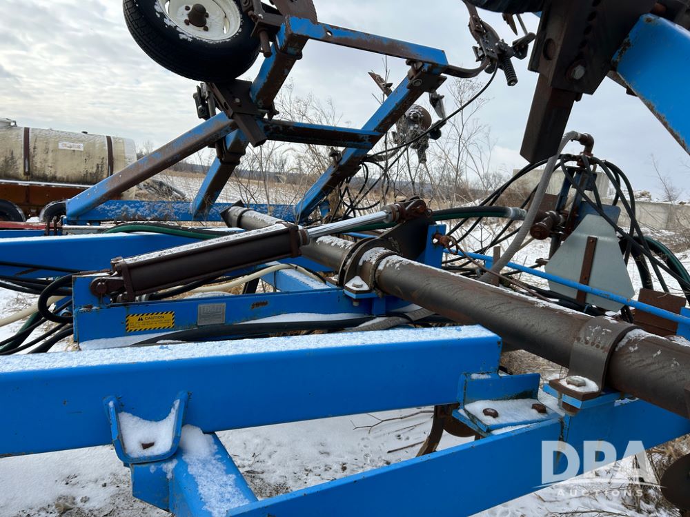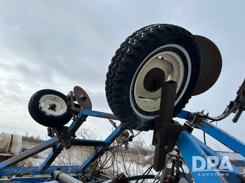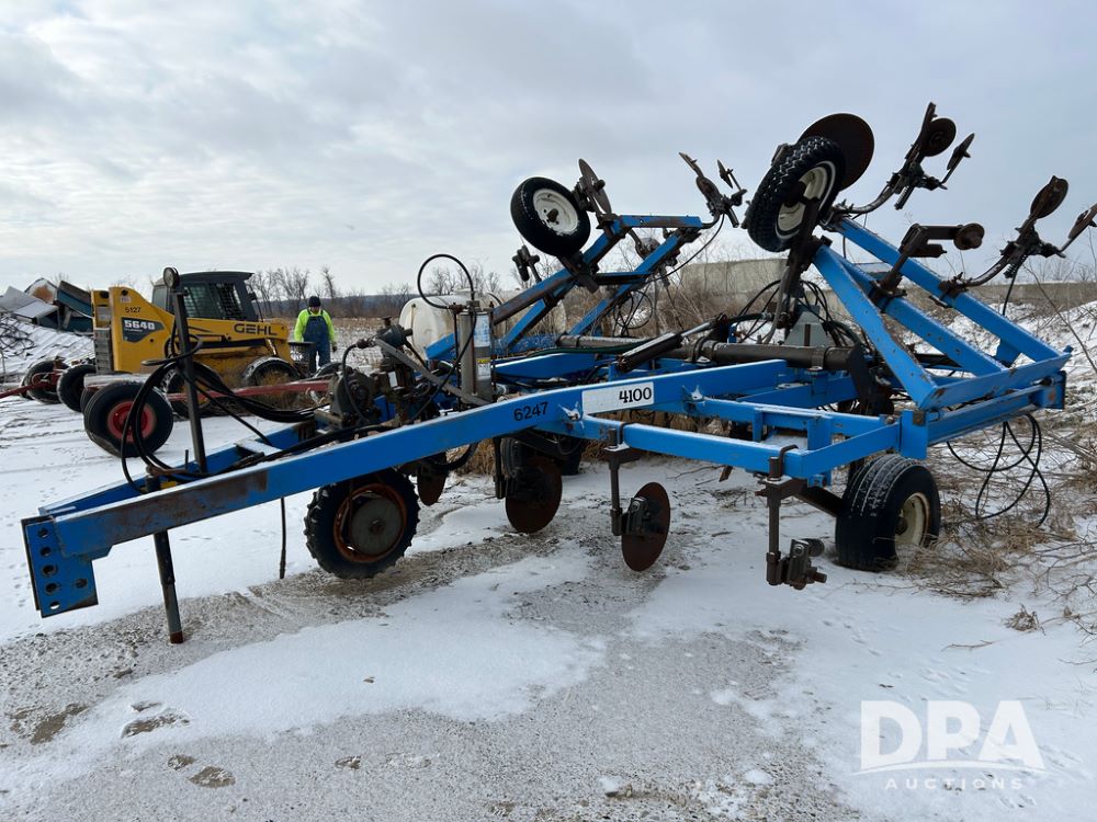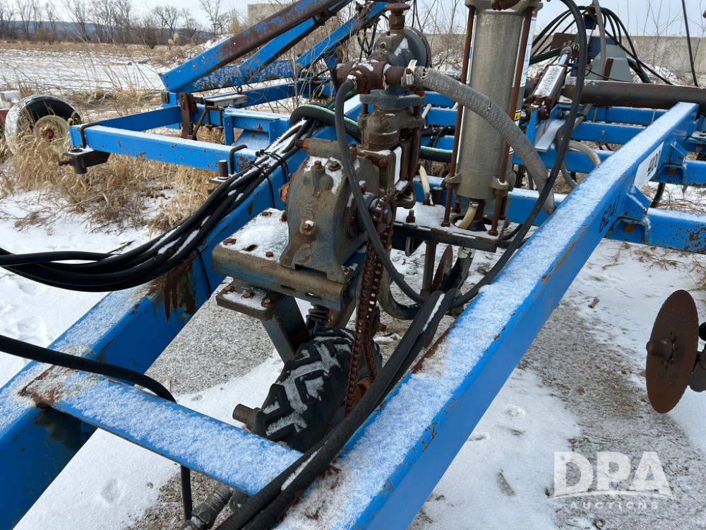 DMI 4100 Tool Bar (CP1501, Unit 6247), front coulters, a couple are missing, double disc rear sealers, ground drive pump, hydraulic wings, manual gauge wheels.