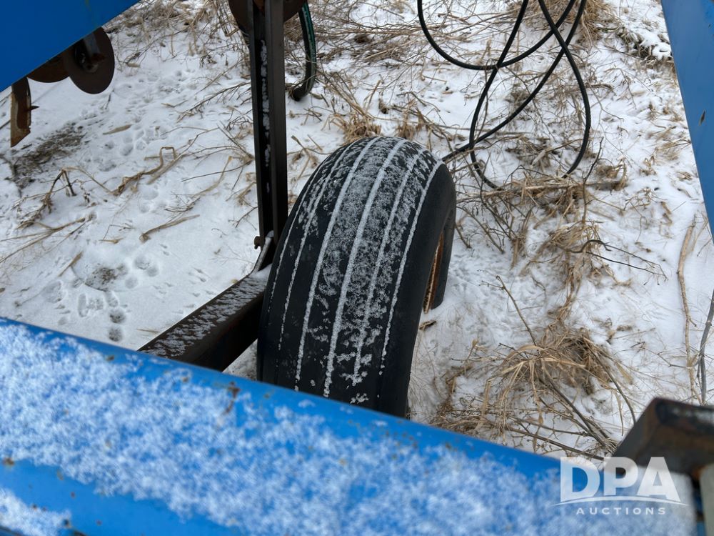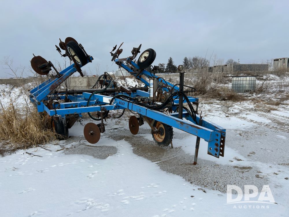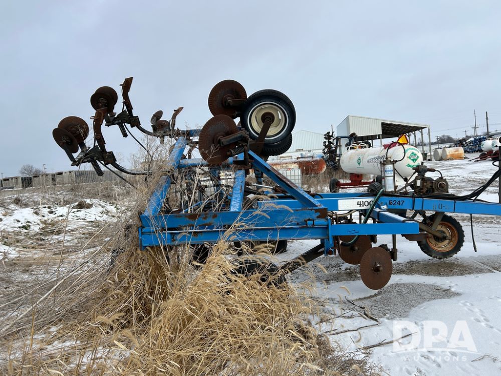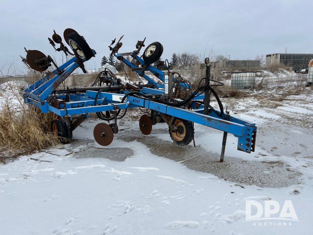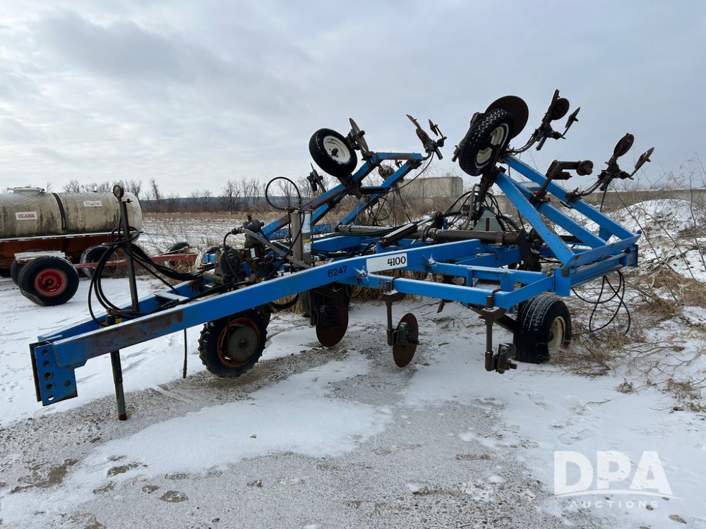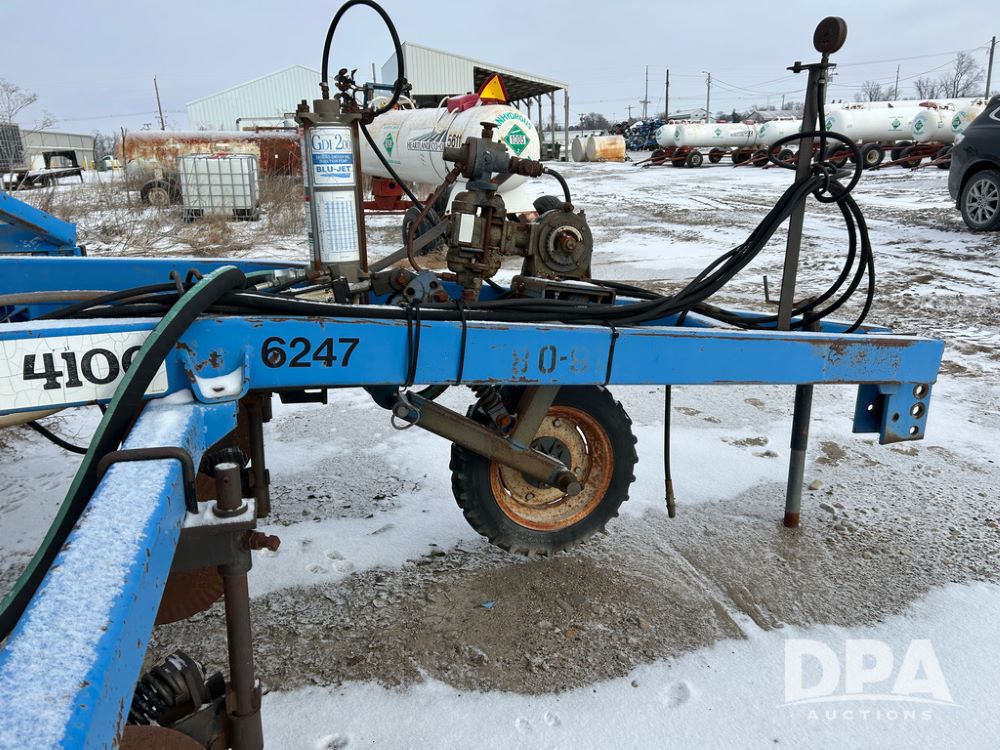 DMI 4100 Tool Bar (CP1501, Unit 6247), front coulters, a couple are missing, double disc rear sealers, ground drive pump, hydraulic wings, manual gauge wheels.