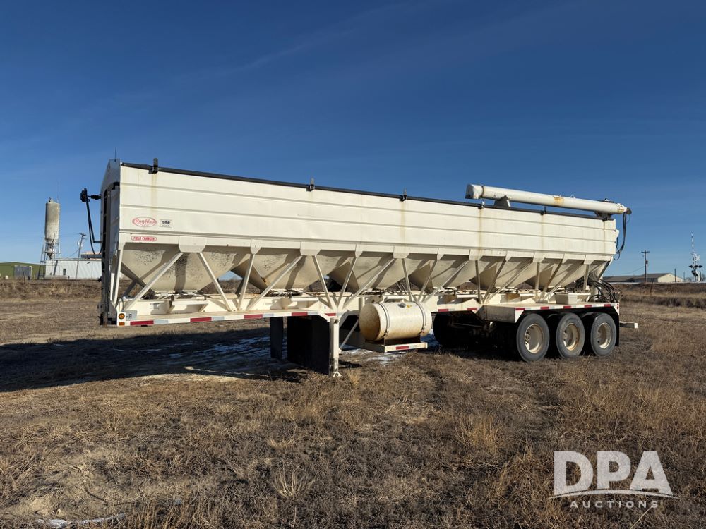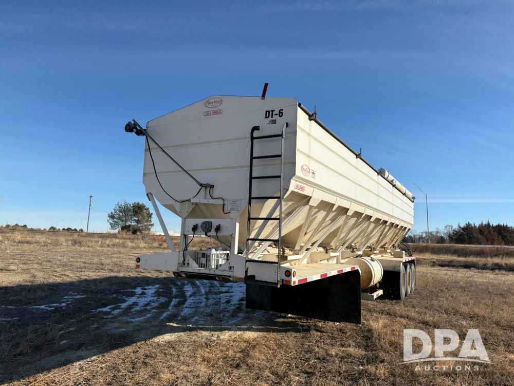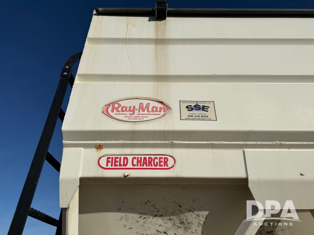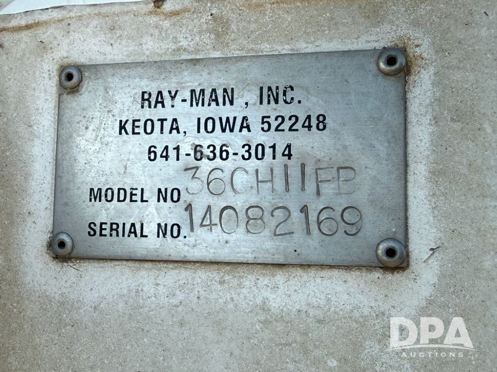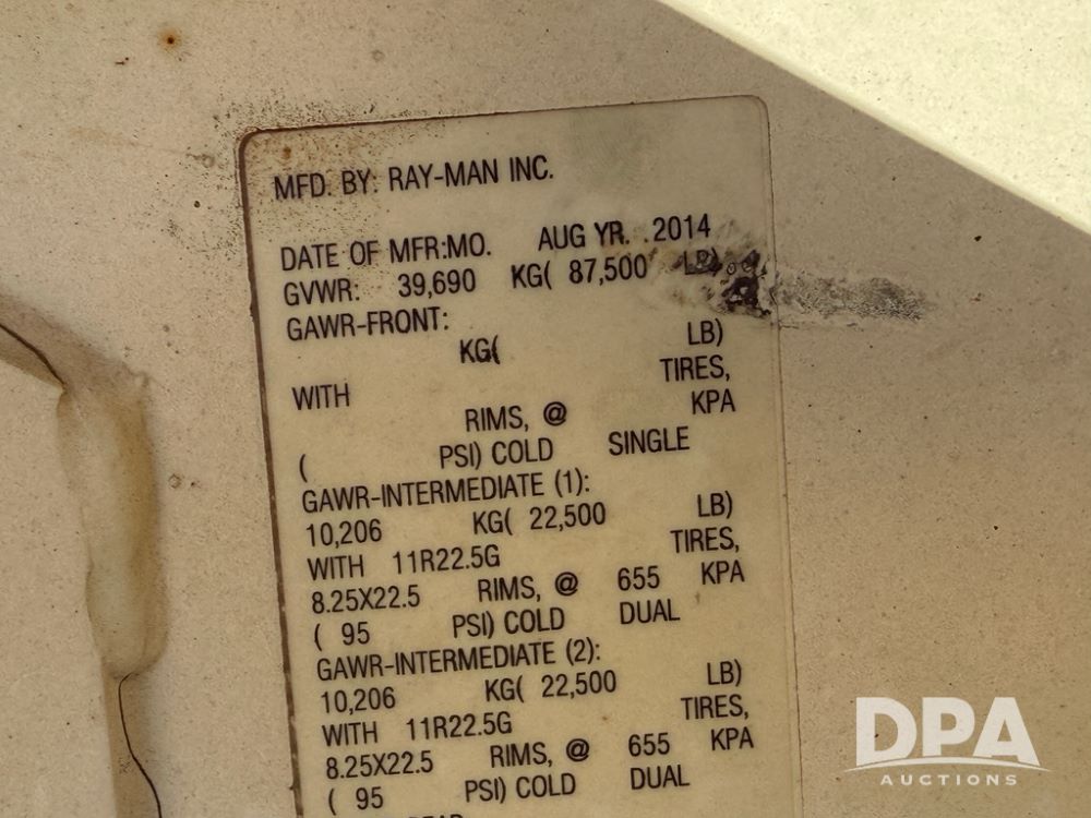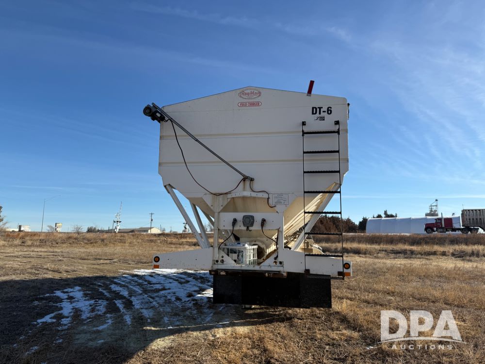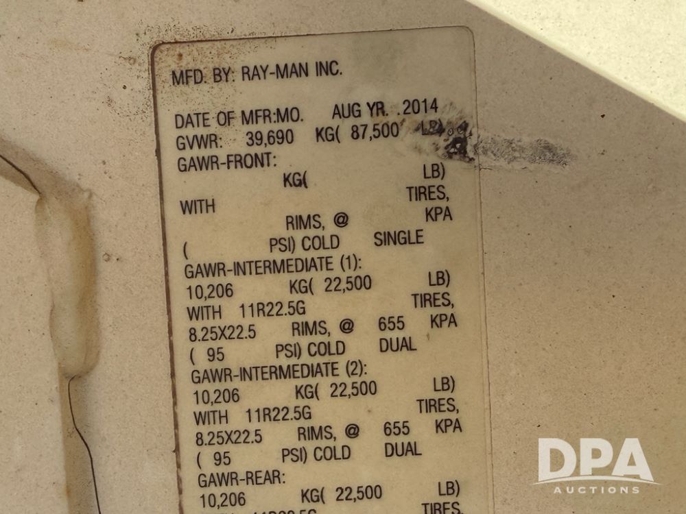 2014 Ray-Man Field Charger Dry Tender Trailer (NP6438, Unit DT-6), Ray-Man Model 36CHIIFB dry tender box (S/N 14082169), approx. 36 ton capacity, hydraulic, Cummins B3.3 diesel engine (74 HP gross rated), electric start, shows 1,621 hours, overhead auger, electric roll tarp, triple axle, spring suspension, Haldex ABS, Holland landing gear, front/rear ladder, 11R22.5 tires, GVWR 87,500 pounds.