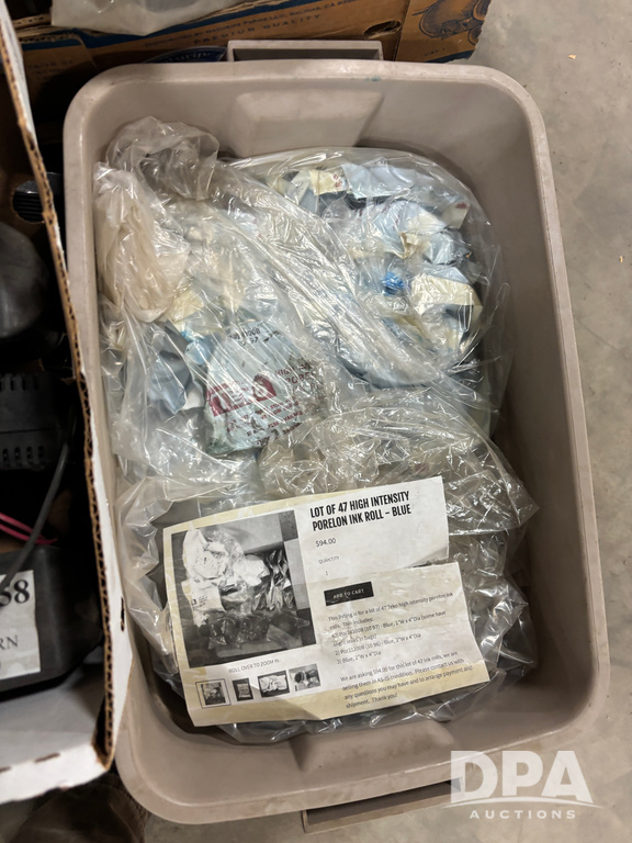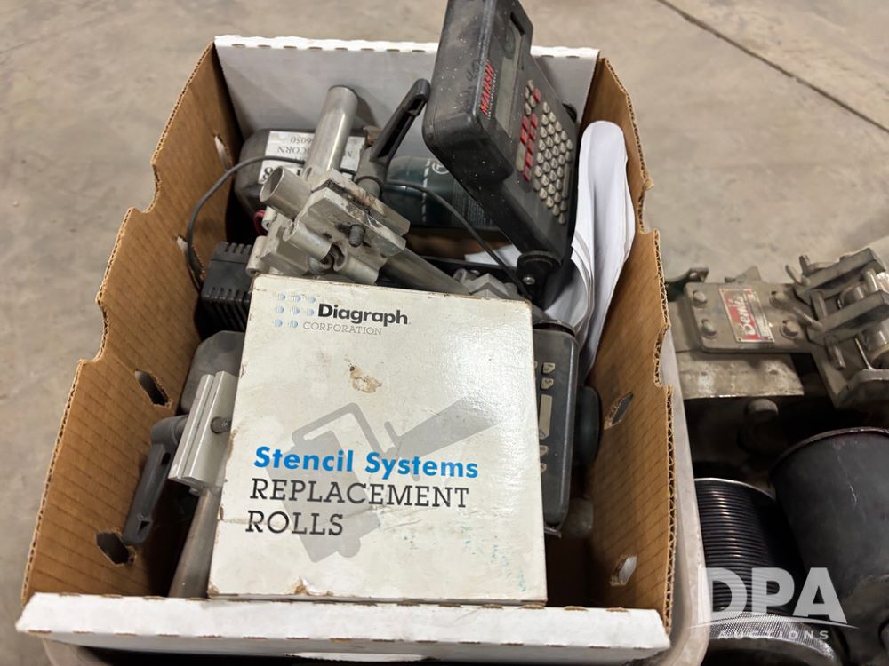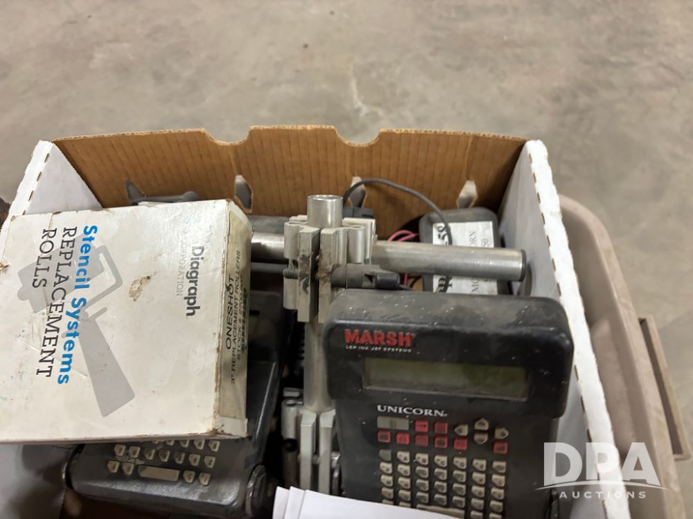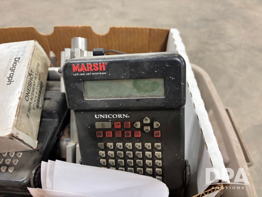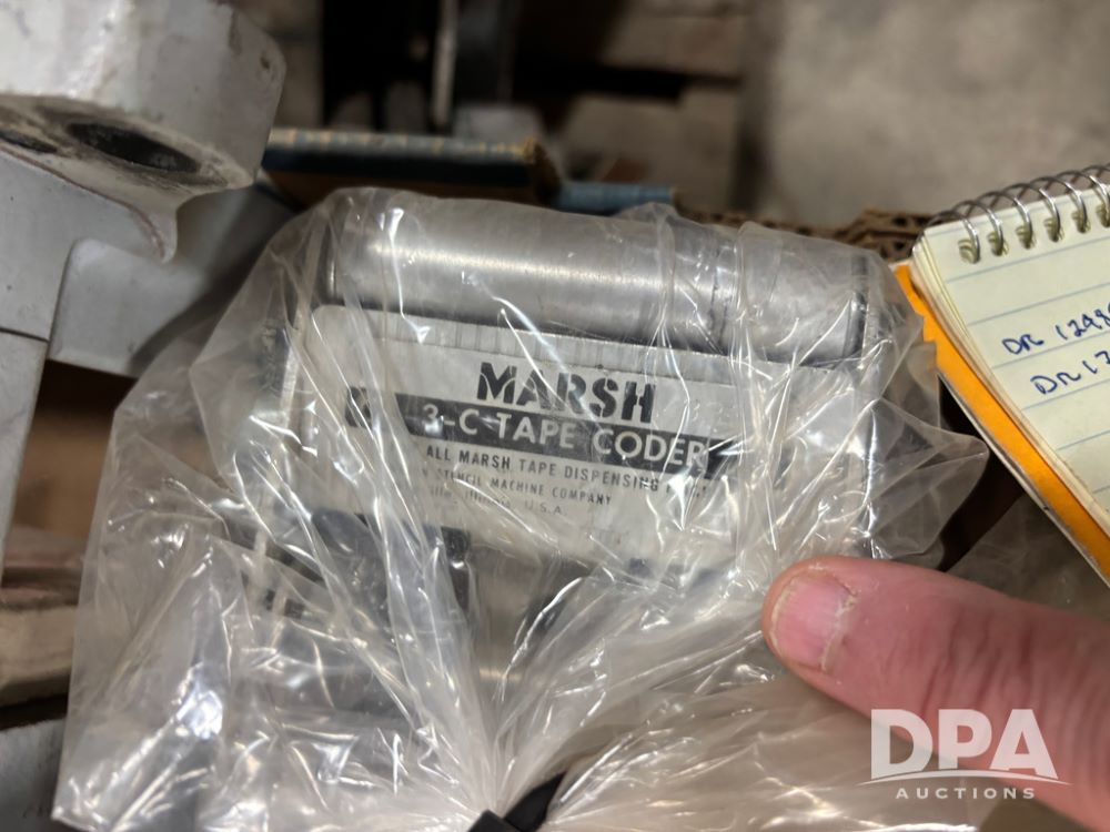 Fischbein Bag Coders (DR13000 P17A), 3-model A5325 Fischbein bag top coders w/gear motors, 2-#1 roll coders, Marsh tape coder, Bemis coder, 3-assorted coders, 17- print wheels, Rings rubber and metal Dilok, 47- high intensity Porelon blue ink rolls, 2-Marsh LCP inkjet system printers, all sell as single lot.