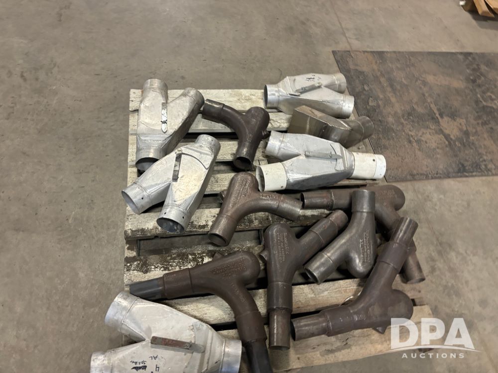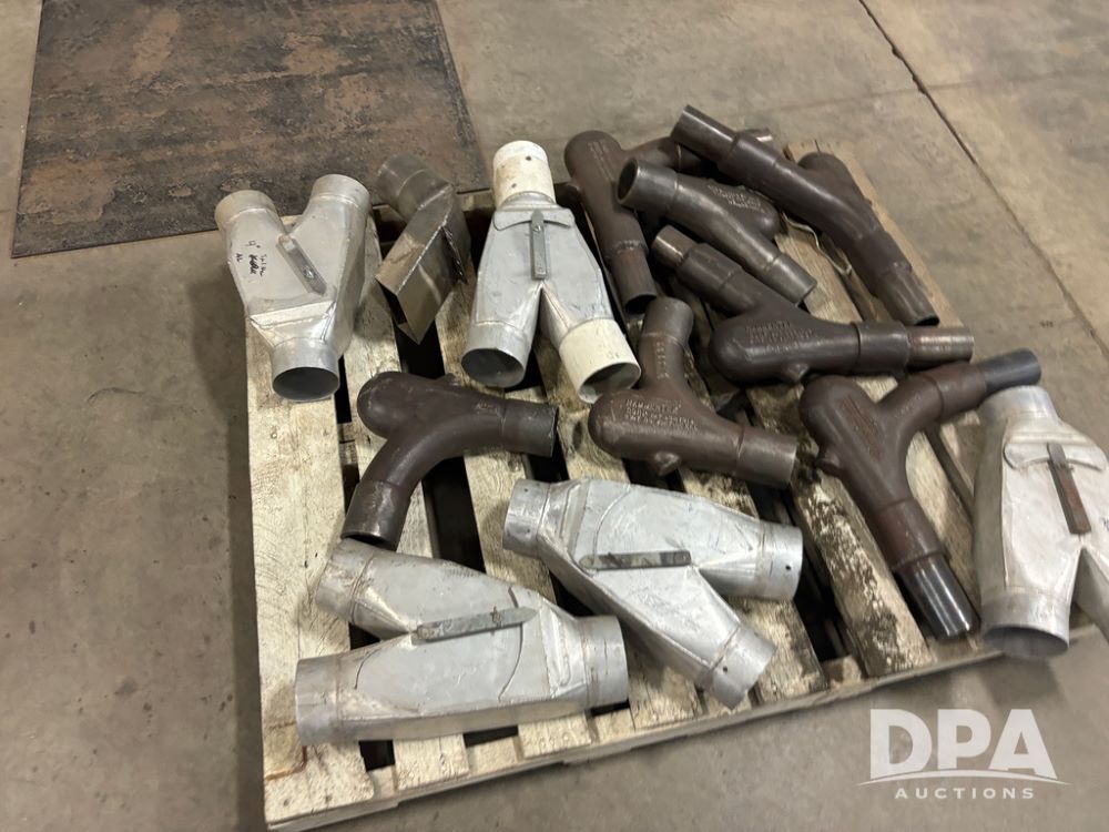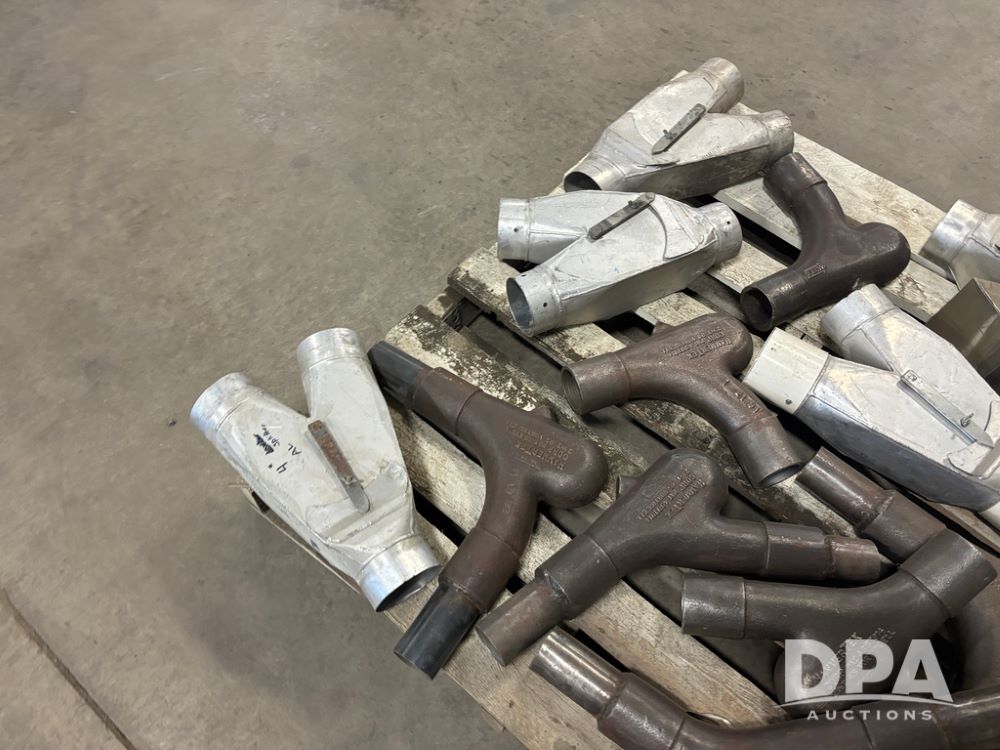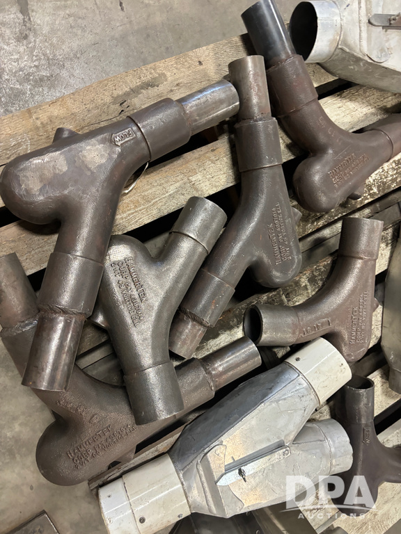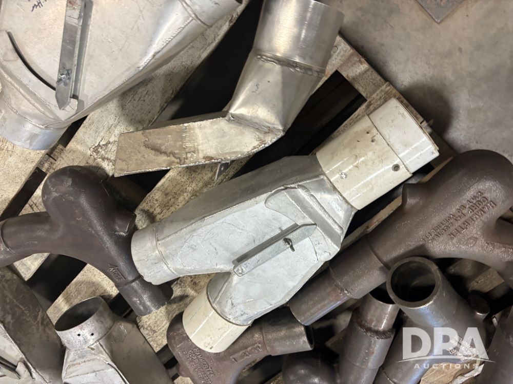 Hammertek Elbows (DR13009 P41A), pallet lot has 3-Hammertek 2.5'' 45 degree ductile cast iron elbows, 4-90 degree, and 5-aluminum 4'' diverters left and right hand openings.