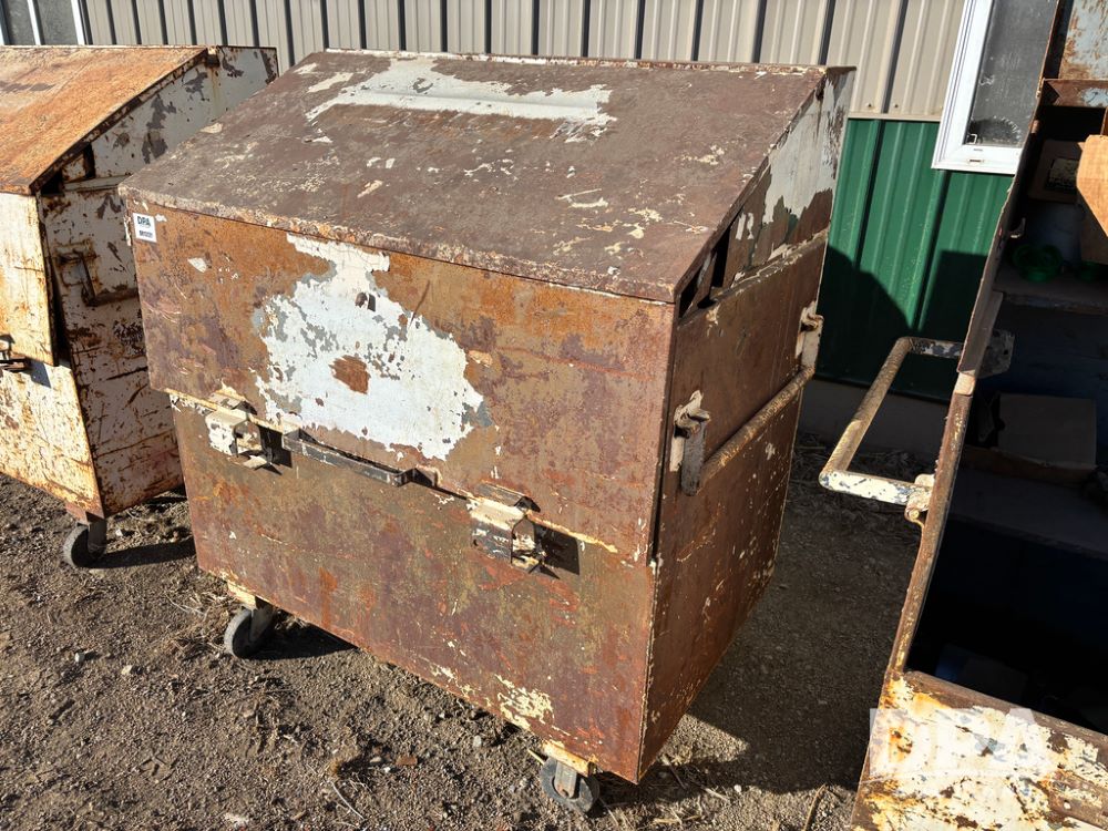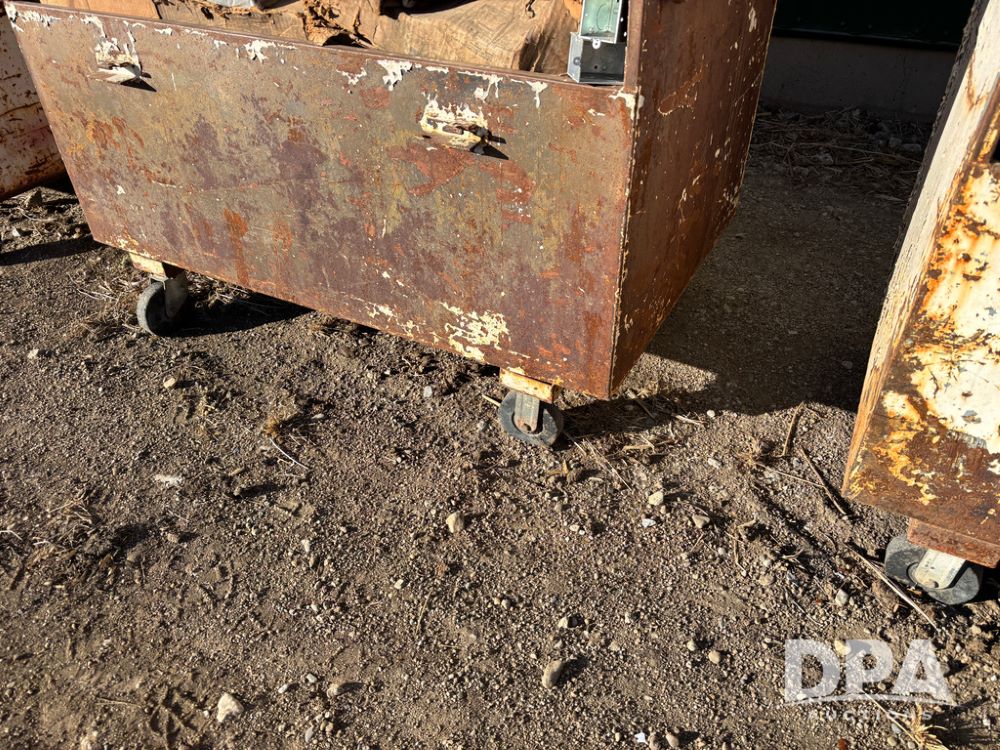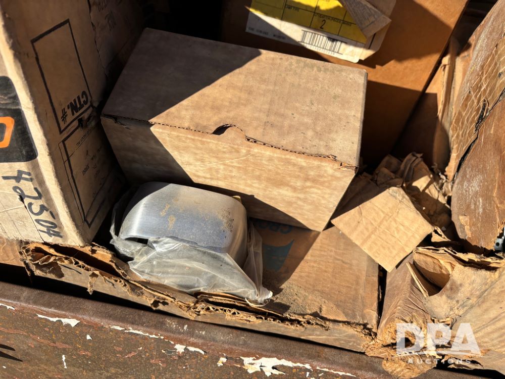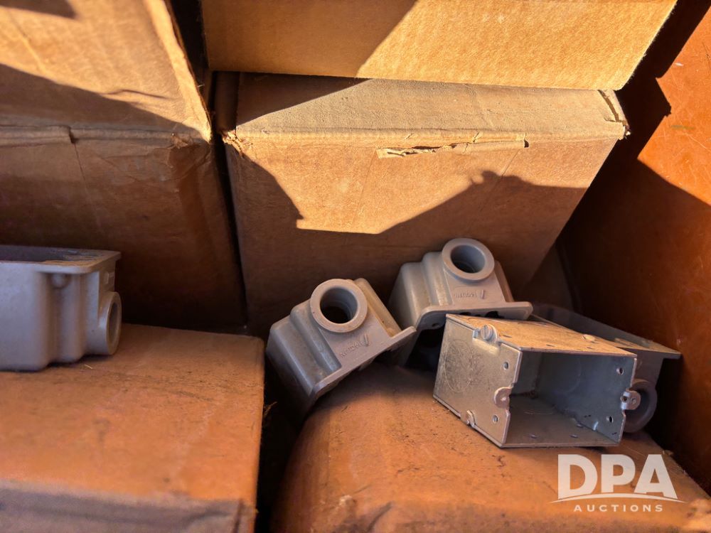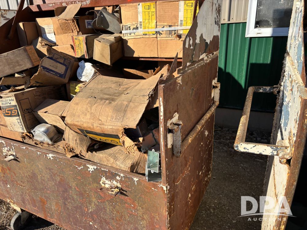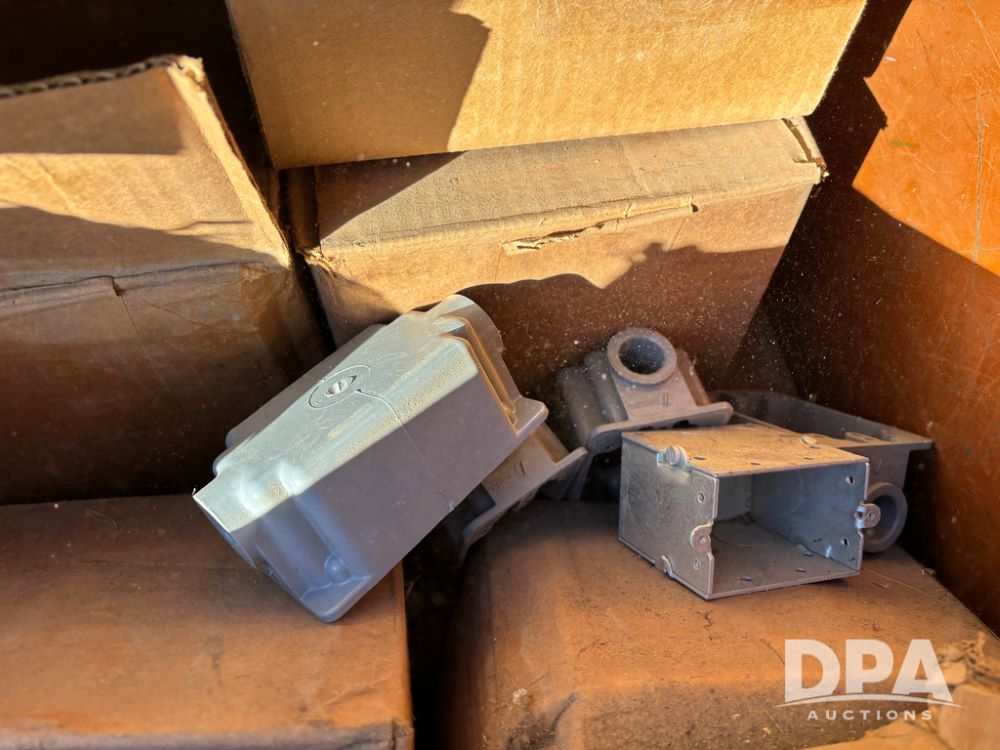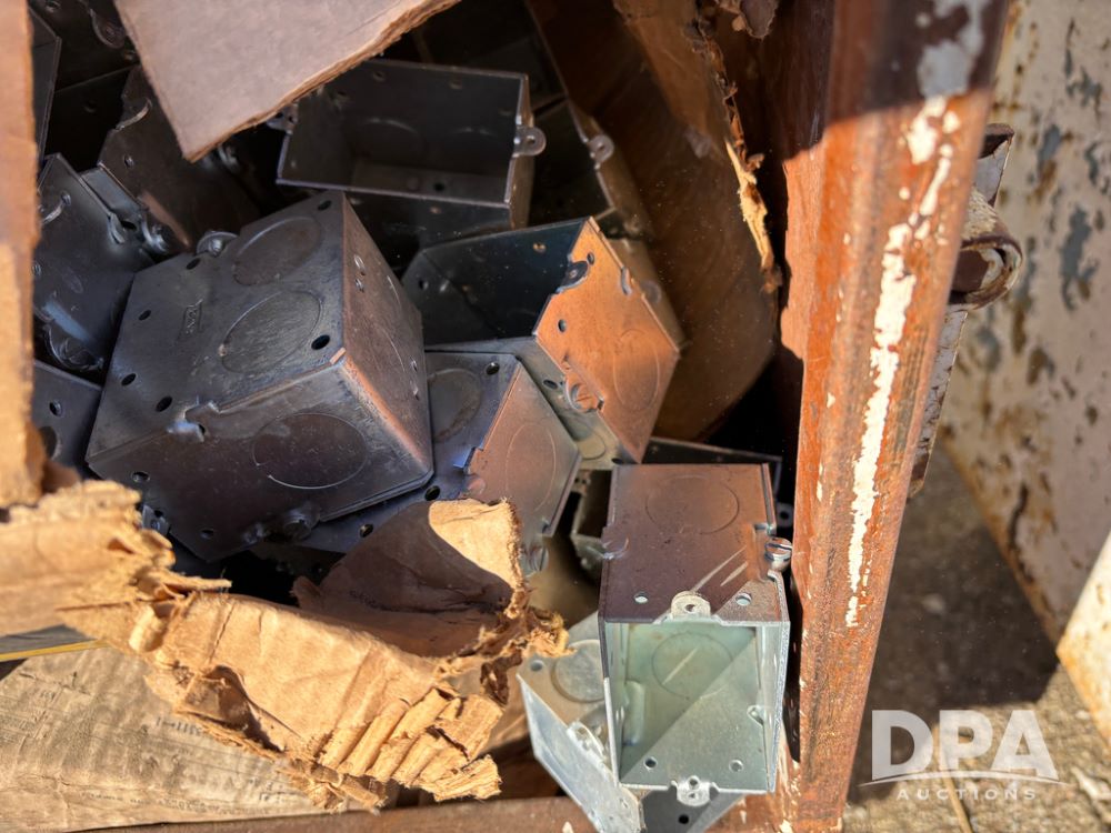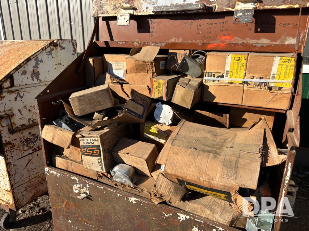 Job Box Of New Parts (DR13121), enclosed caster wheel job box full of electrical equipment, can lights and equipment, conduit juctions, and lots of steel wall boxes.