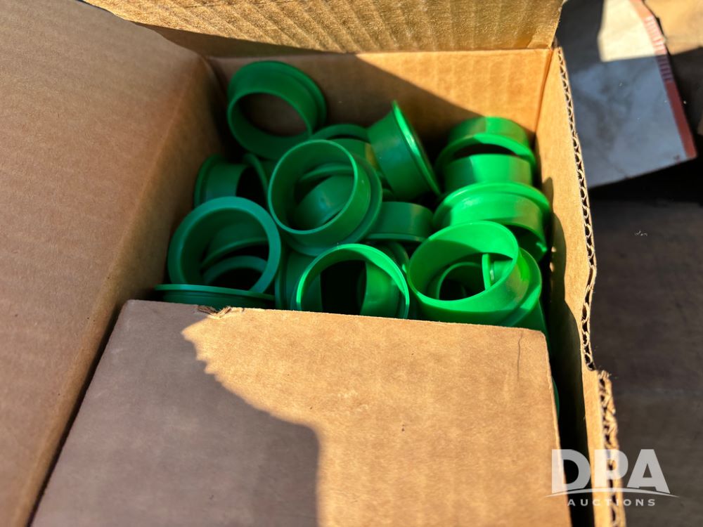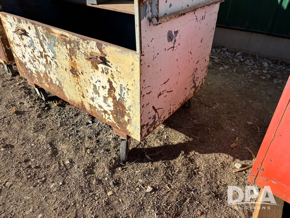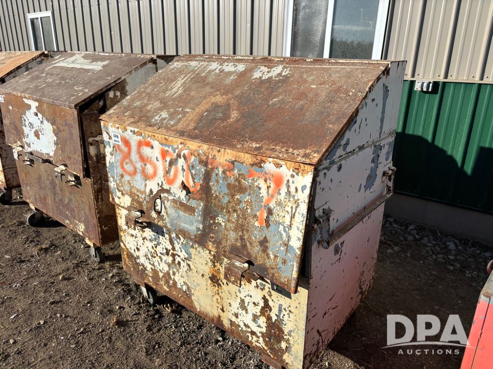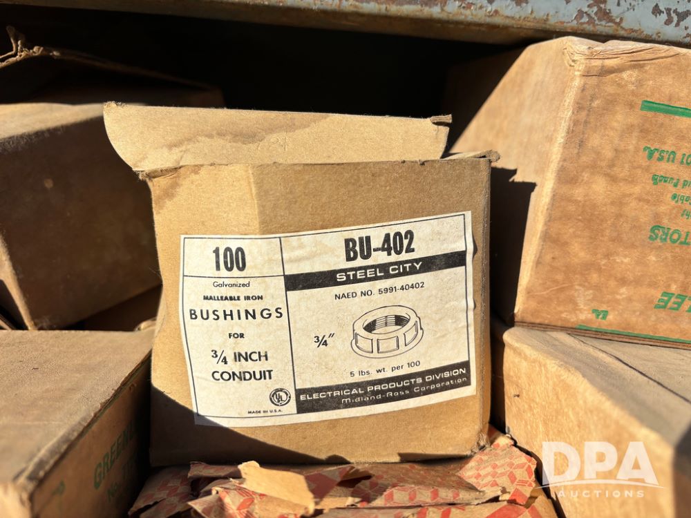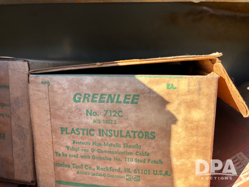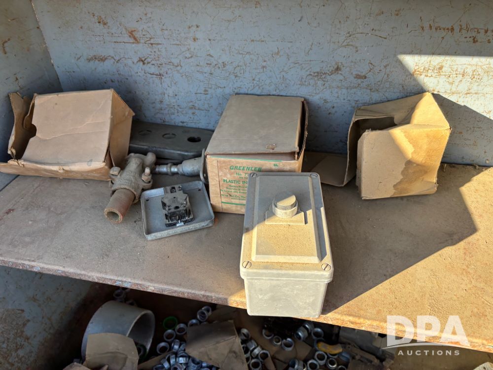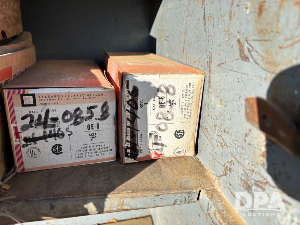 Job Box Of New Parts (DR13122), enclosed caster wheel job box full of electrical equipment, plastic insulators and box nuts.