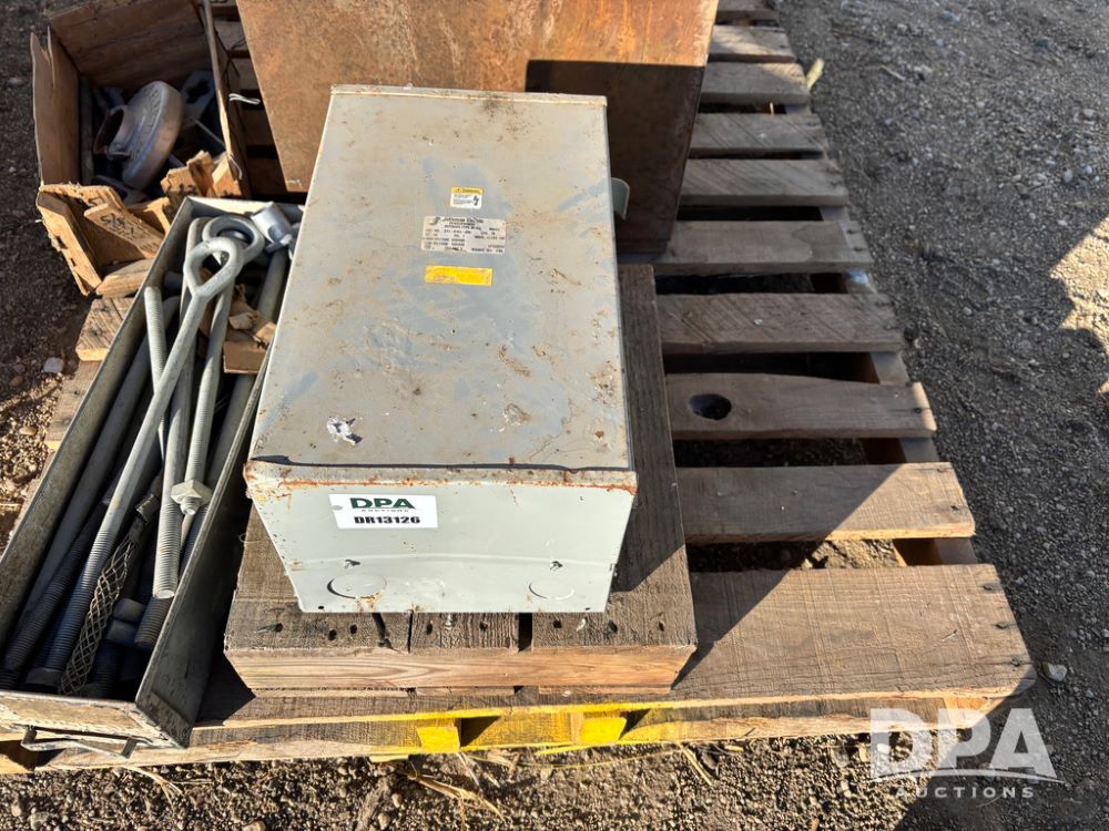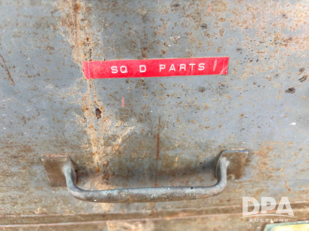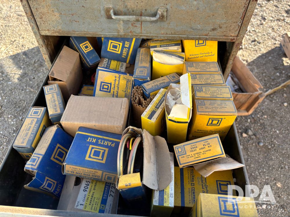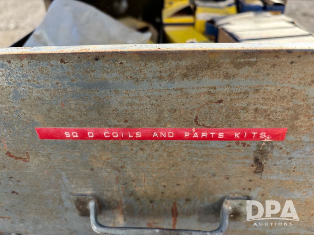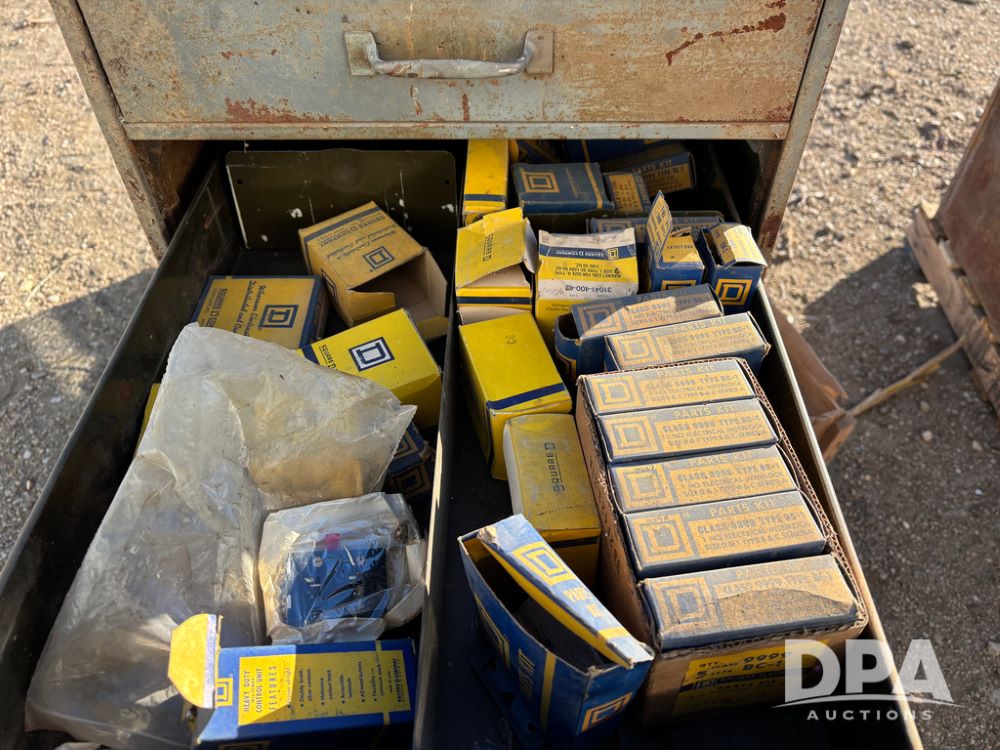 Pallet of Electrical Parts (DR13126), pallet of electrical parts has 2 step down transformers, file cabinet full of Square D contacts and starters.