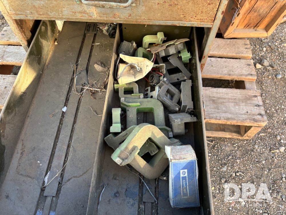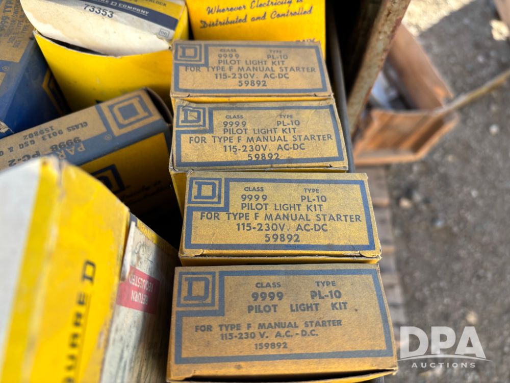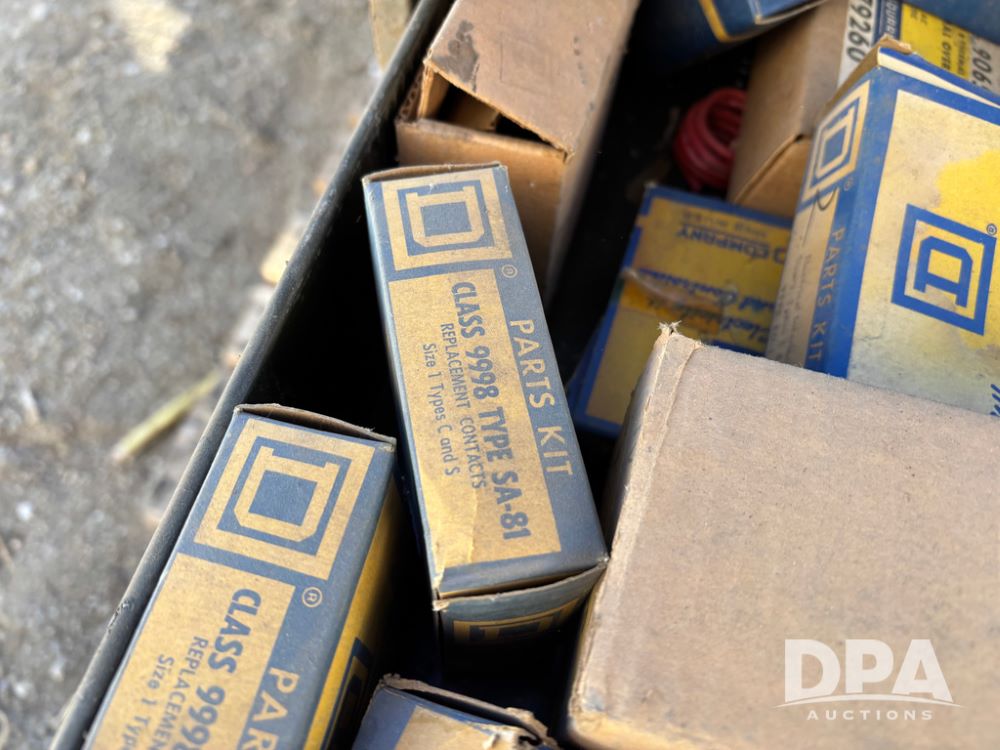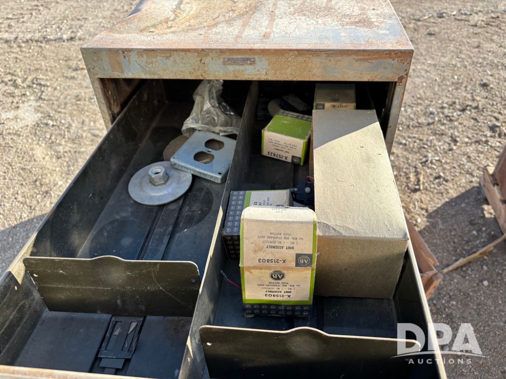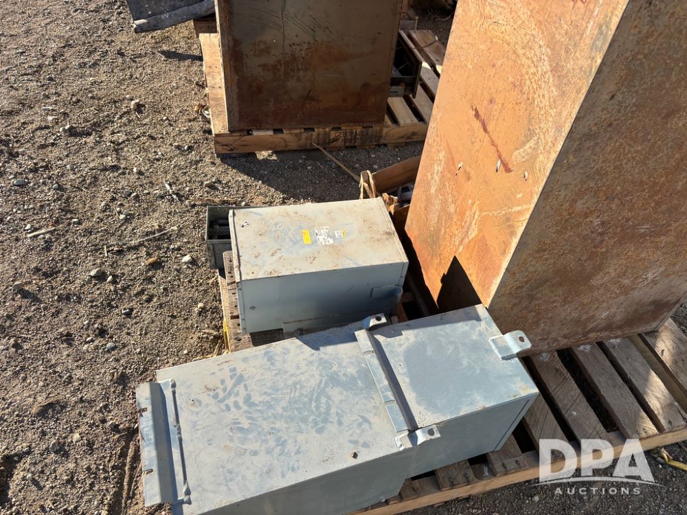 Pallet of Electrical Parts (DR13126), pallet of electrical parts has 2 step down transformers, file cabinet full of Square D contacts and starters.