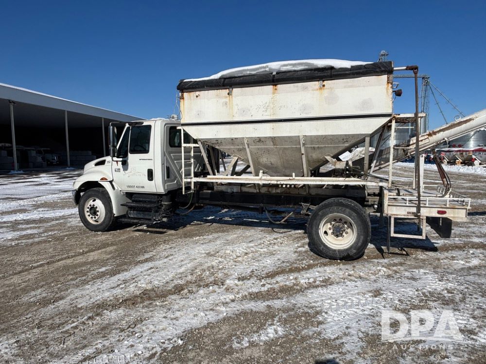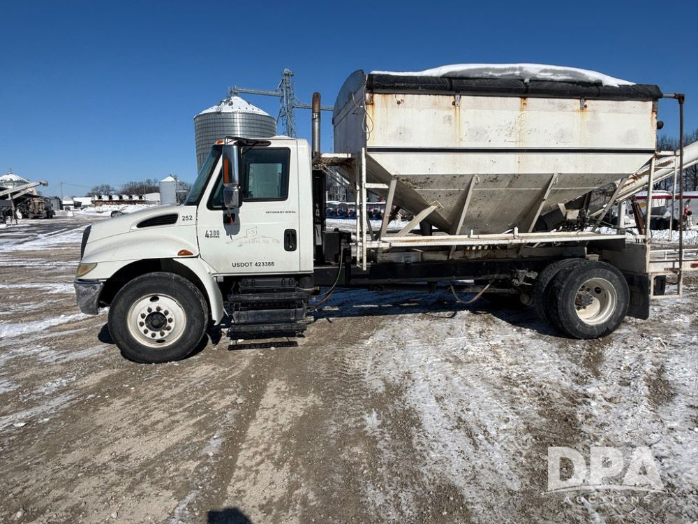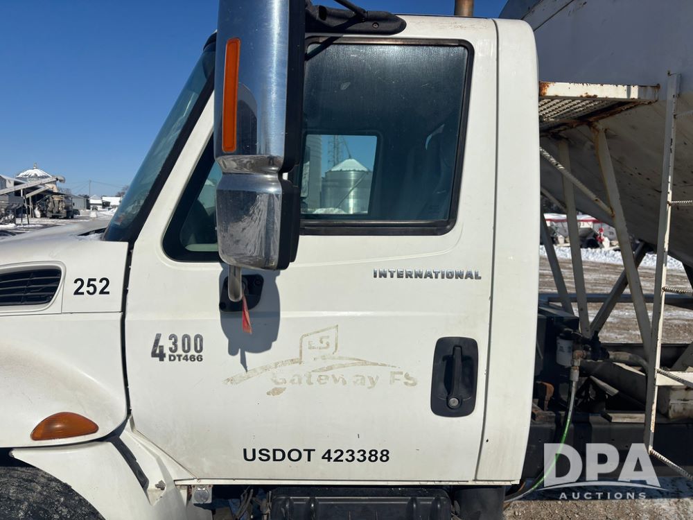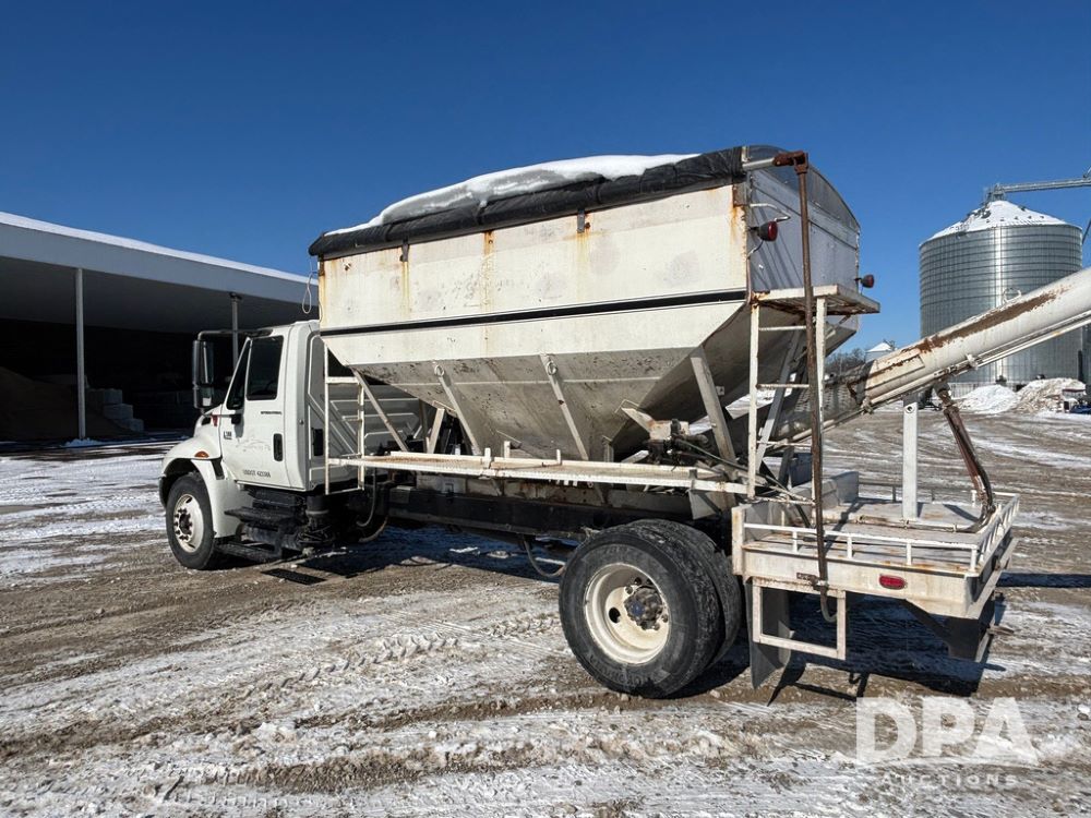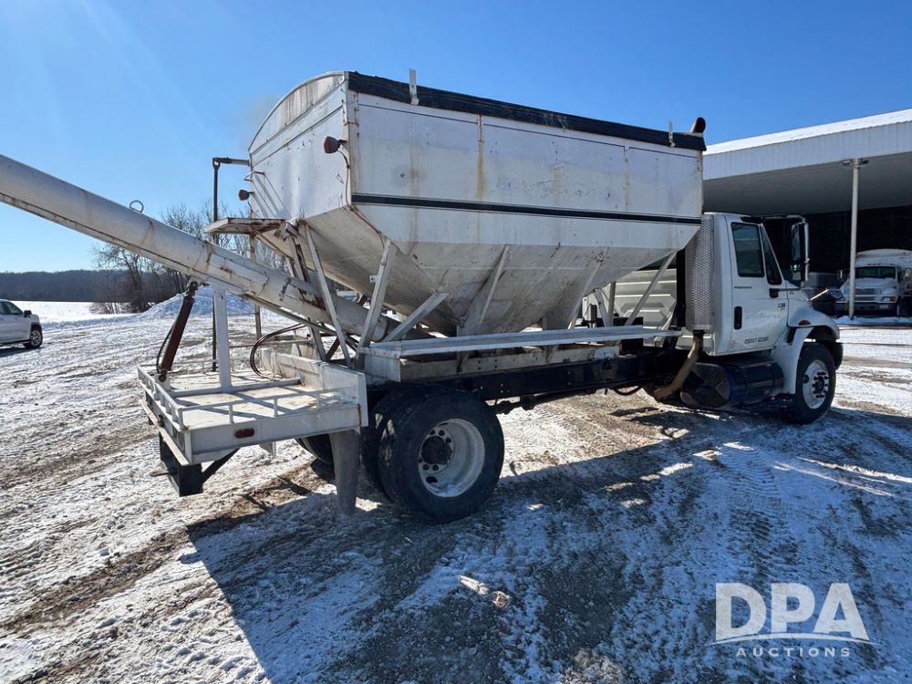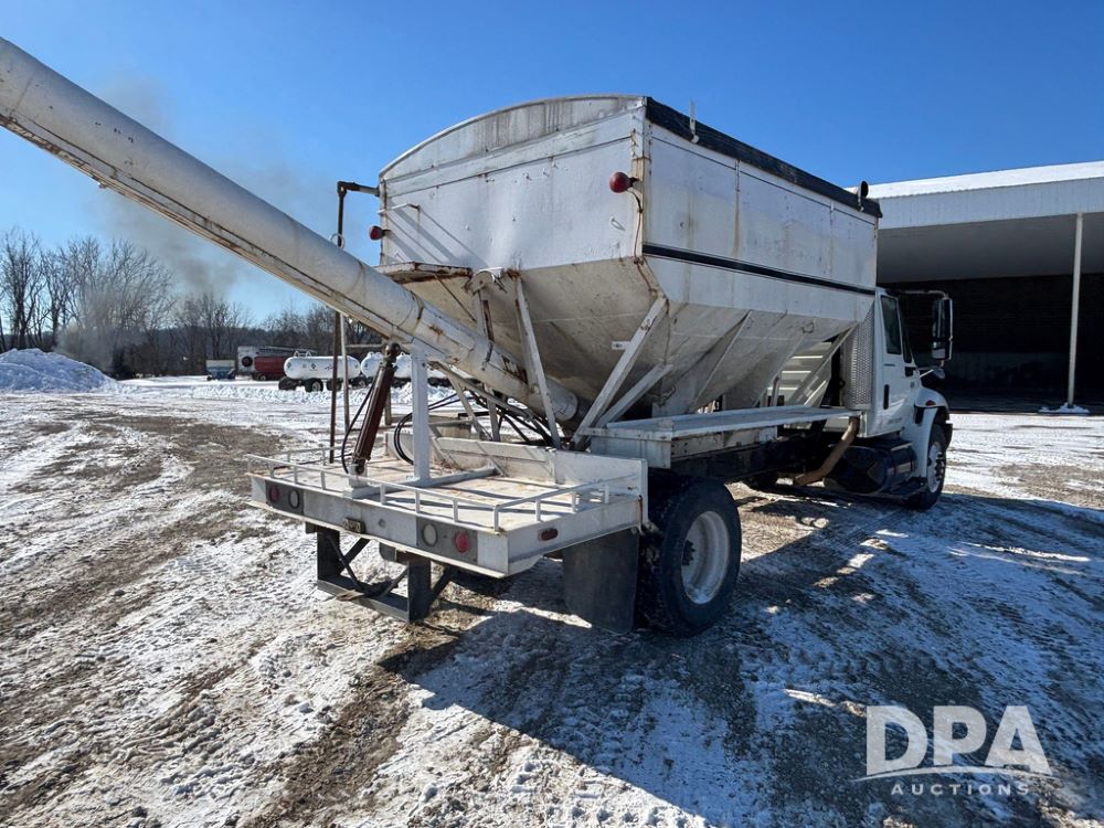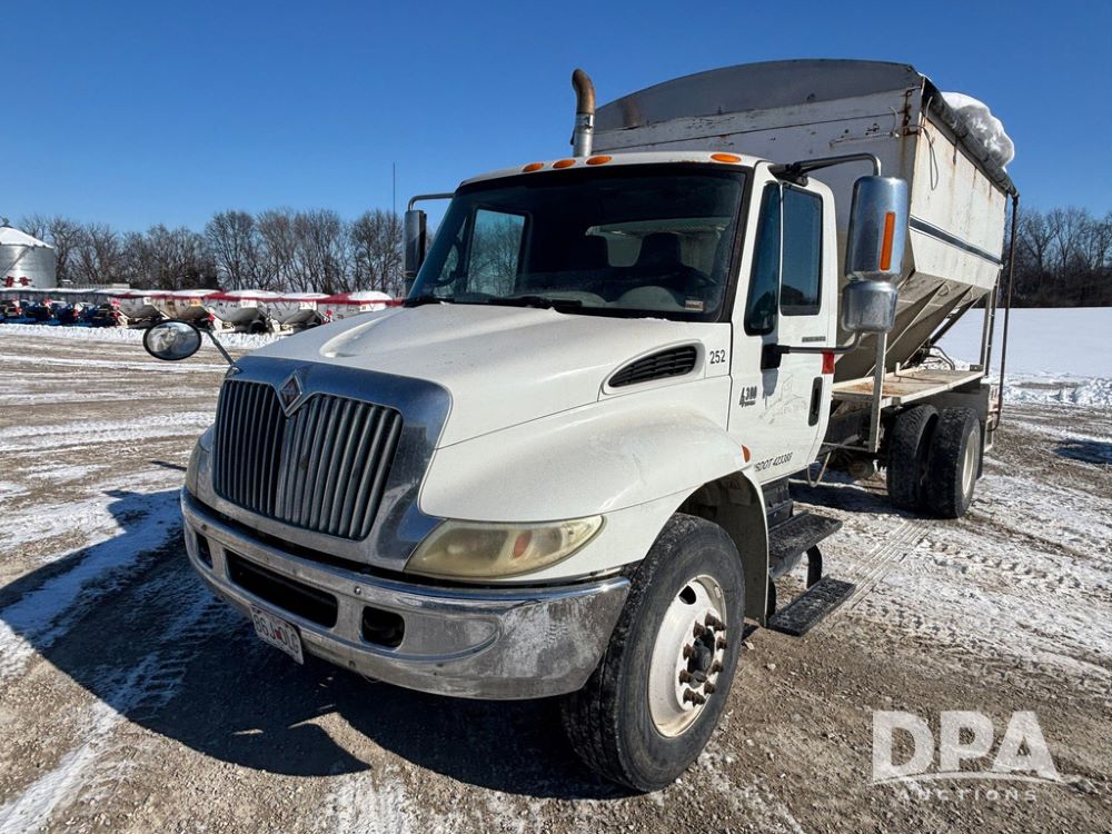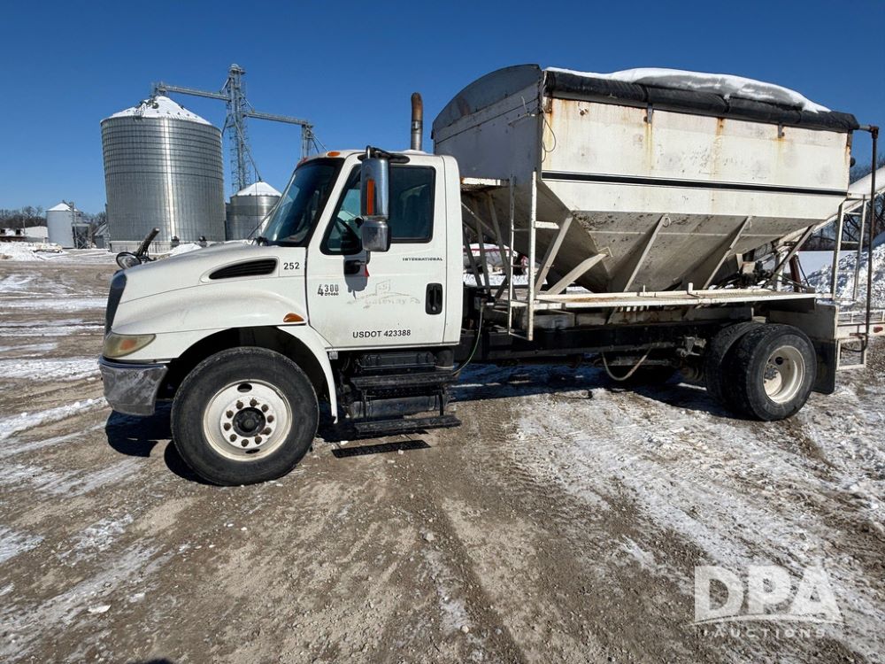 2004 IHC 4300 Dry Tender Truck (GP12639, Unit 252), DT466 diesel engine, Allison automatic transmission, air conditioning, heat, Am/Fm radio, cruise control, single axle, spring suspension, Willmar 10 ton dry tender box, rear discharge auger, all hydraulic, roll over tarp, 295/75R22.5 tires, shows 461,393 miles.