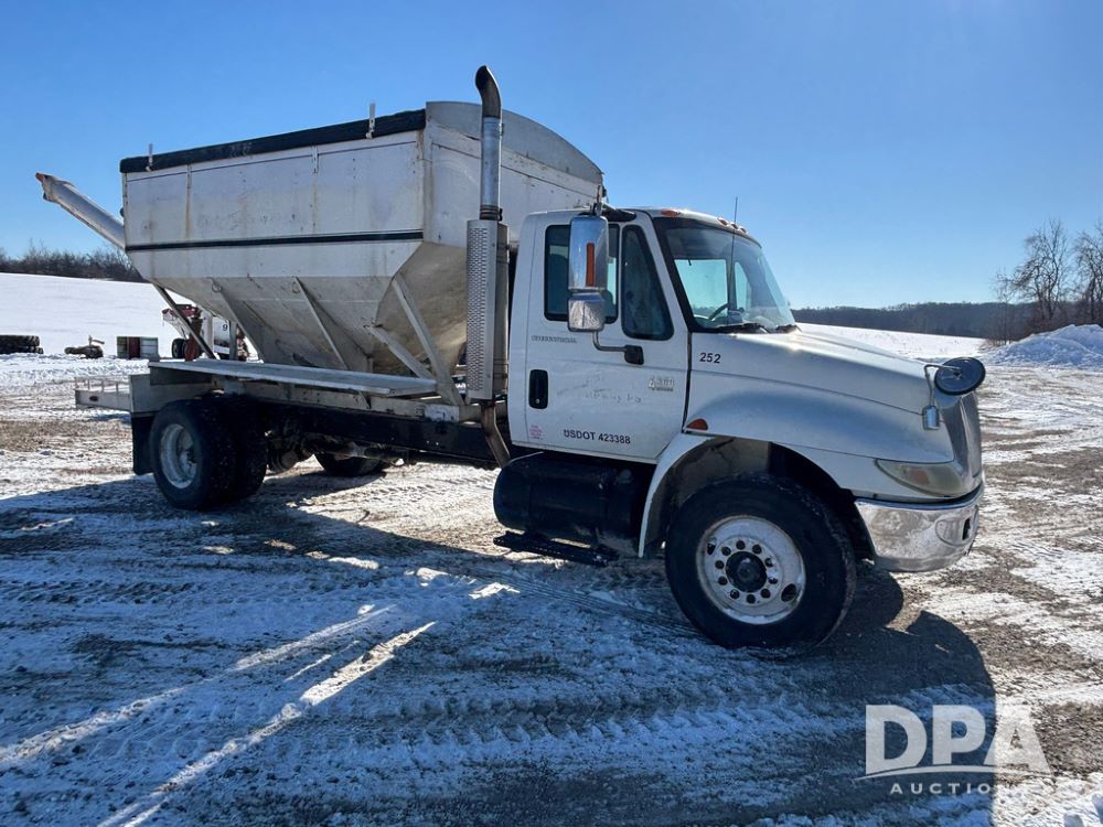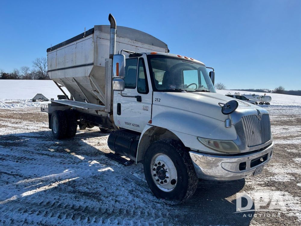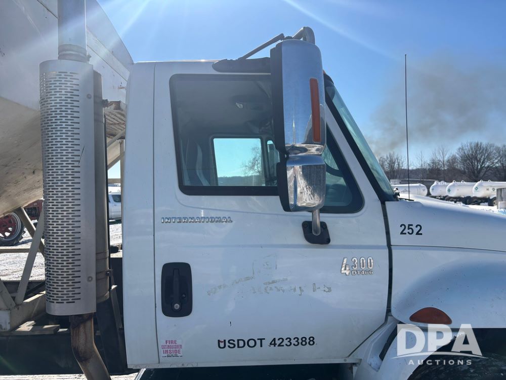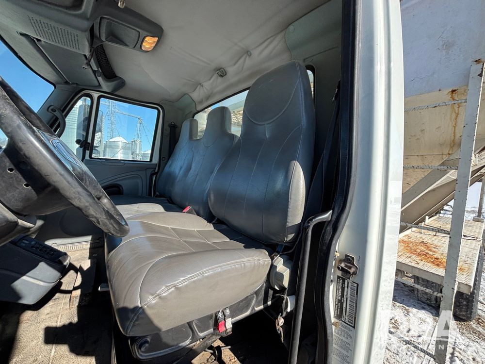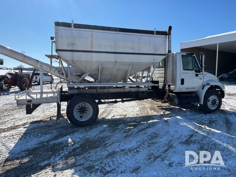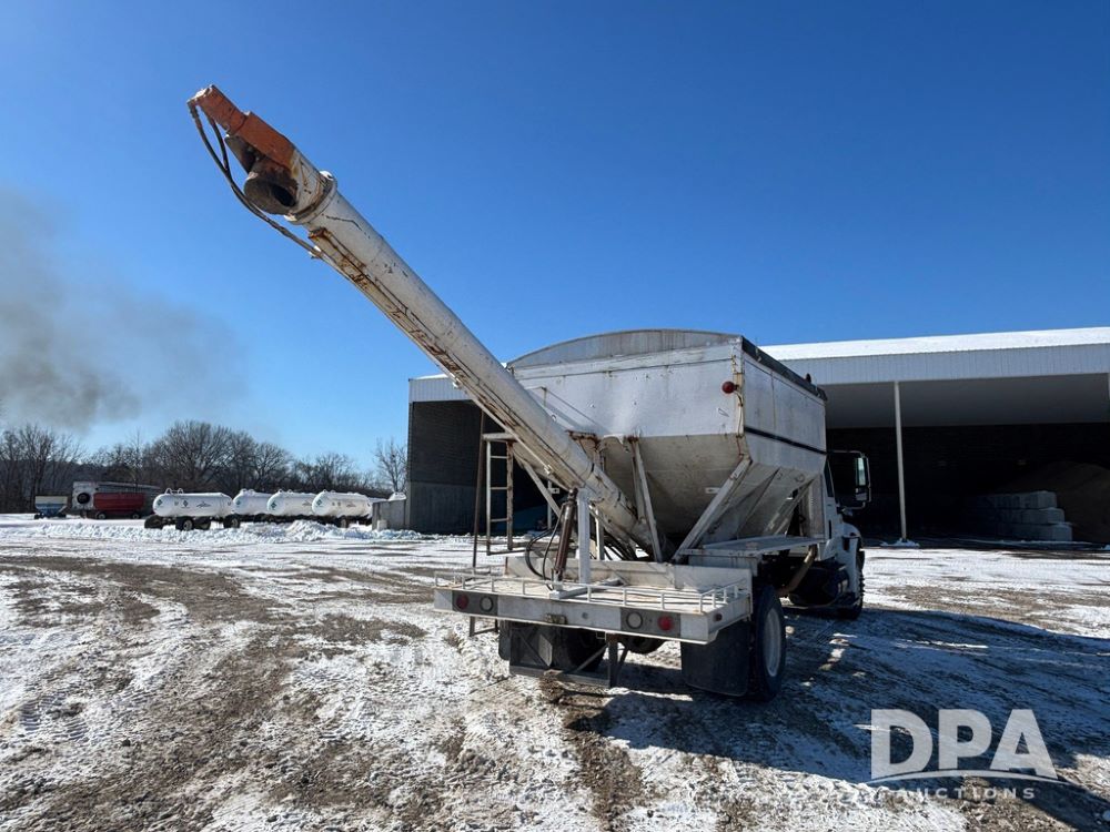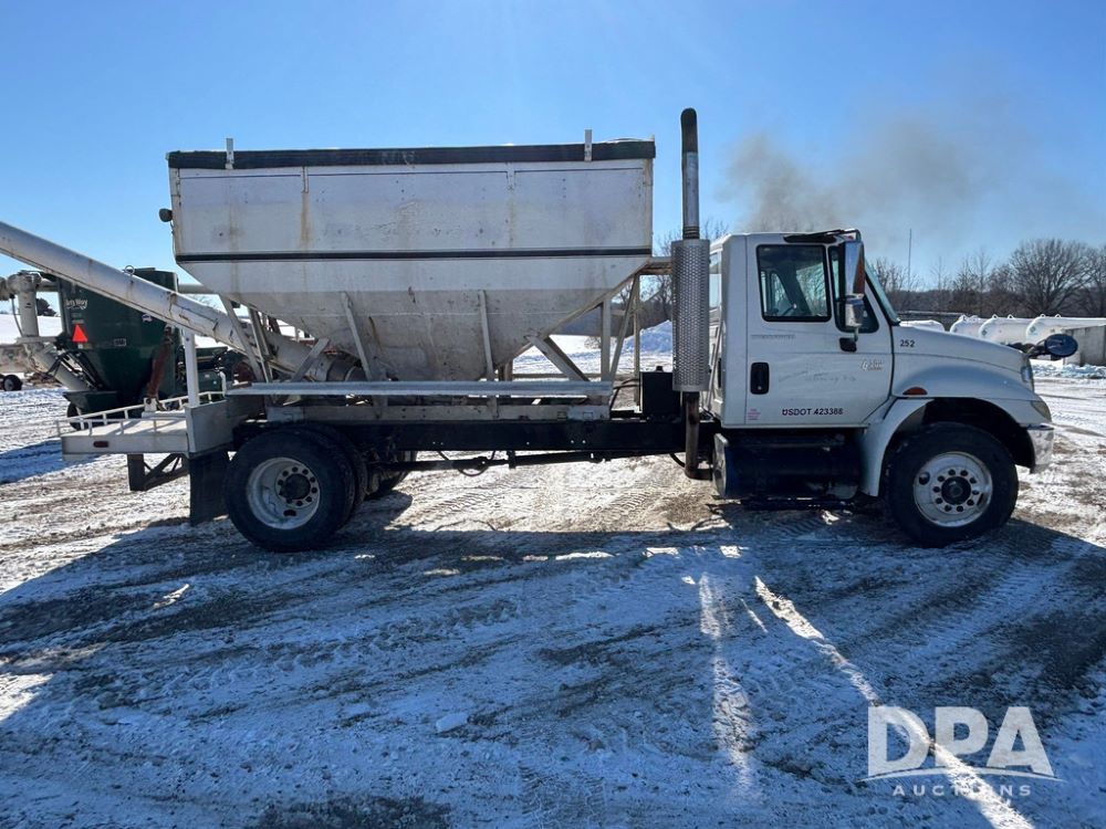 2004 IHC 4300 Dry Tender Truck (GP12639, Unit 252), DT466 diesel engine, Allison automatic transmission, air conditioning, heat, Am/Fm radio, cruise control, single axle, spring suspension, Willmar 10 ton dry tender box, rear discharge auger, all hydraulic, roll over tarp, 295/75R22.5 tires, shows 461,393 miles.