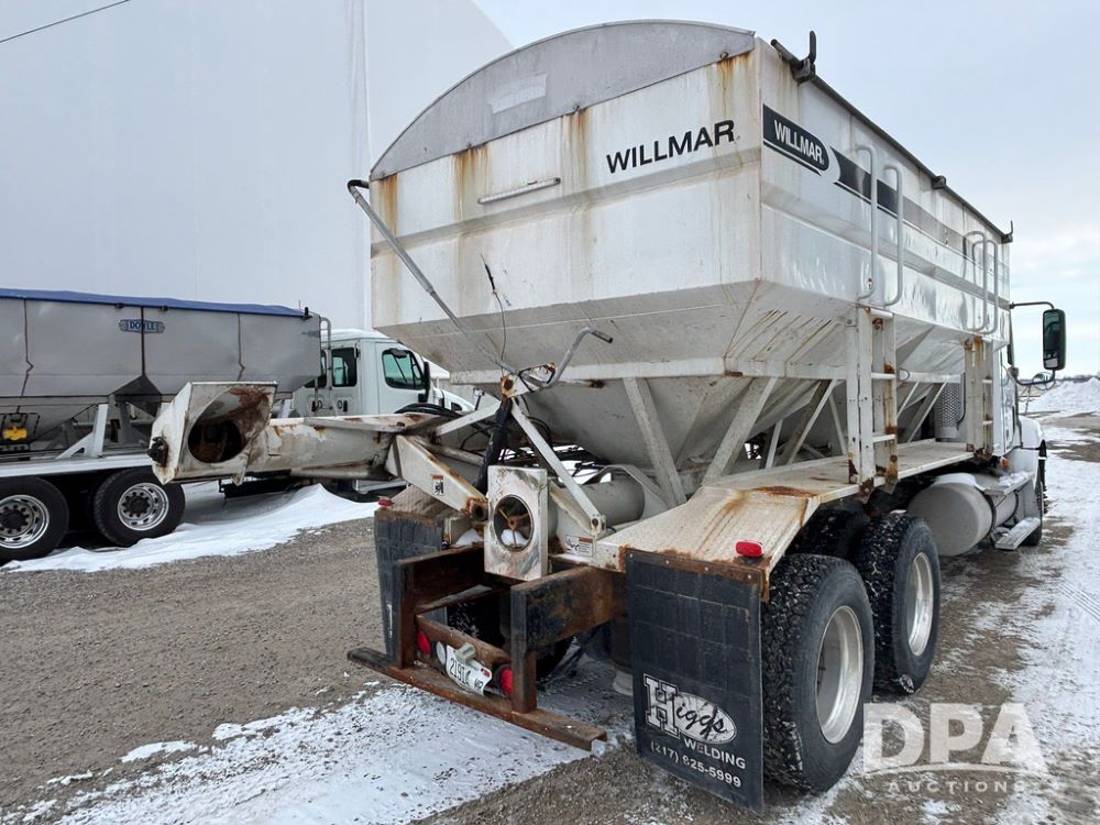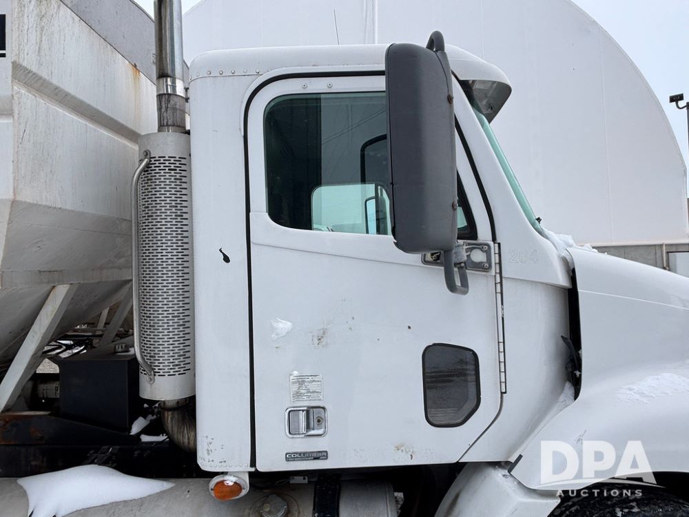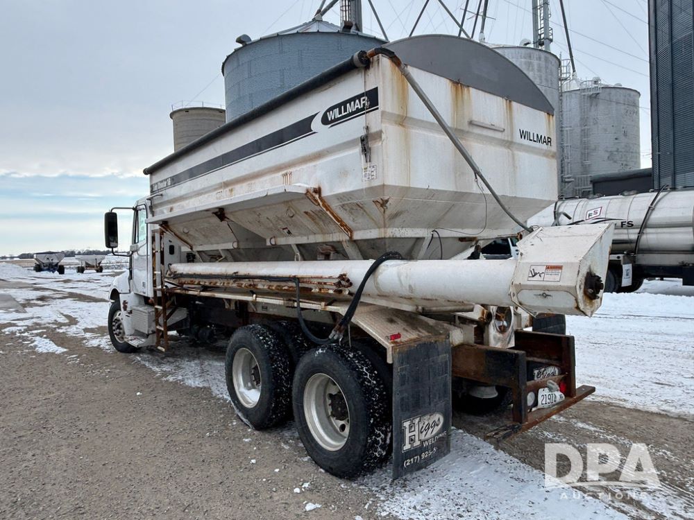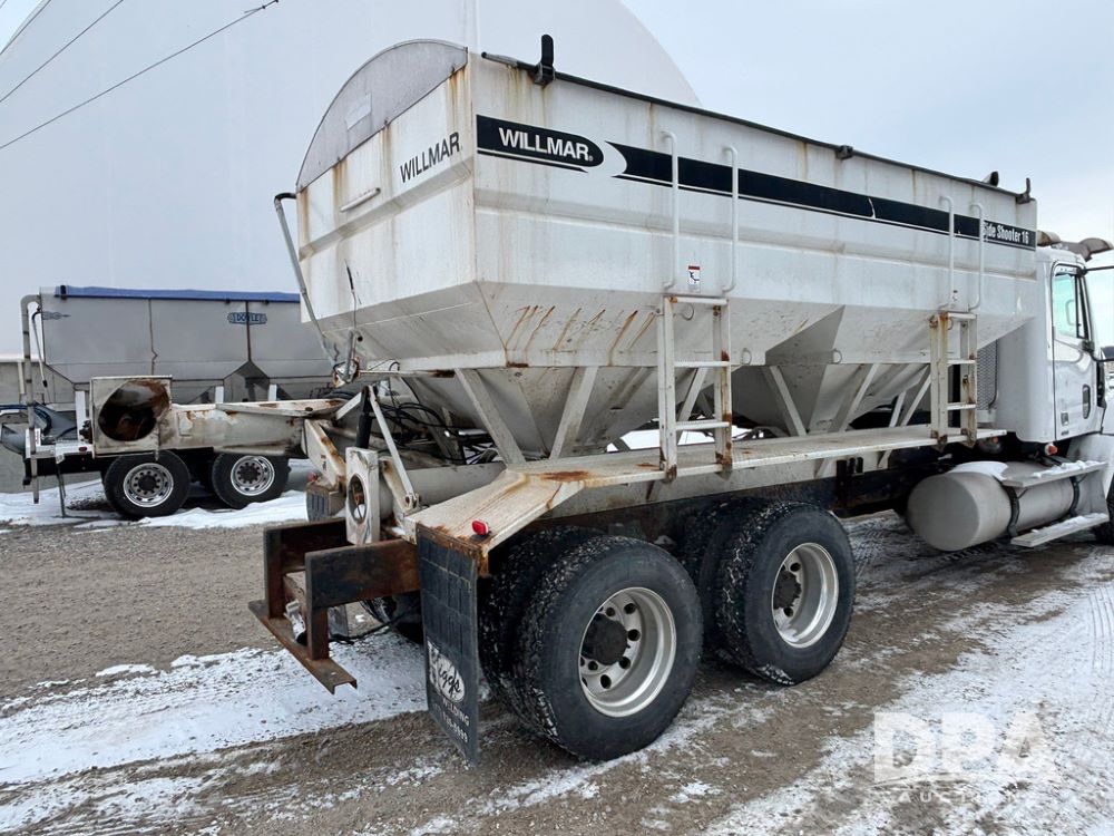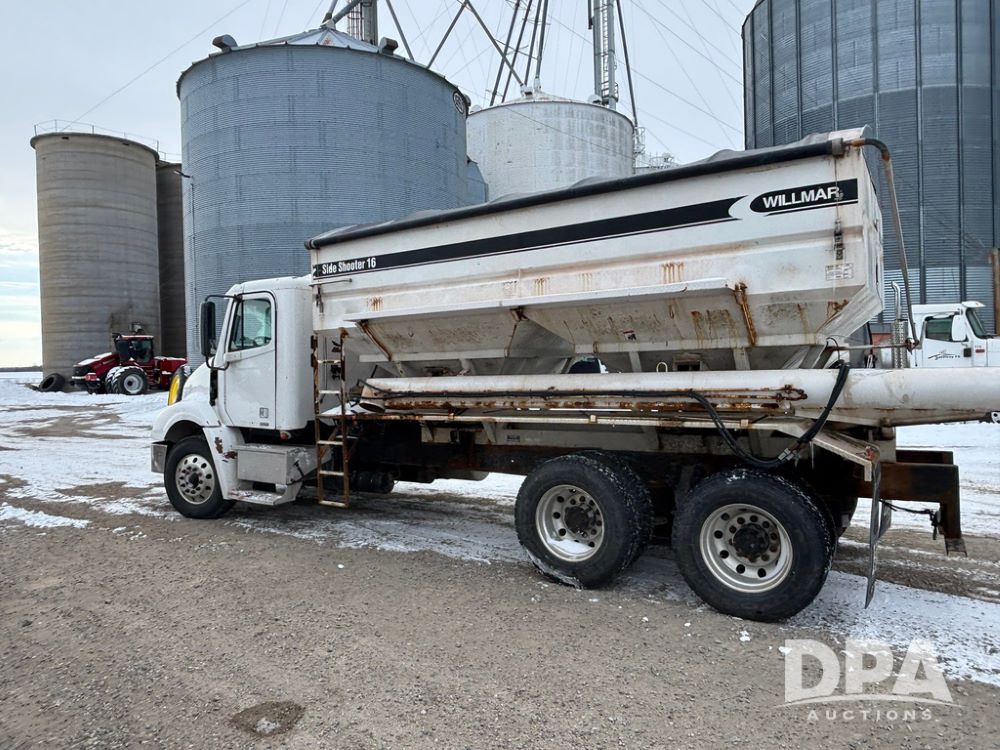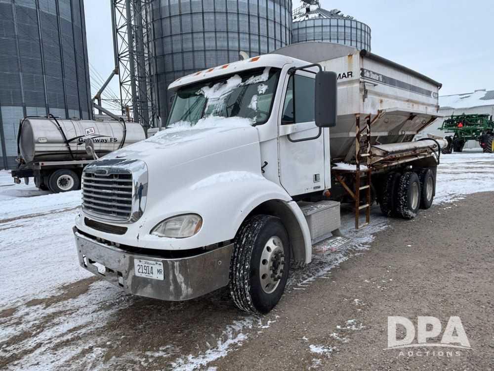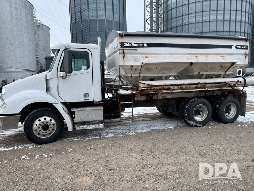 2007 Freightliner Columbia Dry Tender Truck (GP12705, Unit 204), Mercedes-Benz diesel engine, Eaton Fuller 10 speed transmission, air conditioning, heat, Am/Fm CD radio, cruise control, engine brake, tandem axle, full screw, air ride suspension, Willmar 16 ton dry tender box (S/N W16SSVJM001010), side discharge auger, all hydraulic, roll over tarp, 295/75R22.5 tires, aluminum rims, shows 690,275 miles.
