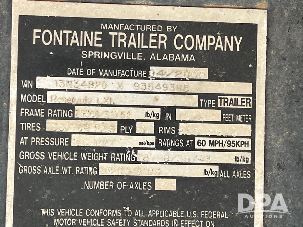 2009 Fontaine Renegade LXL Lowboy Trailer (JN3793), 2009 Fontaine lowboy trailer, mechanical detach, tandem axle, air ride suspension, 255/70R22.5 tires, Gross Vehicle Weight Rating: 78,798 pounds, frame rating 70,000 pounds.