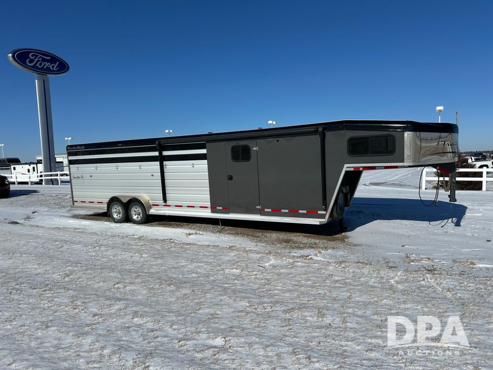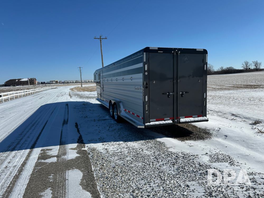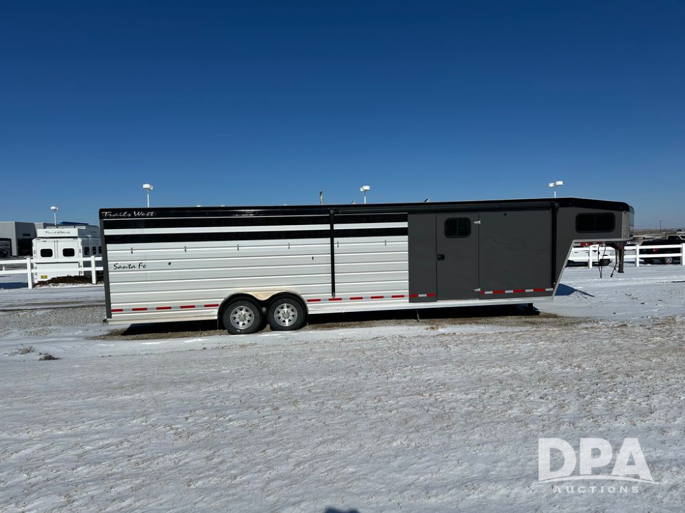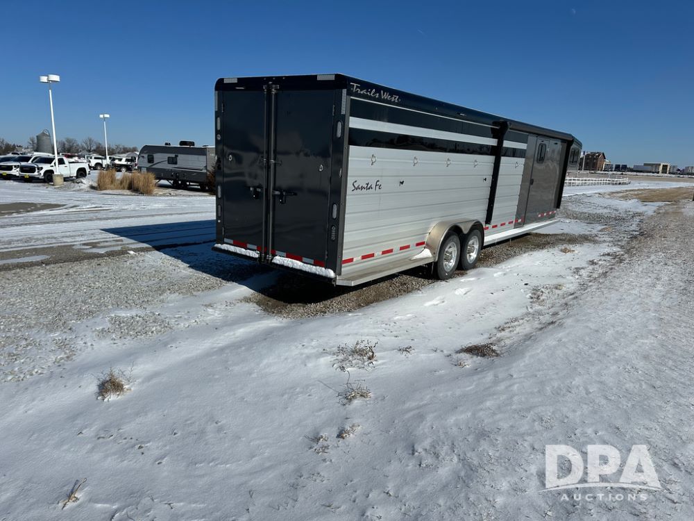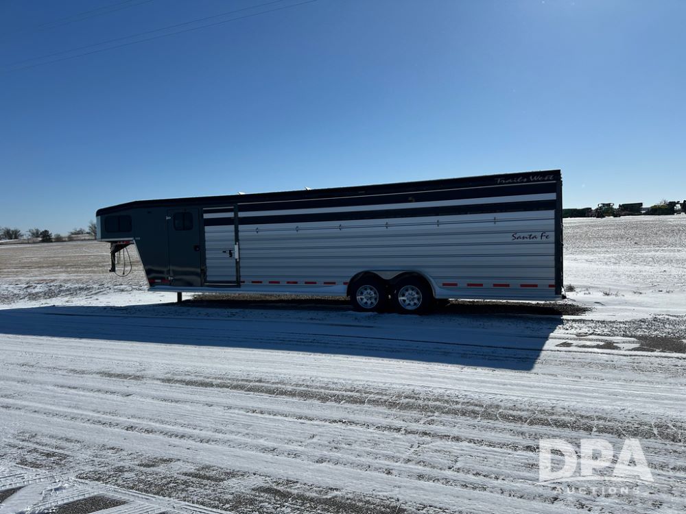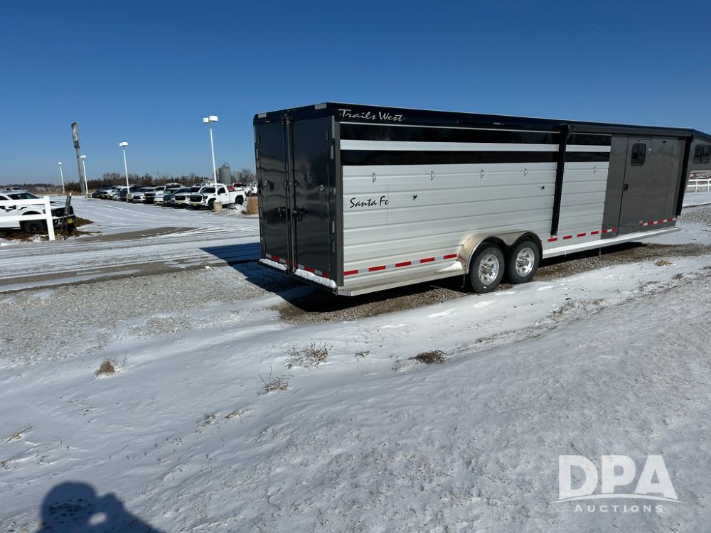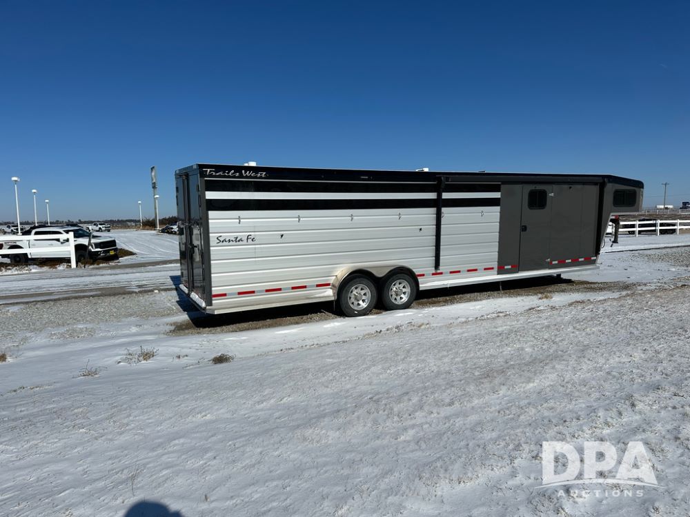 2022 Trails West Santa Fe Horse Trailer (DPA5032), 31ft gooseneck trailer, Super Tack Package, stock area 25.5x20 with cargo doors, slant cross gate, cargo doors and side gate, tack area 5x10 with tack door each side, double 6 place blanket rack, 4 place swing out saddle rack, ST215/75R17.5 LRH tires.