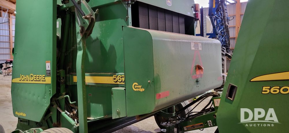 2008 John Deere 567 MegaWide Round Baler (JM753), one owner, 5ft. x 6ft. bale size (62in. X 72in.), small 1000 PTO, pin hitch, 8-belt system bale chamber, monitor included, dual gauge wheels, shows 32,830 original bales, tires- ST225/75R15.