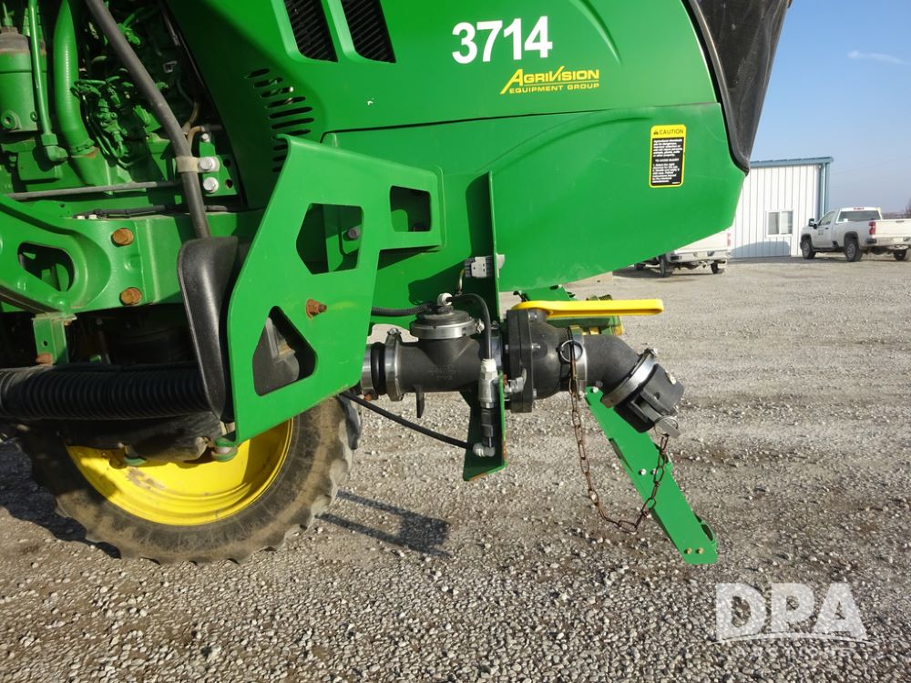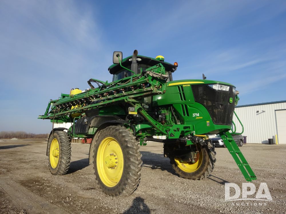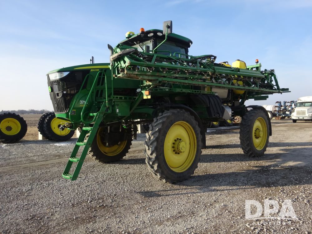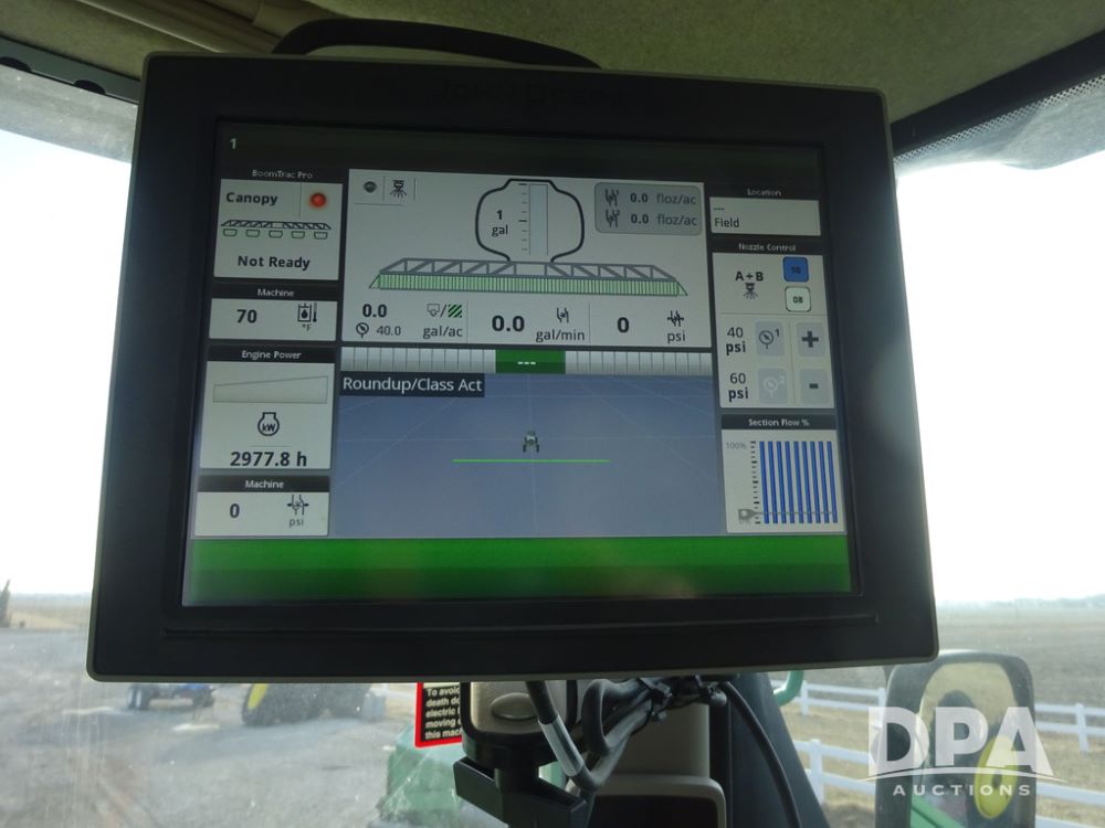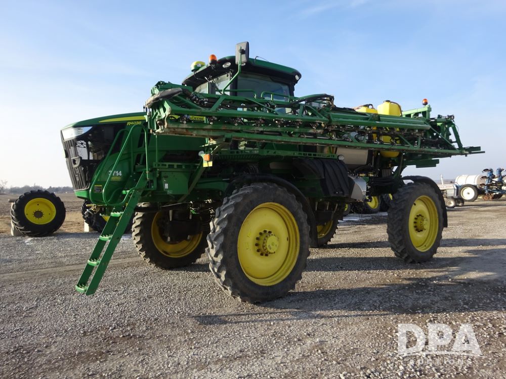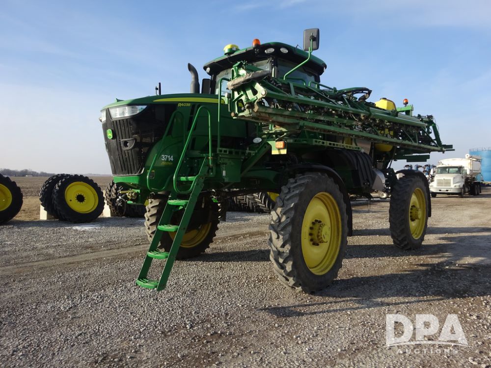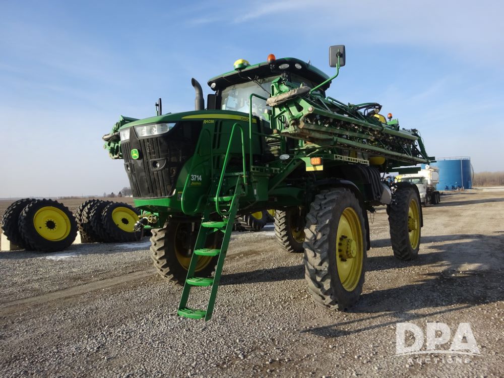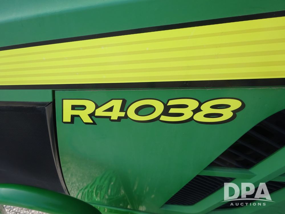 2019 John Deere R4038 Sprayer (PZ14367, Unit 3714), John Deere diesel engine (RG6090U066827), hydrostatic transmission, air conditioning, heat, Am/Fm radio, leather seat, buddy seat, beacon lights, 1000 gallon stainless steel liquid system, 100' boom, rear poly rinse tank, 4 - 50 gallon poly direct injection tanks, 2 - Raven Sidekick Pro pumps, stainless steel chemical inductor, automatic solution control, front fill, Firestone & Michelin IF380/90R46 tires, fenders, John Deere StarFire 6000 globe, John Deere monitor, shows 2,977 hours.
