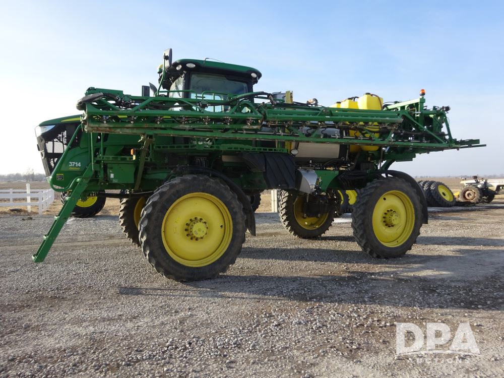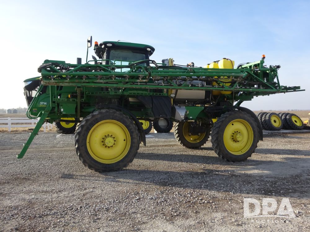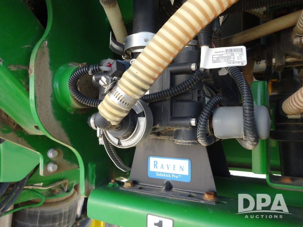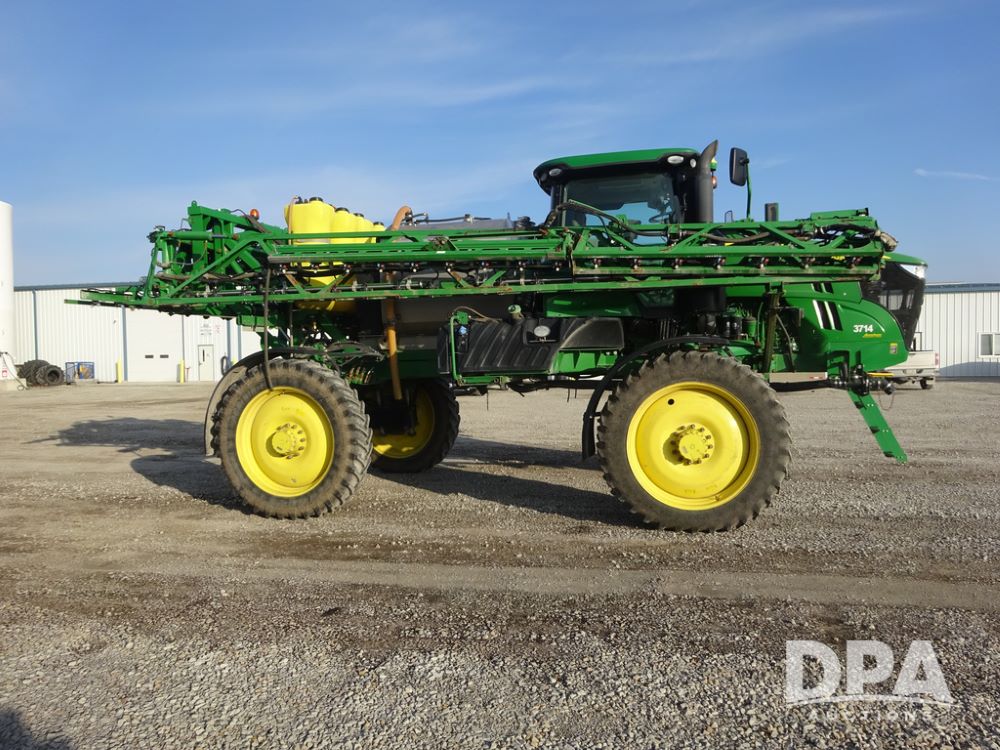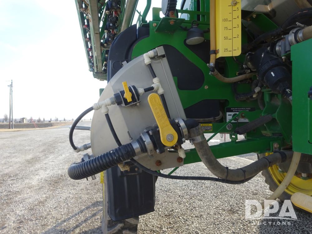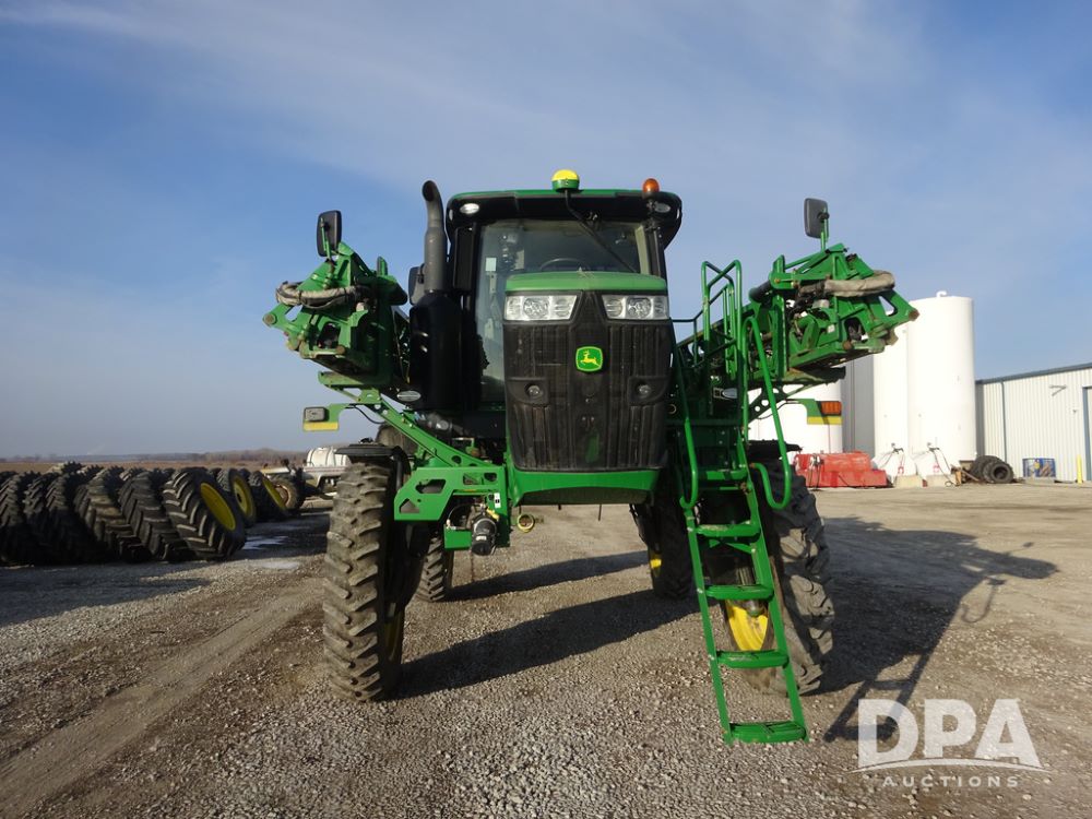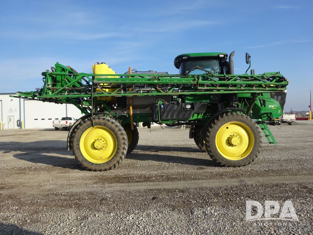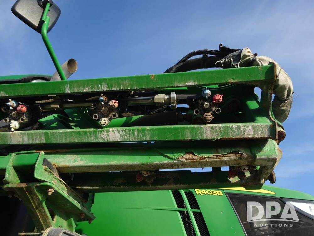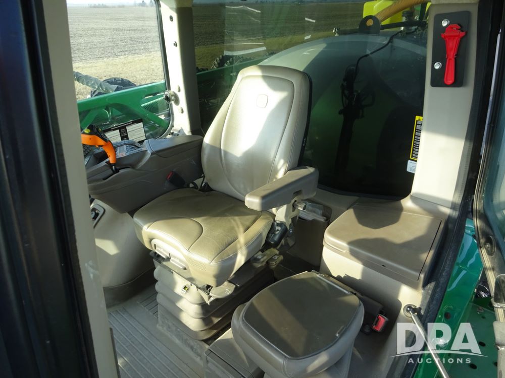 2019 John Deere R4038 Sprayer (PZ14367, Unit 3714), John Deere diesel engine (RG6090U066827), hydrostatic transmission, air conditioning, heat, Am/Fm radio, leather seat, buddy seat, beacon lights, 1000 gallon stainless steel liquid system, 100' boom, rear poly rinse tank, 4 - 50 gallon poly direct injection tanks, 2 - Raven Sidekick Pro pumps, stainless steel chemical inductor, automatic solution control, front fill, Firestone & Michelin IF380/90R46 tires, fenders, John Deere StarFire 6000 globe, John Deere monitor, shows 2,977 hours.