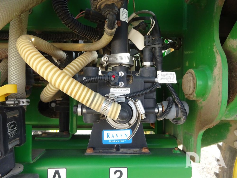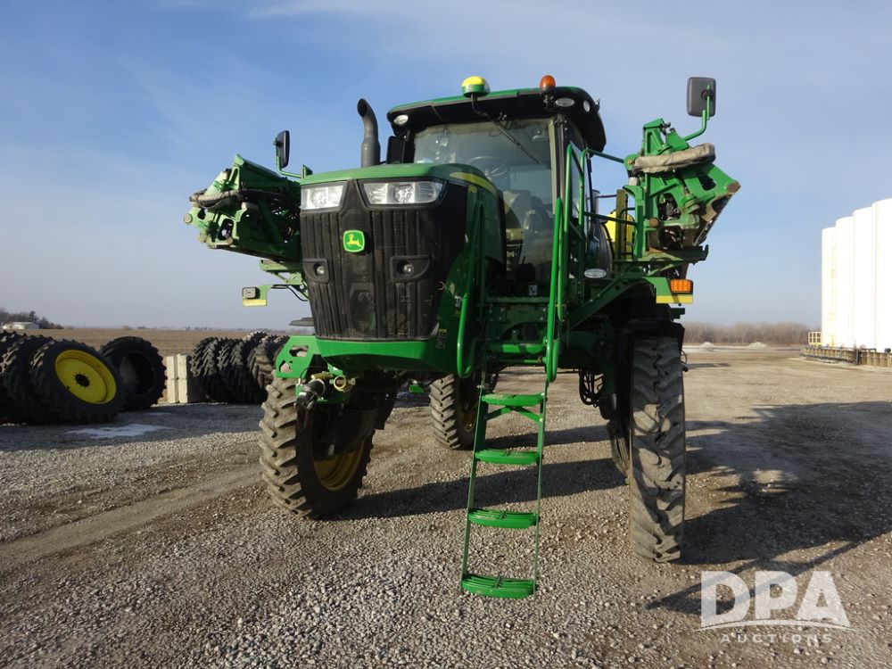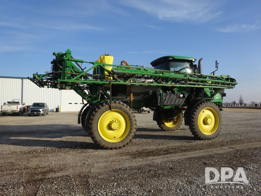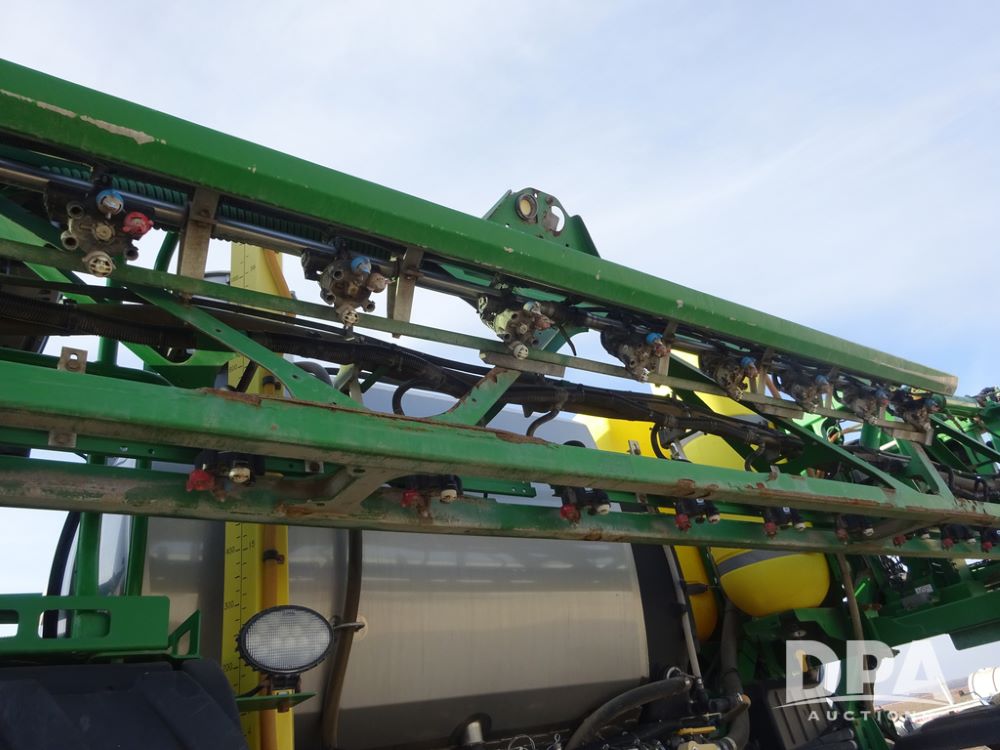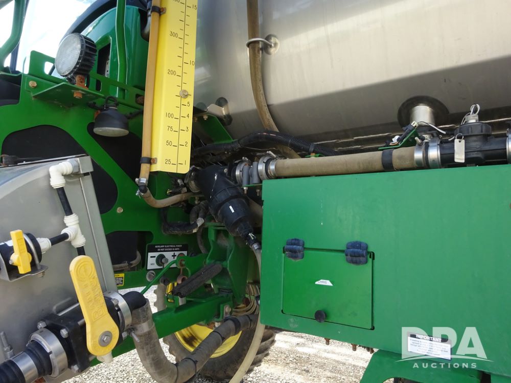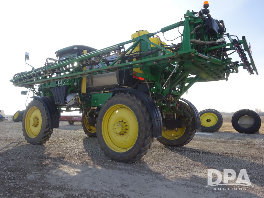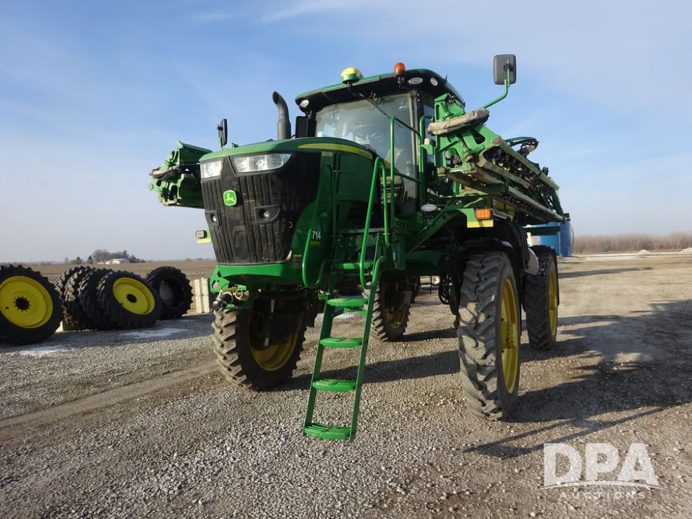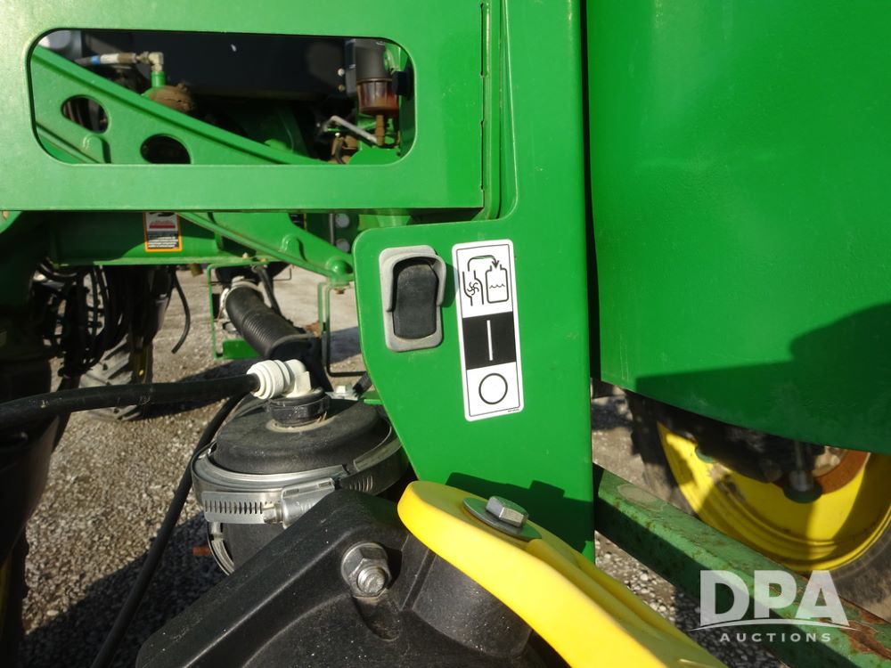 2019 John Deere R4038 Sprayer (PZ14367, Unit 3714), John Deere diesel engine (RG6090U066827), hydrostatic transmission, air conditioning, heat, Am/Fm radio, leather seat, buddy seat, beacon lights, 1000 gallon stainless steel liquid system, 100' boom, rear poly rinse tank, 4 - 50 gallon poly direct injection tanks, 2 - Raven Sidekick Pro pumps, stainless steel chemical inductor, automatic solution control, front fill, Firestone & Michelin IF380/90R46 tires, fenders, John Deere StarFire 6000 globe, John Deere monitor, shows 2,977 hours.