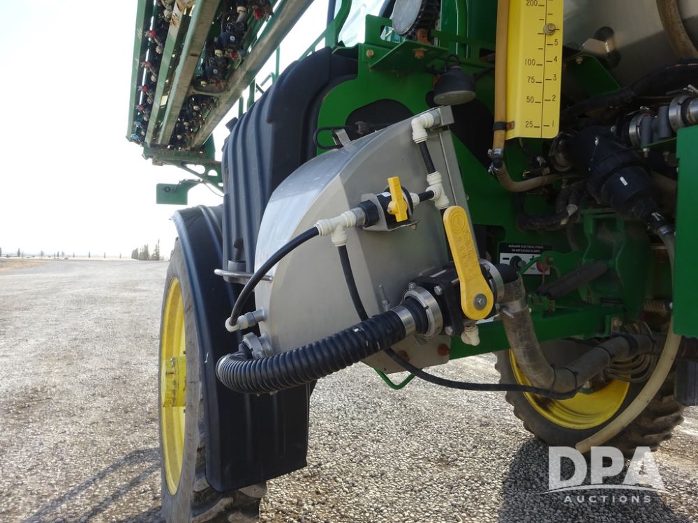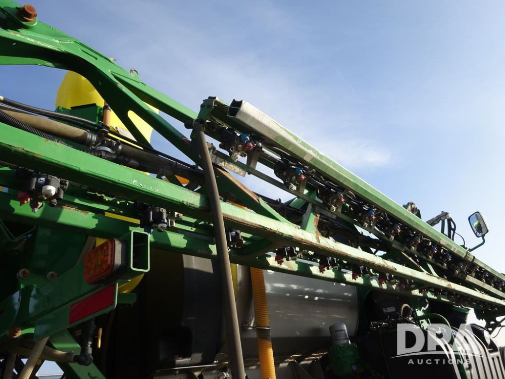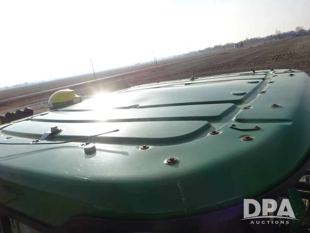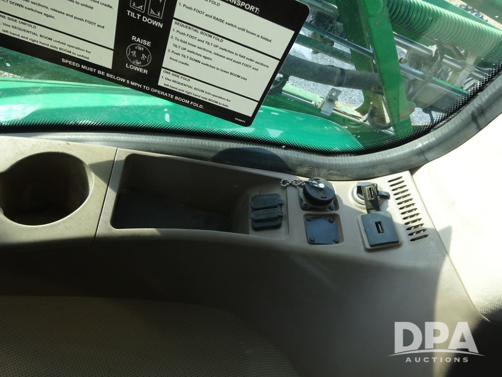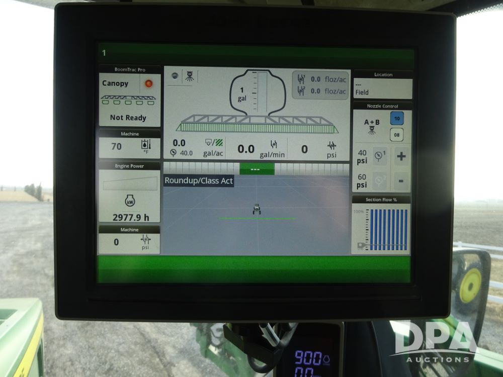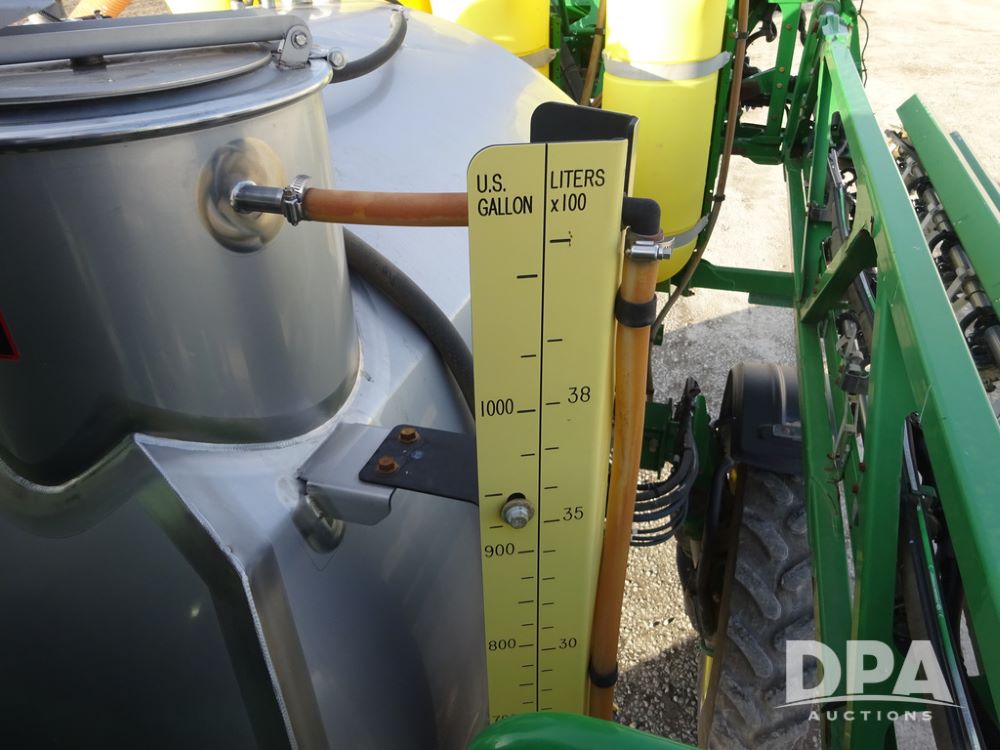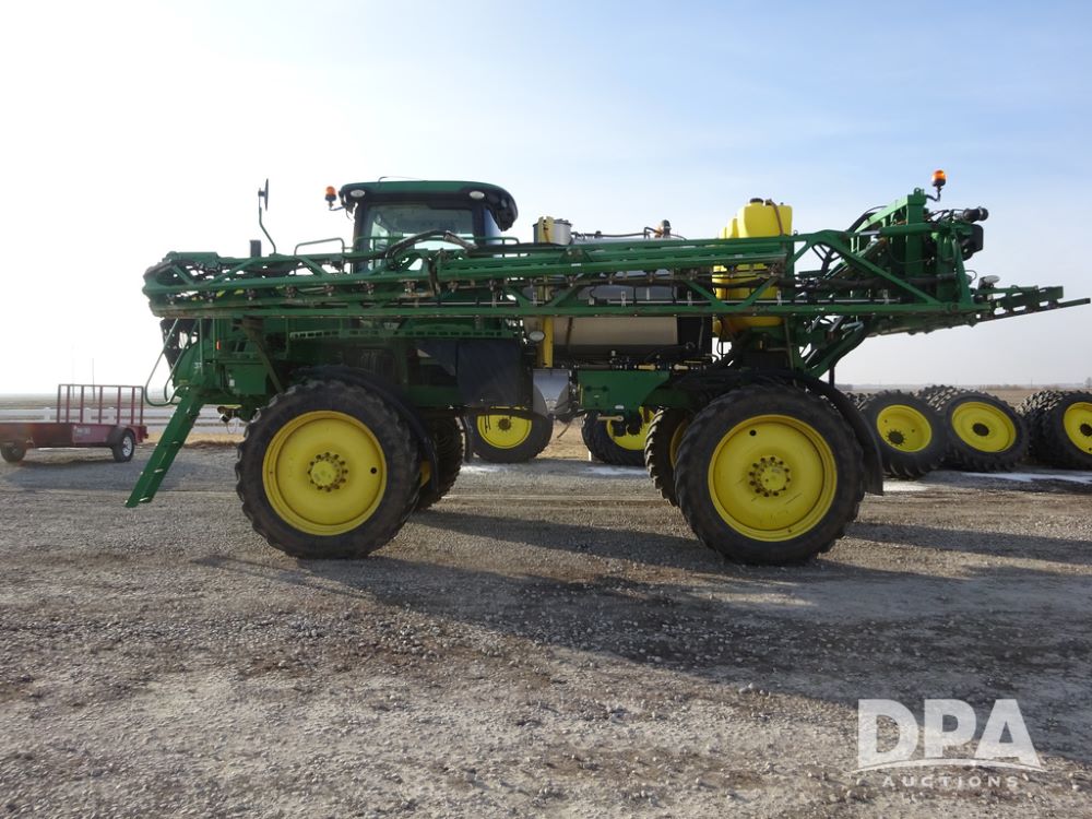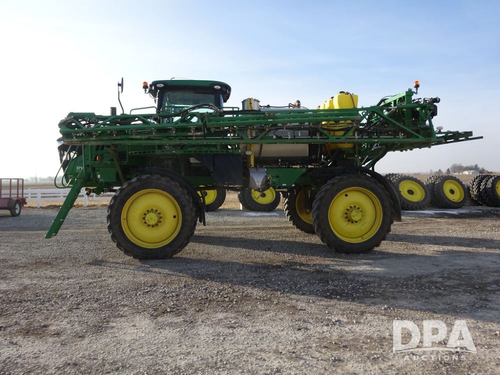 2019 John Deere R4038 Sprayer (PZ14367, Unit 3714), John Deere diesel engine (RG6090U066827), hydrostatic transmission, air conditioning, heat, Am/Fm radio, leather seat, buddy seat, beacon lights, 1000 gallon stainless steel liquid system, 100' boom, rear poly rinse tank, 4 - 50 gallon poly direct injection tanks, 2 - Raven Sidekick Pro pumps, stainless steel chemical inductor, automatic solution control, front fill, Firestone & Michelin IF380/90R46 tires, fenders, John Deere StarFire 6000 globe, John Deere monitor, shows 2,977 hours.