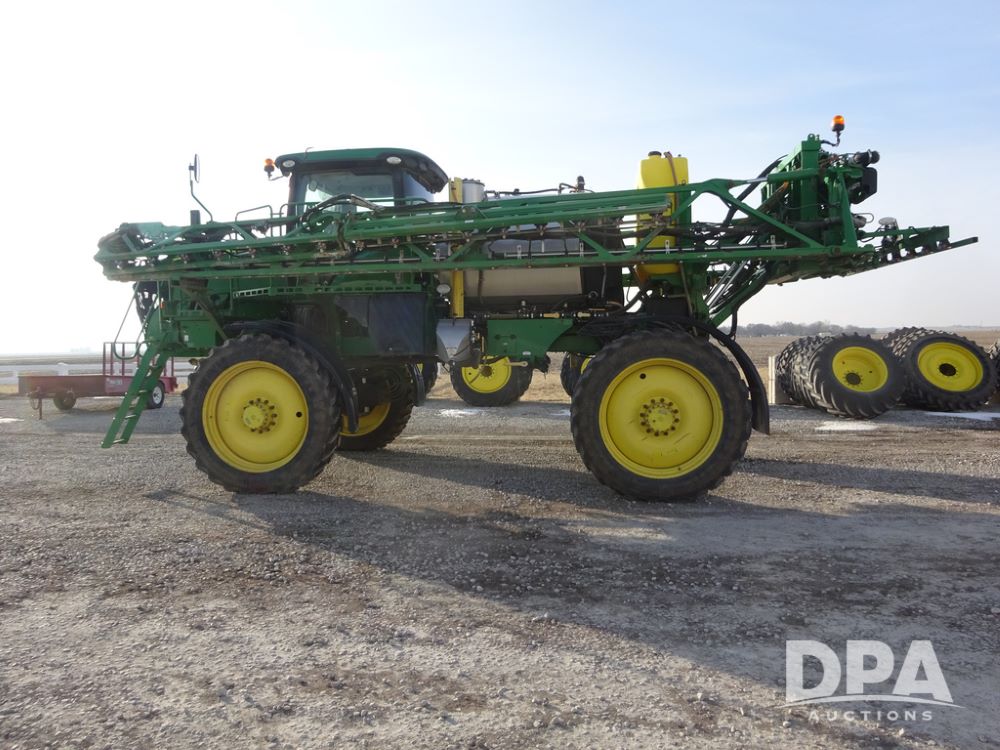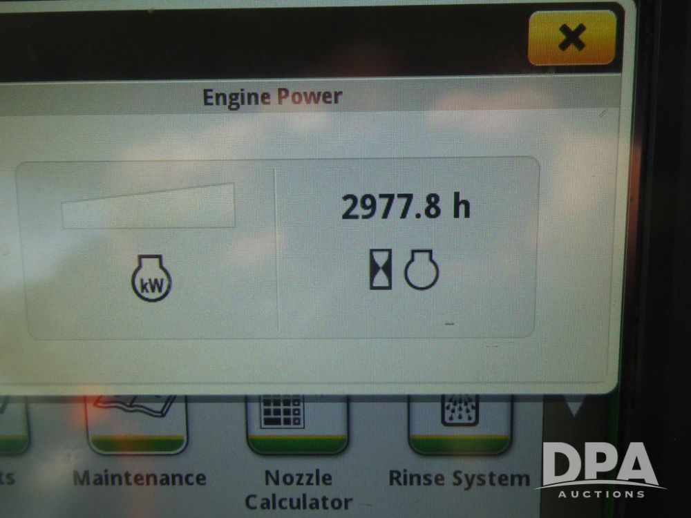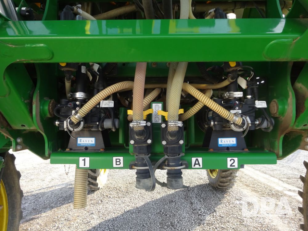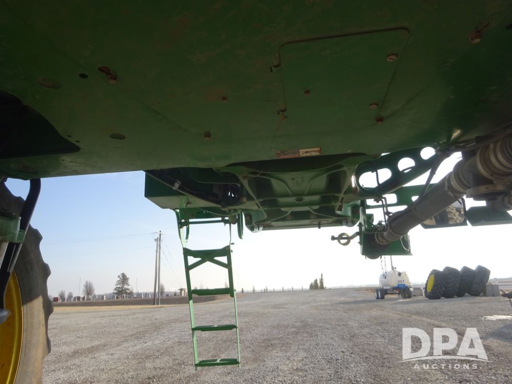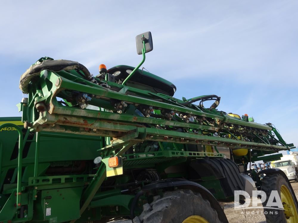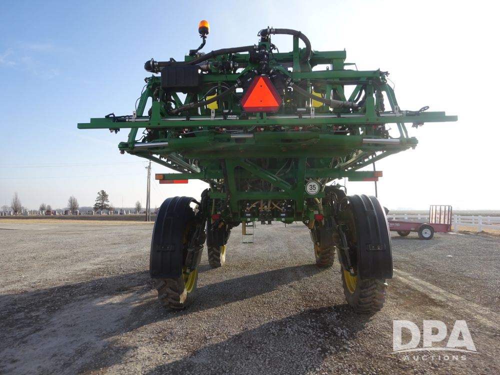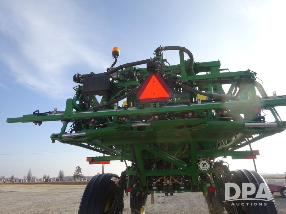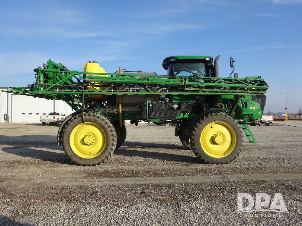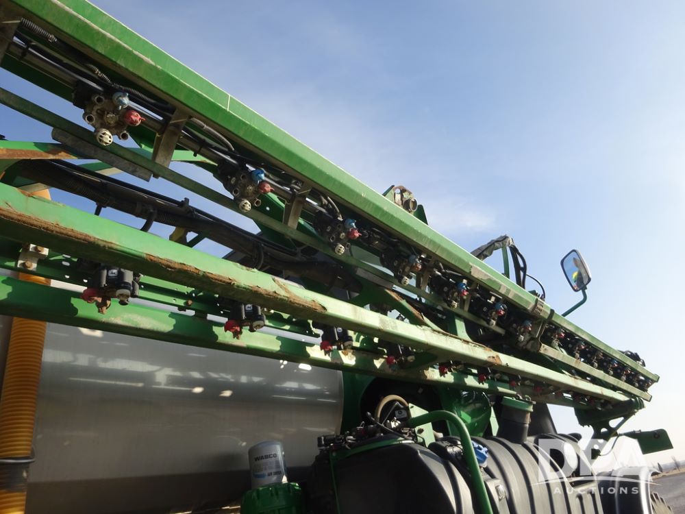 2019 John Deere R4038 Sprayer (PZ14367, Unit 3714), John Deere diesel engine (RG6090U066827), hydrostatic transmission, air conditioning, heat, Am/Fm radio, leather seat, buddy seat, beacon lights, 1000 gallon stainless steel liquid system, 100' boom, rear poly rinse tank, 4 - 50 gallon poly direct injection tanks, 2 - Raven Sidekick Pro pumps, stainless steel chemical inductor, automatic solution control, front fill, Firestone & Michelin IF380/90R46 tires, fenders, John Deere StarFire 6000 globe, John Deere monitor, shows 2,977 hours.