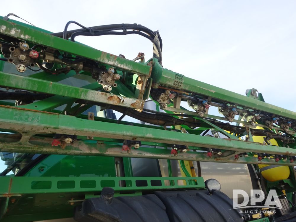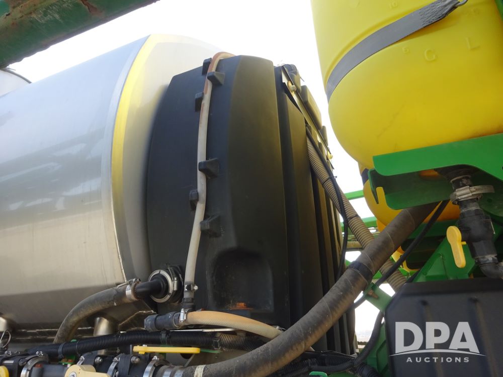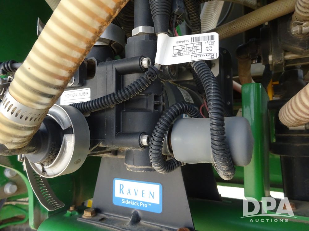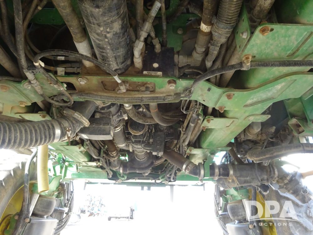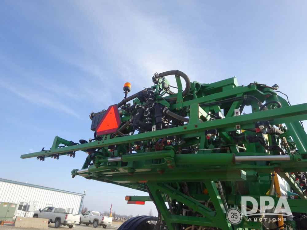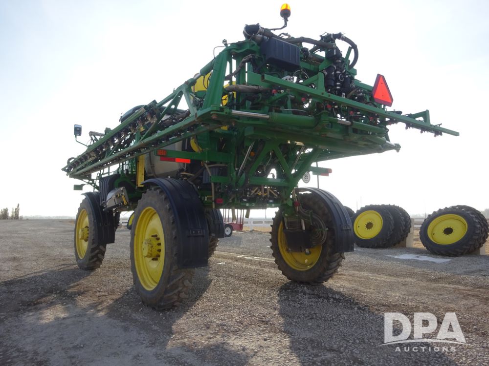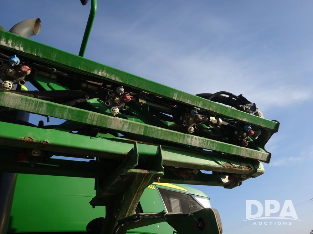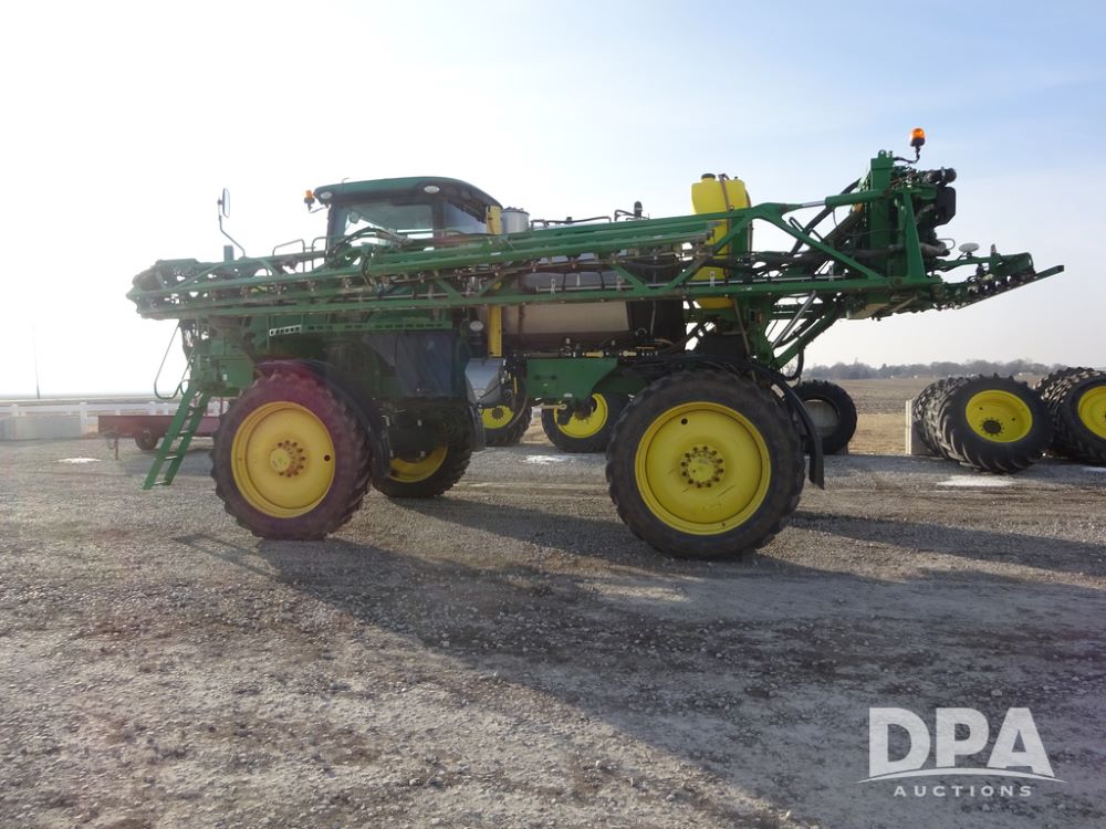 2019 John Deere R4038 Sprayer (PZ14367, Unit 3714), John Deere diesel engine (RG6090U066827), hydrostatic transmission, air conditioning, heat, Am/Fm radio, leather seat, buddy seat, beacon lights, 1000 gallon stainless steel liquid system, 100' boom, rear poly rinse tank, 4 - 50 gallon poly direct injection tanks, 2 - Raven Sidekick Pro pumps, stainless steel chemical inductor, automatic solution control, front fill, Firestone & Michelin IF380/90R46 tires, fenders, John Deere StarFire 6000 globe, John Deere monitor, shows 2,977 hours.