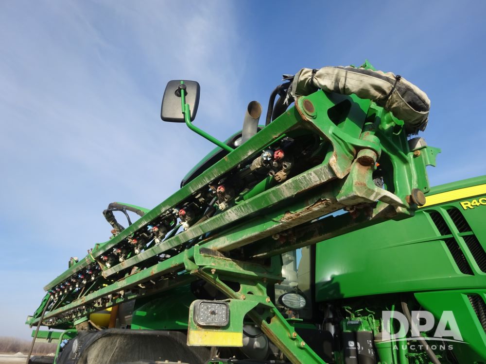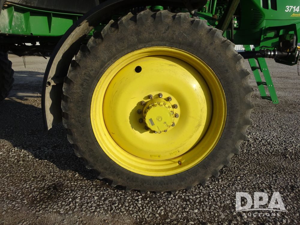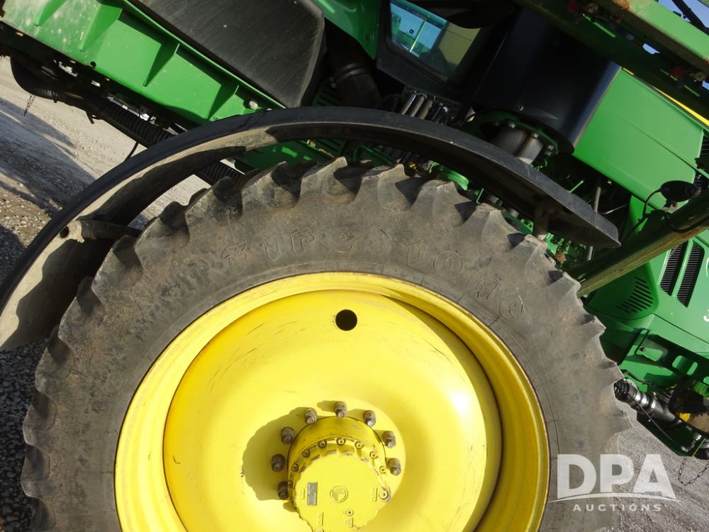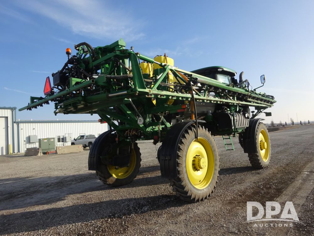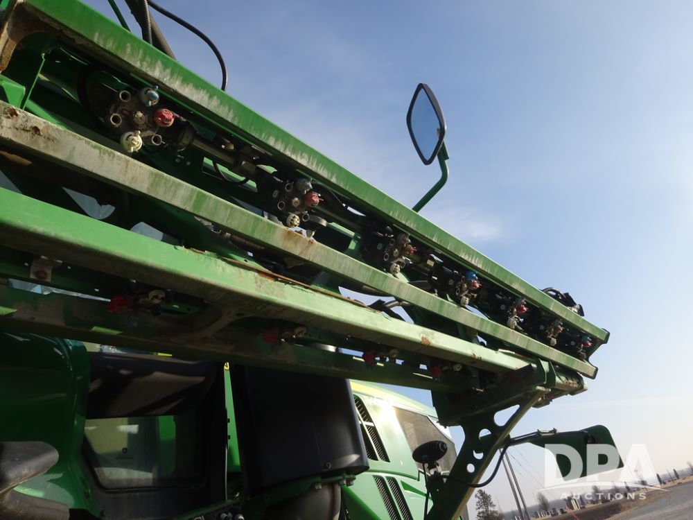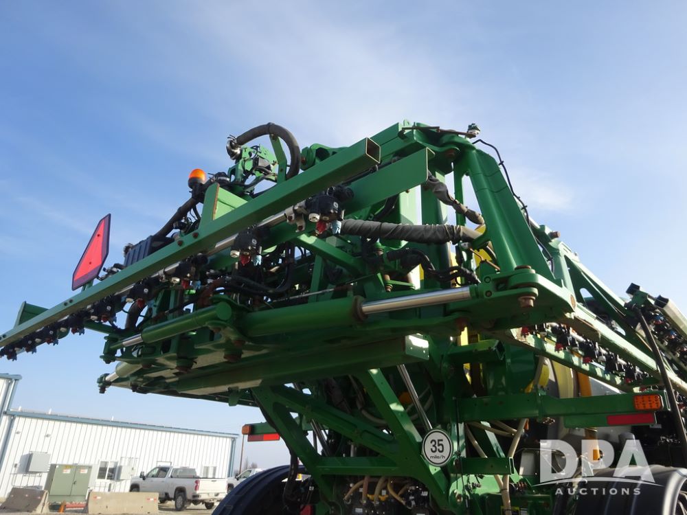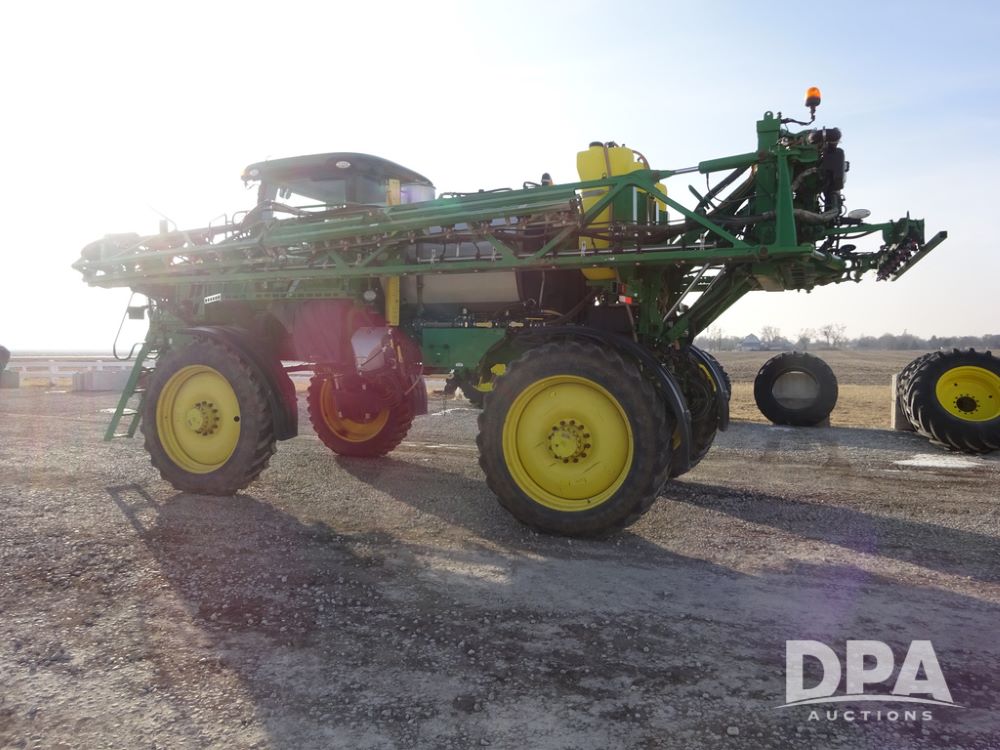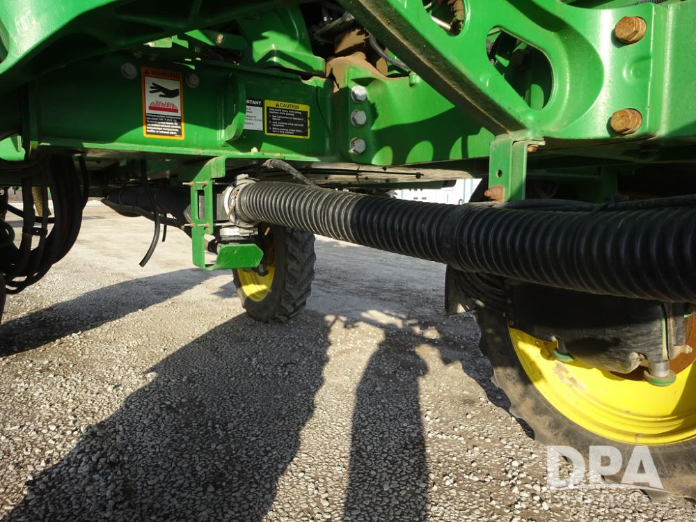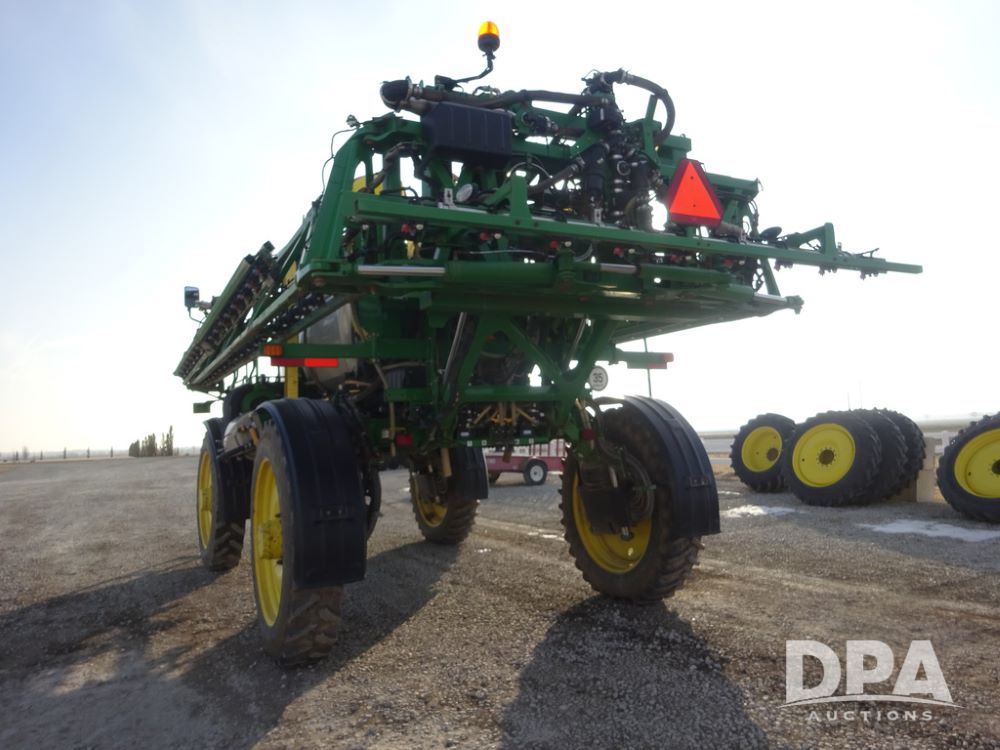 2019 John Deere R4038 Sprayer (PZ14367, Unit 3714), John Deere diesel engine (RG6090U066827), hydrostatic transmission, air conditioning, heat, Am/Fm radio, leather seat, buddy seat, beacon lights, 1000 gallon stainless steel liquid system, 100' boom, rear poly rinse tank, 4 - 50 gallon poly direct injection tanks, 2 - Raven Sidekick Pro pumps, stainless steel chemical inductor, automatic solution control, front fill, Firestone & Michelin IF380/90R46 tires, fenders, John Deere StarFire 6000 globe, John Deere monitor, shows 2,977 hours.