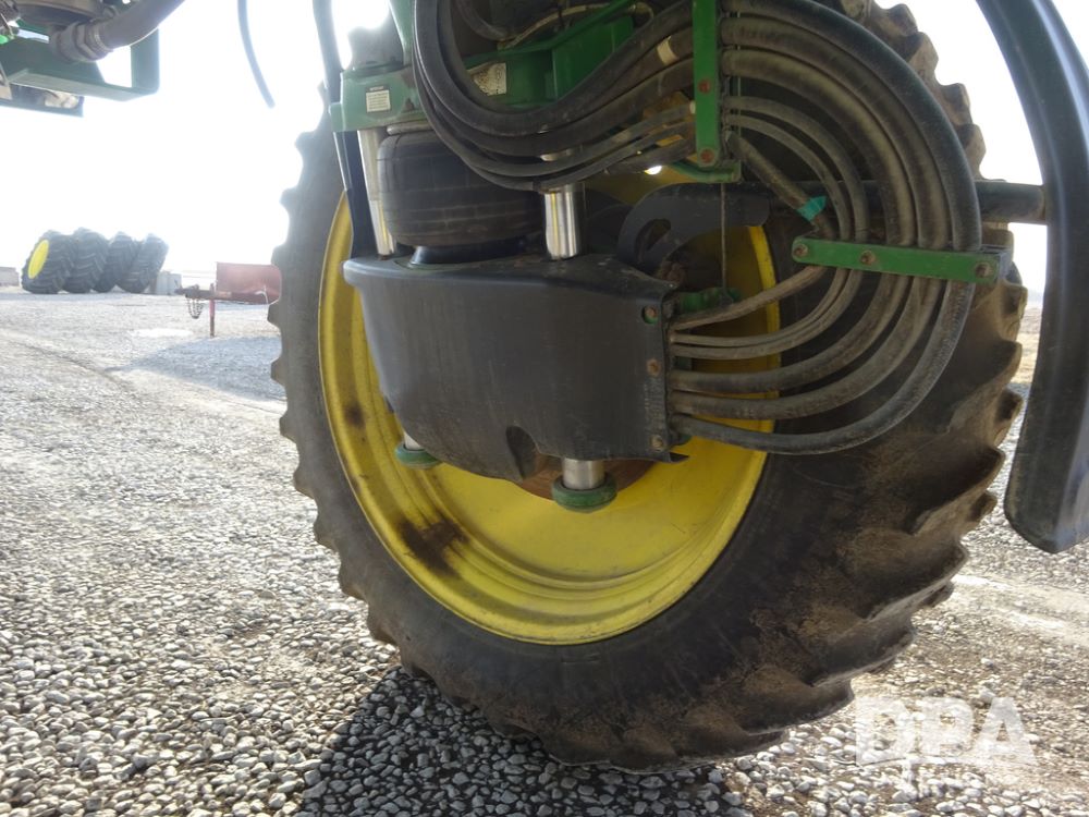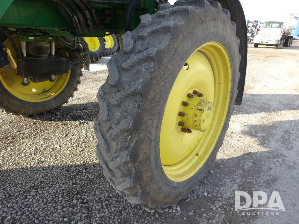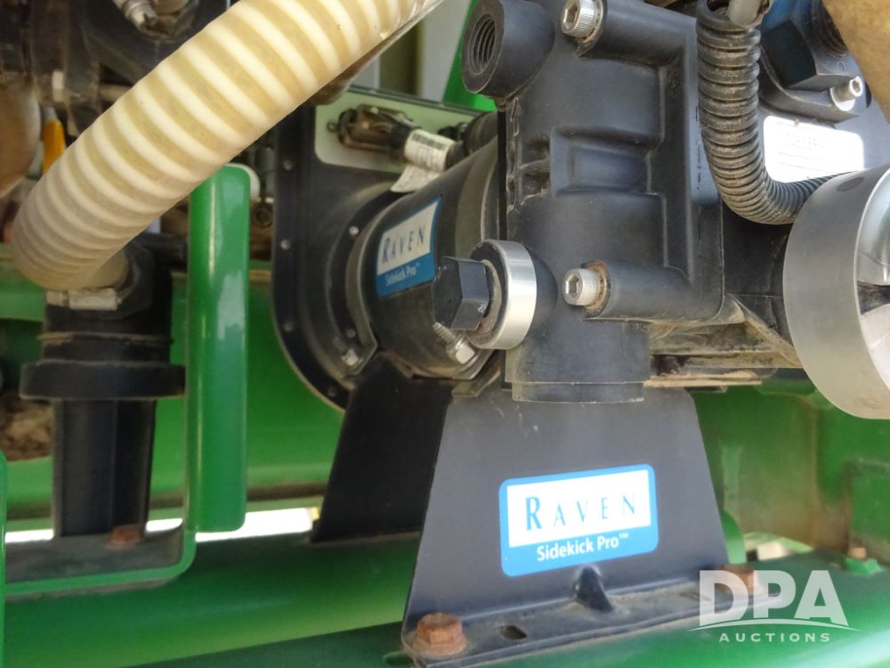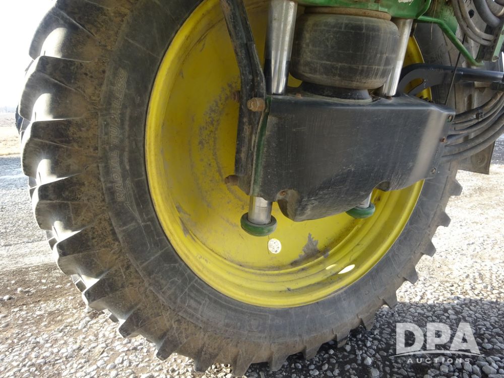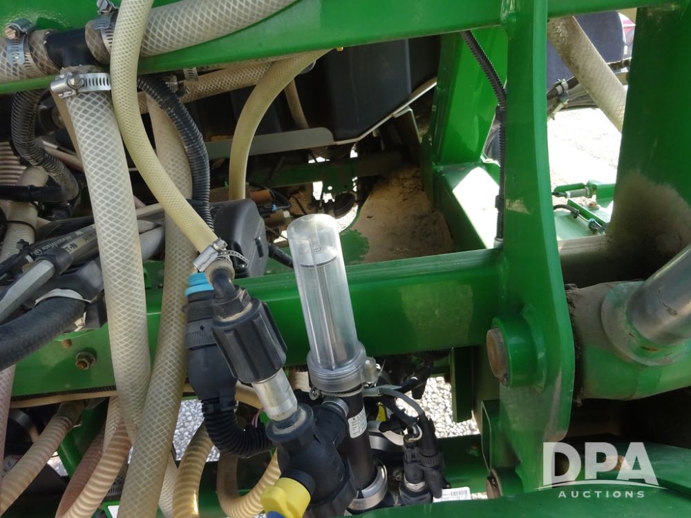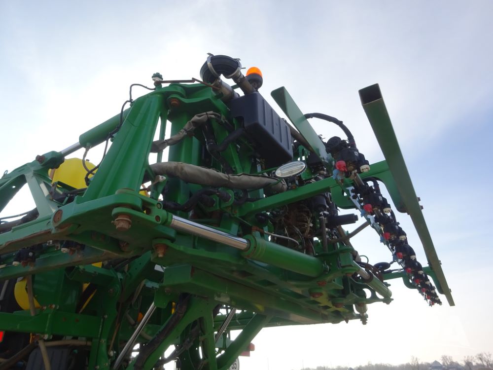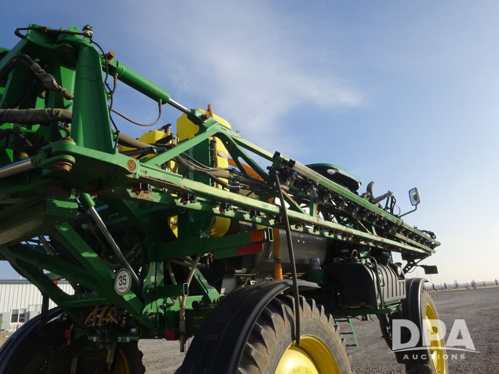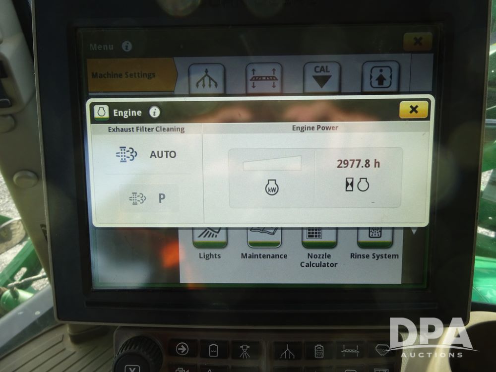 2019 John Deere R4038 Sprayer (PZ14367, Unit 3714), John Deere diesel engine (RG6090U066827), hydrostatic transmission, air conditioning, heat, Am/Fm radio, leather seat, buddy seat, beacon lights, 1000 gallon stainless steel liquid system, 100' boom, rear poly rinse tank, 4 - 50 gallon poly direct injection tanks, 2 - Raven Sidekick Pro pumps, stainless steel chemical inductor, automatic solution control, front fill, Firestone & Michelin IF380/90R46 tires, fenders, John Deere StarFire 6000 globe, John Deere monitor, shows 2,977 hours.