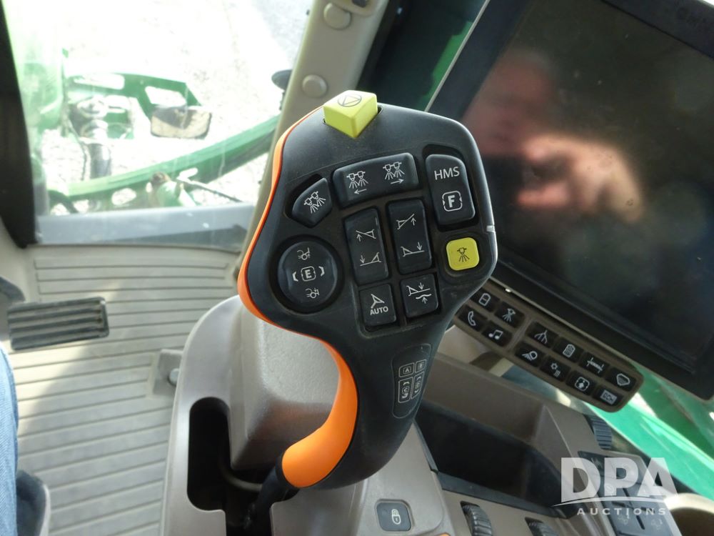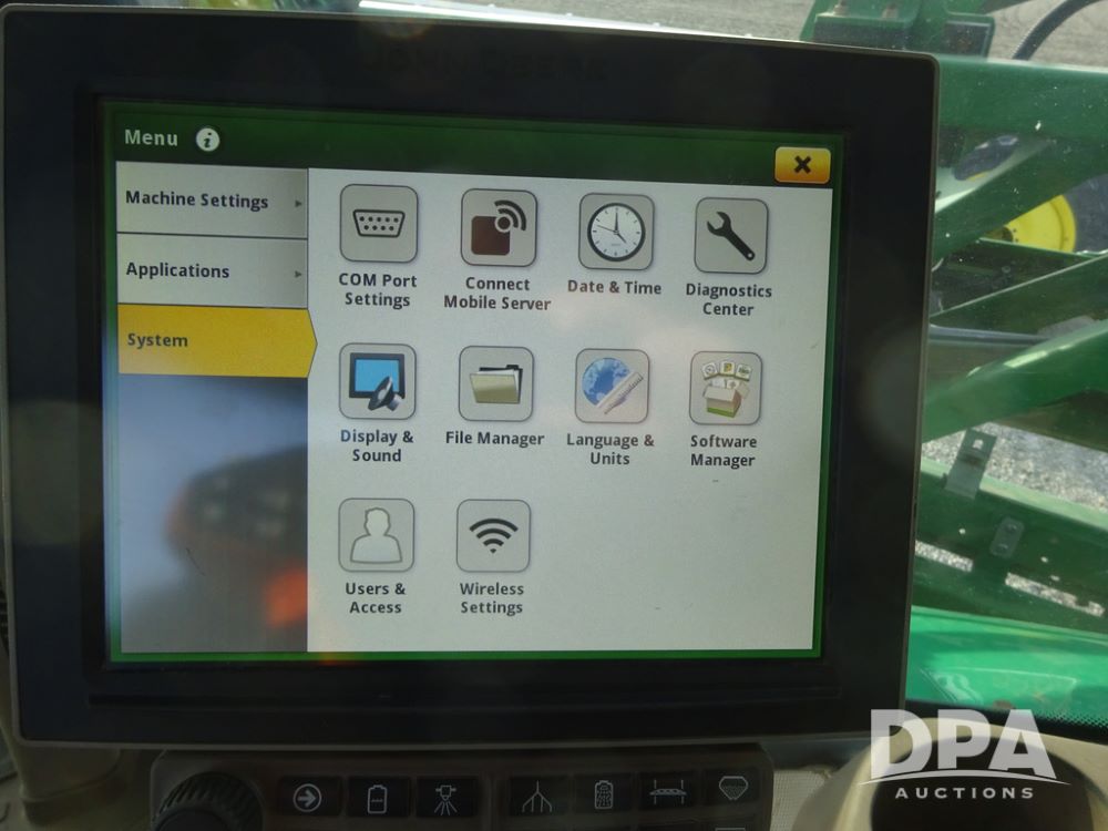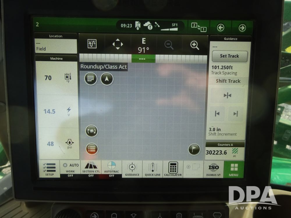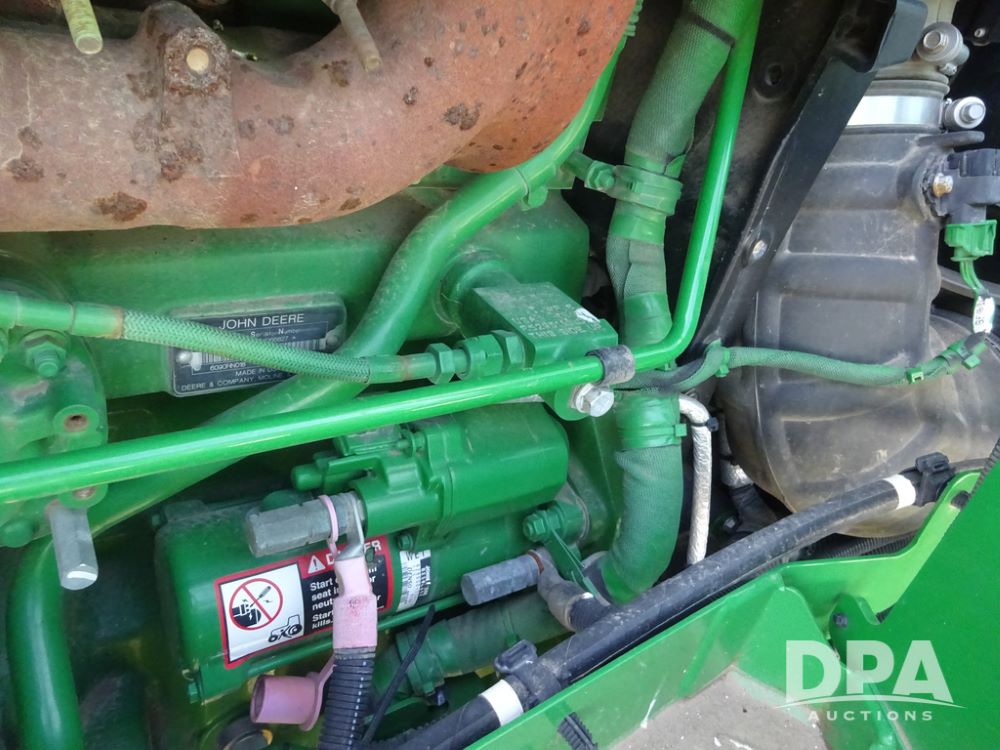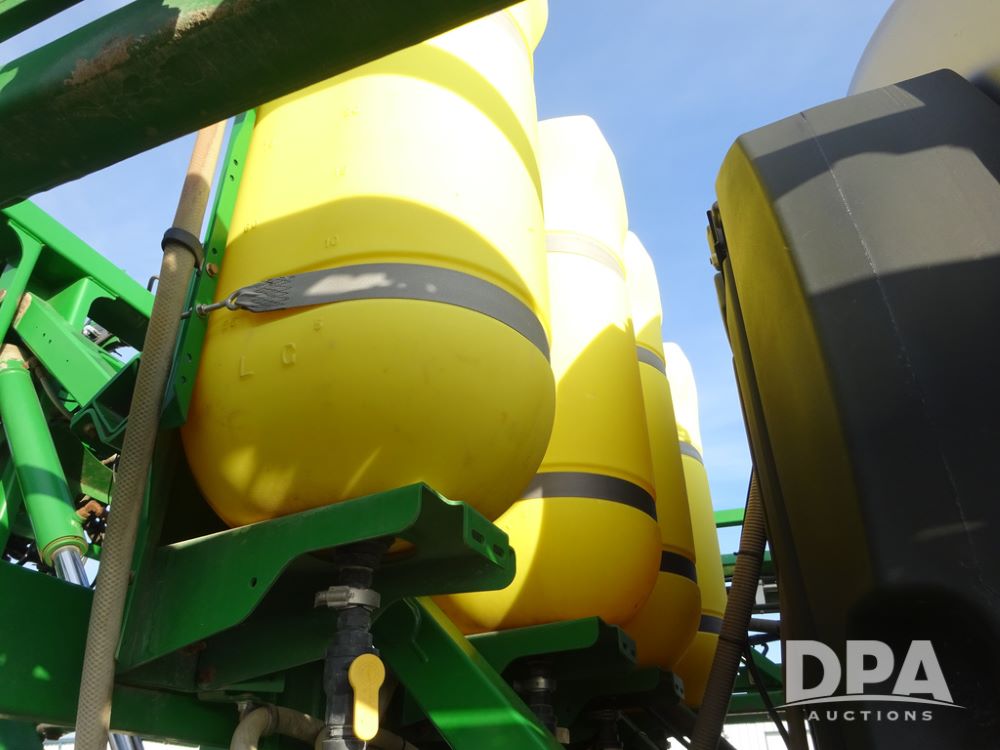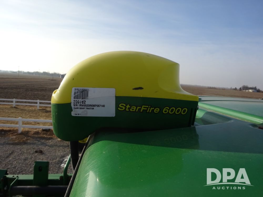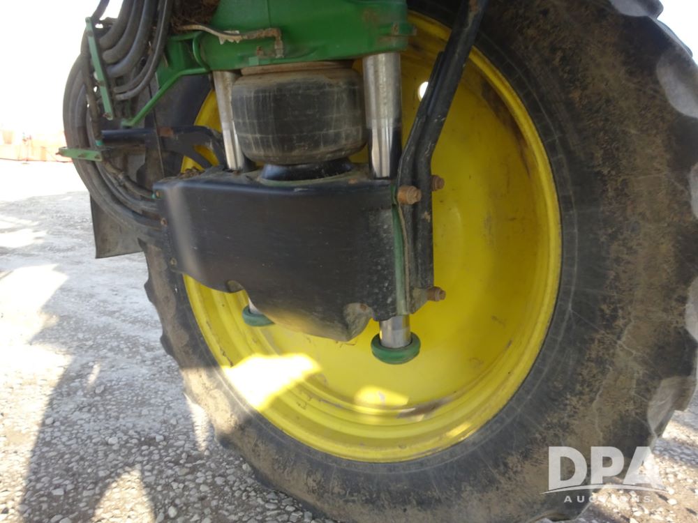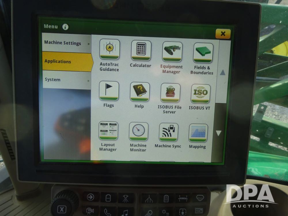 2019 John Deere R4038 Sprayer (PZ14367, Unit 3714), John Deere diesel engine (RG6090U066827), hydrostatic transmission, air conditioning, heat, Am/Fm radio, leather seat, buddy seat, beacon lights, 1000 gallon stainless steel liquid system, 100' boom, rear poly rinse tank, 4 - 50 gallon poly direct injection tanks, 2 - Raven Sidekick Pro pumps, stainless steel chemical inductor, automatic solution control, front fill, Firestone & Michelin IF380/90R46 tires, fenders, John Deere StarFire 6000 globe, John Deere monitor, shows 2,977 hours.