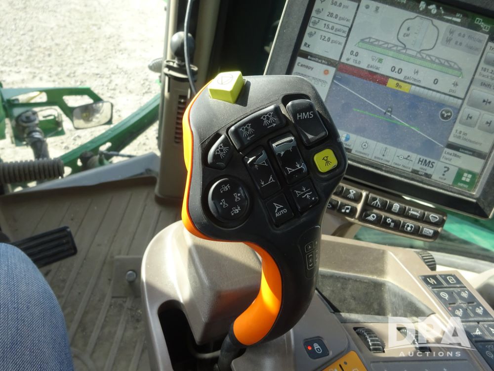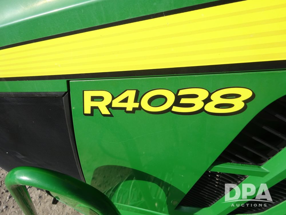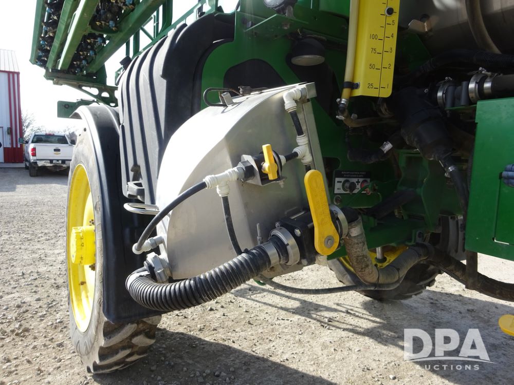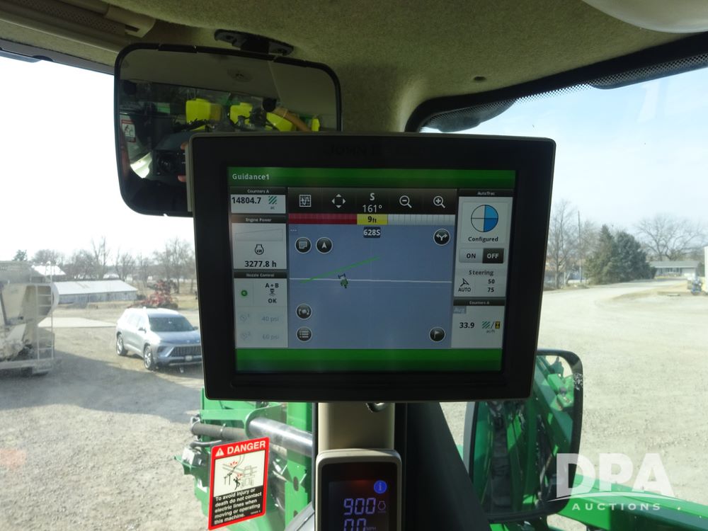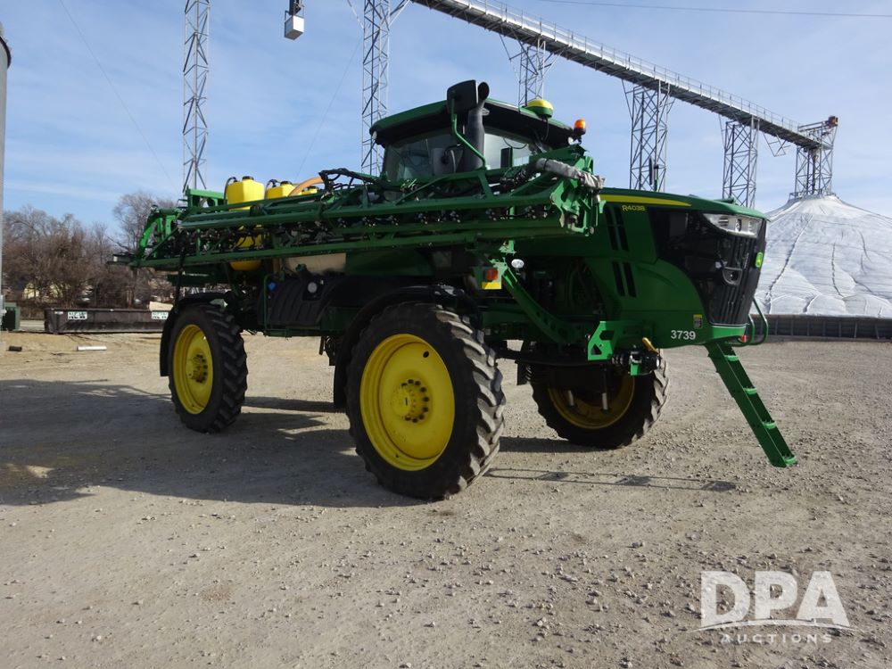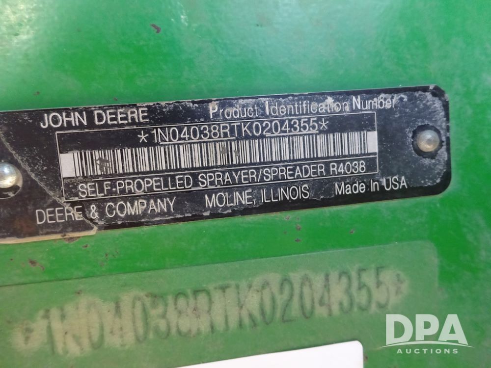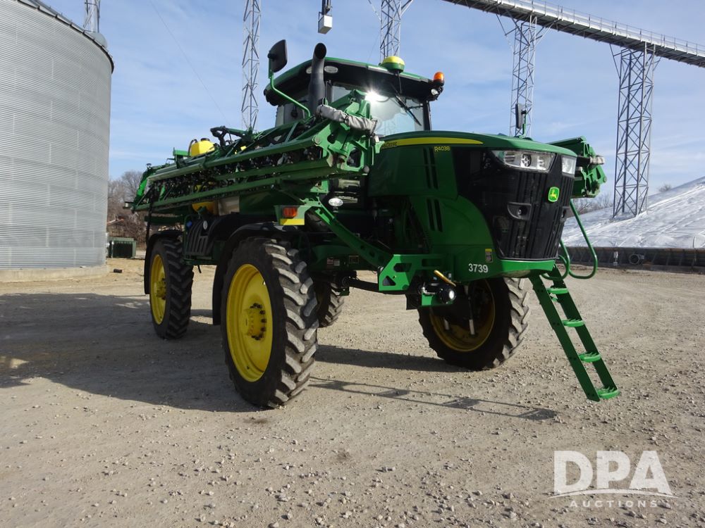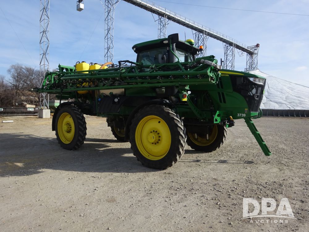 2020 John Deere R4038 Sprayer (PZ14369, Unit 3739), John Deere diesel engine (S/N RG6090U079131), hydrostatic transmission, air conditioning, heat, Am/Fm radio, leather seat, buddy seat, beacon lights, 1000 gallon stainless steel liquid system, 100' boom, rear poly rinse tank, 4 - 50 gallon poly direct injection tanks, 2 - Raven Sidekick Pro pumps, stainless steel chemical inductor, automatic solution control, front fill, Firestone IF380/90R46 tires, fenders, John Deere StarFire 6000 globe, John Deere monitor, shows 3,277 hours.