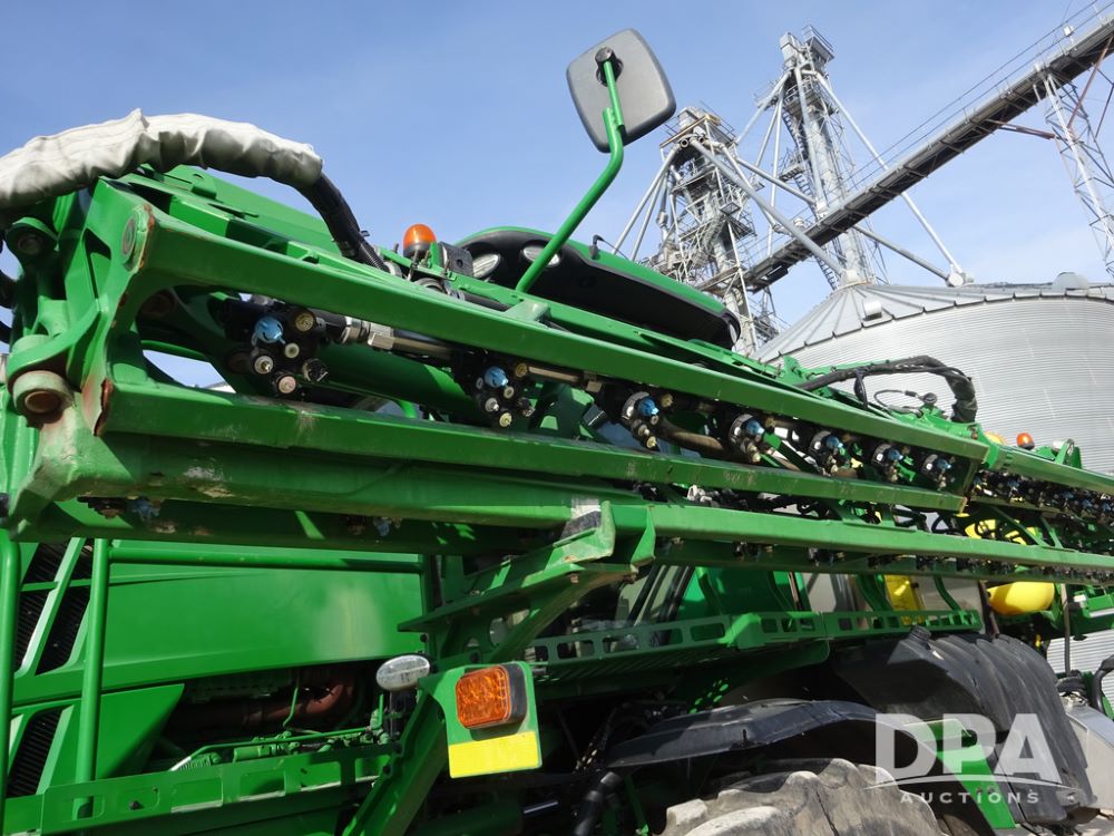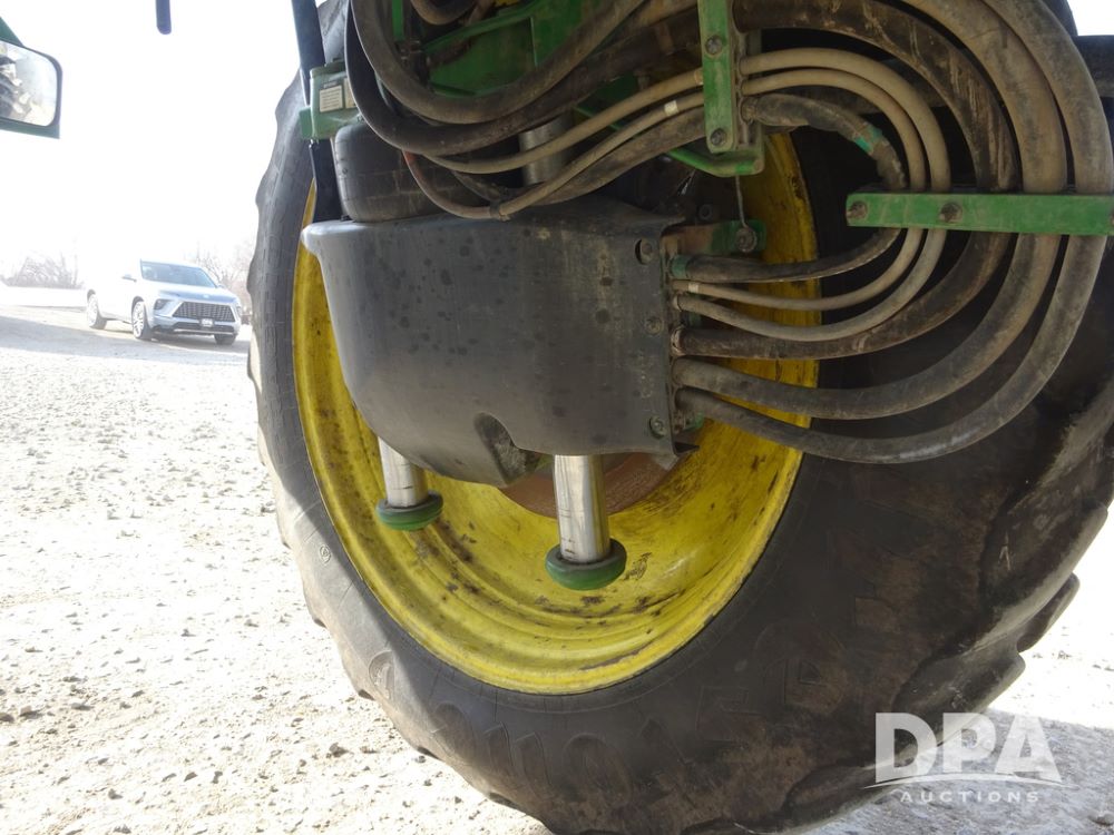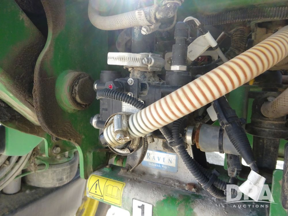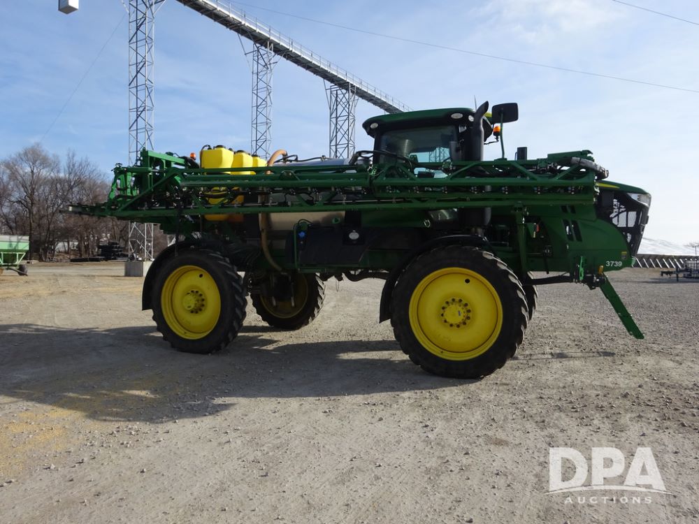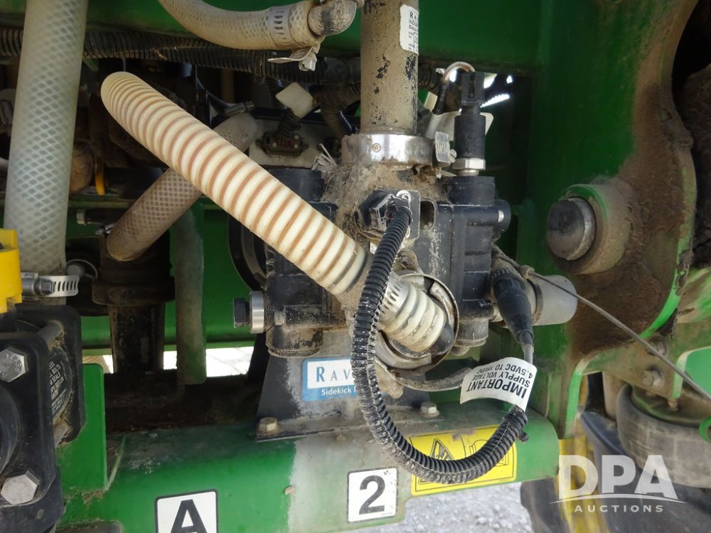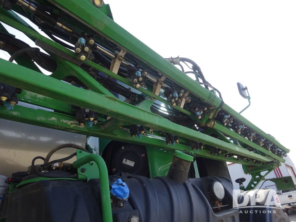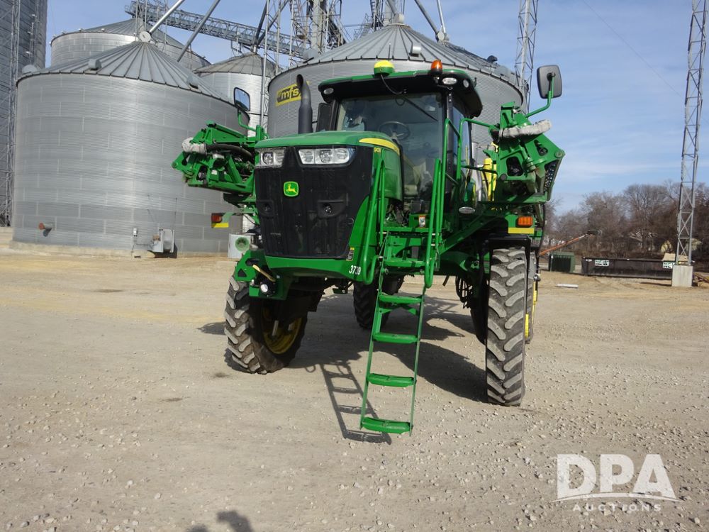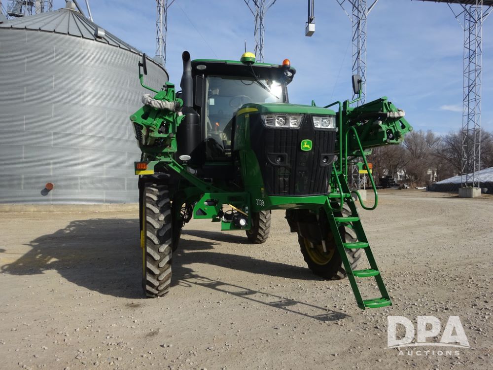 2020 John Deere R4038 Sprayer (PZ14369, Unit 3739), John Deere diesel engine (S/N RG6090U079131), hydrostatic transmission, air conditioning, heat, Am/Fm radio, leather seat, buddy seat, beacon lights, 1000 gallon stainless steel liquid system, 100' boom, rear poly rinse tank, 4 - 50 gallon poly direct injection tanks, 2 - Raven Sidekick Pro pumps, stainless steel chemical inductor, automatic solution control, front fill, Firestone IF380/90R46 tires, fenders, John Deere StarFire 6000 globe, John Deere monitor, shows 3,277 hours.