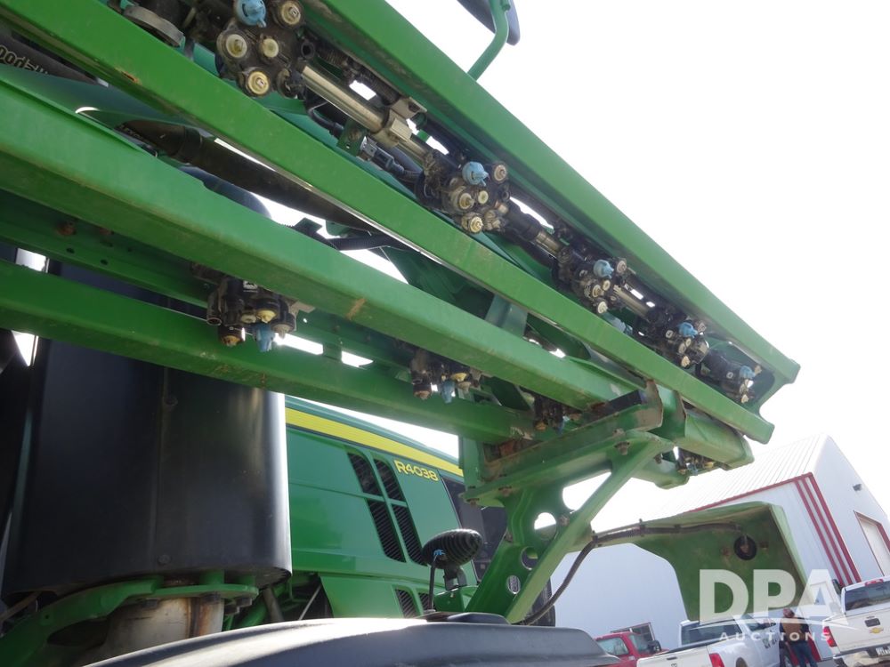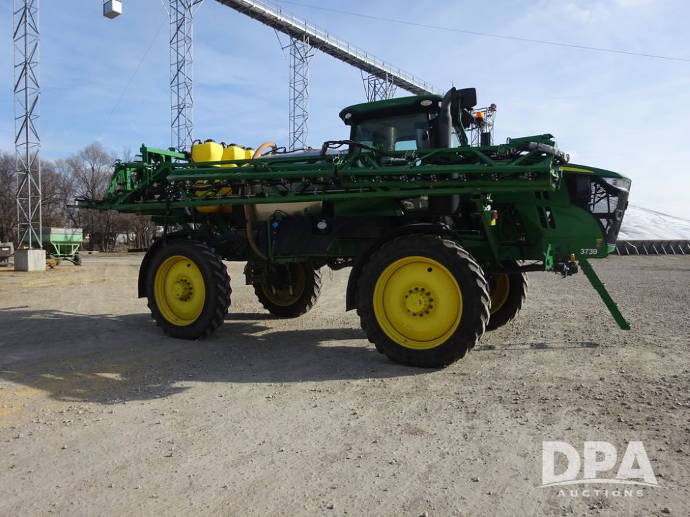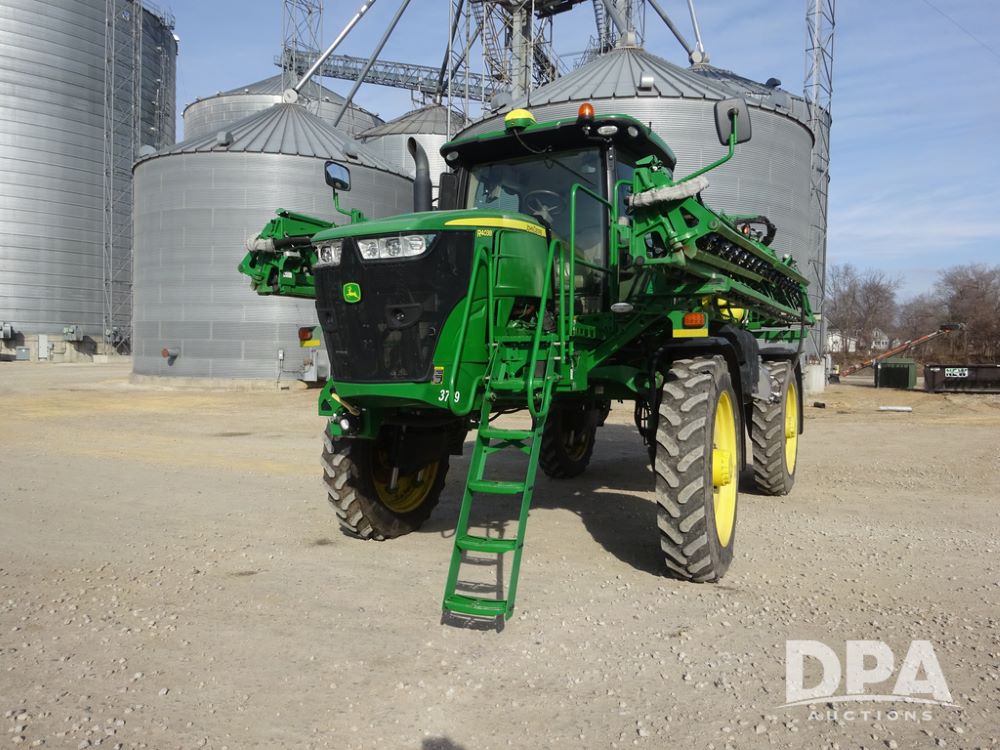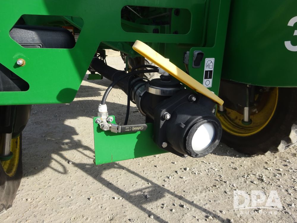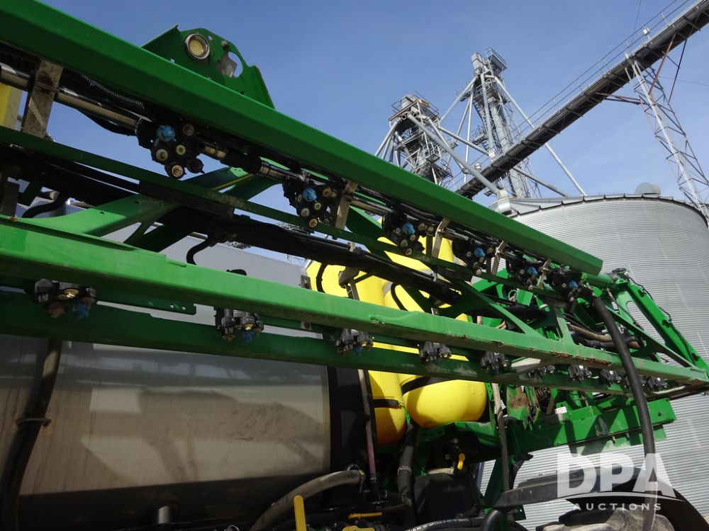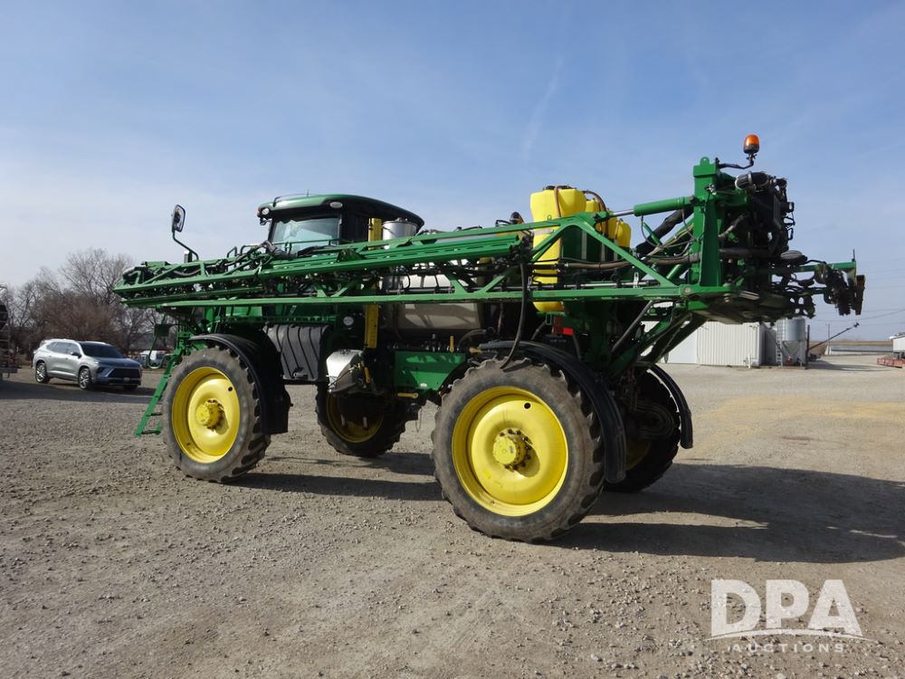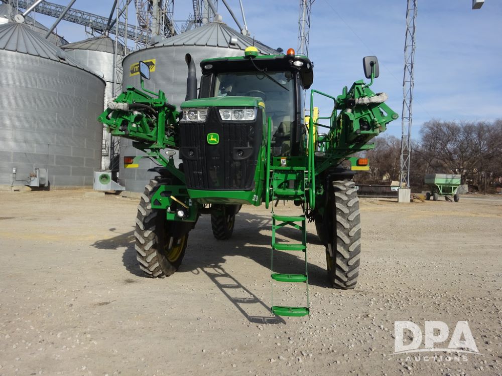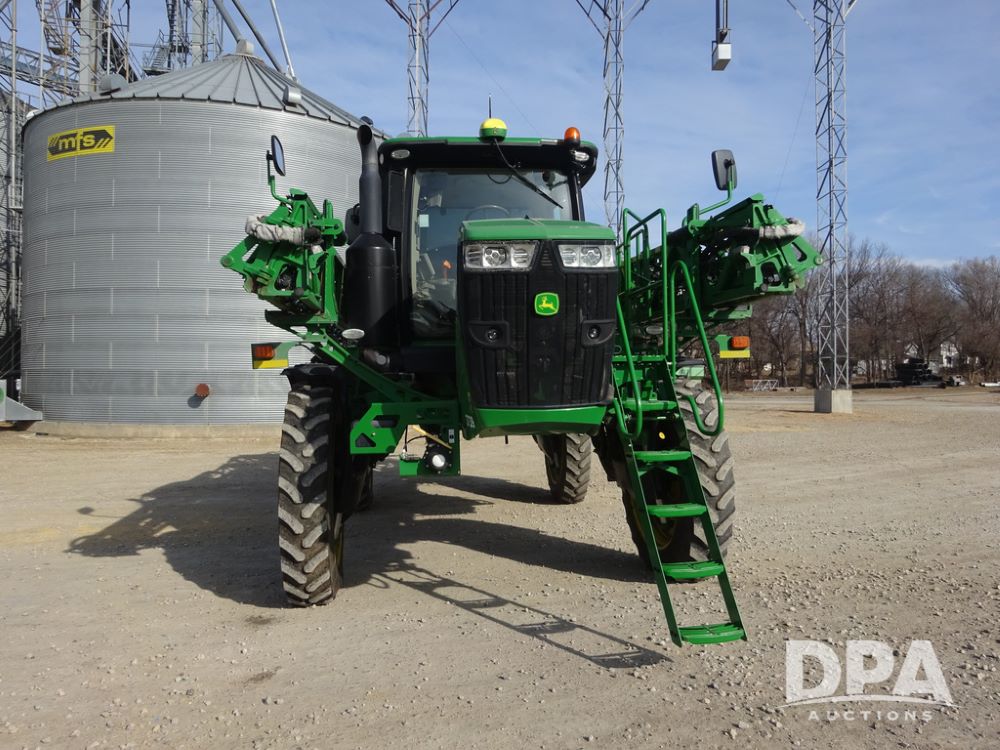 2020 John Deere R4038 Sprayer (PZ14369, Unit 3739), John Deere diesel engine (S/N RG6090U079131), hydrostatic transmission, air conditioning, heat, Am/Fm radio, leather seat, buddy seat, beacon lights, 1000 gallon stainless steel liquid system, 100' boom, rear poly rinse tank, 4 - 50 gallon poly direct injection tanks, 2 - Raven Sidekick Pro pumps, stainless steel chemical inductor, automatic solution control, front fill, Firestone IF380/90R46 tires, fenders, John Deere StarFire 6000 globe, John Deere monitor, shows 3,277 hours.