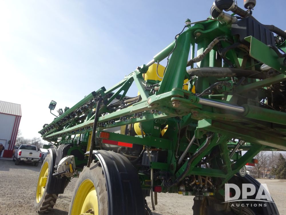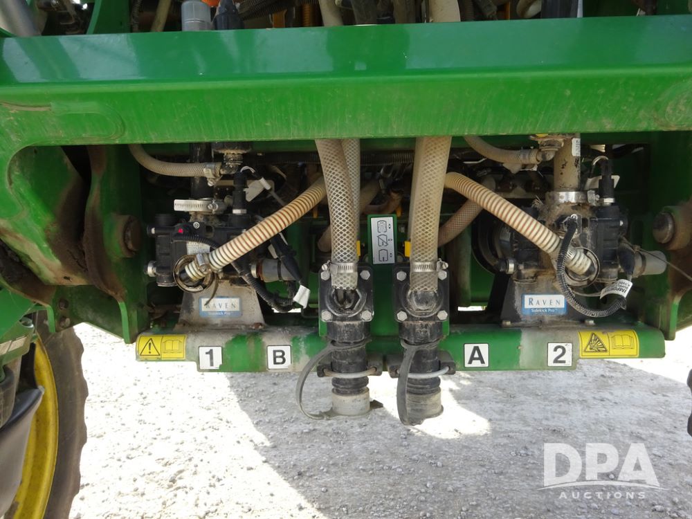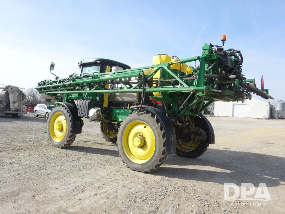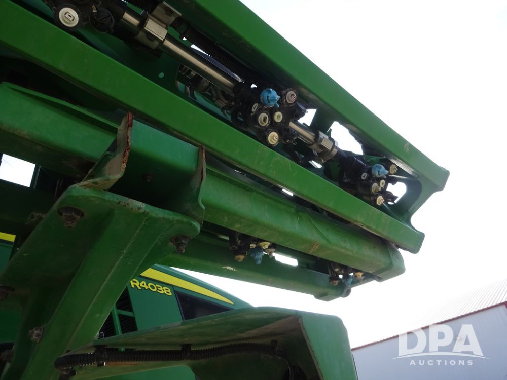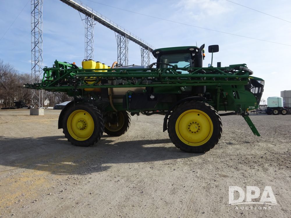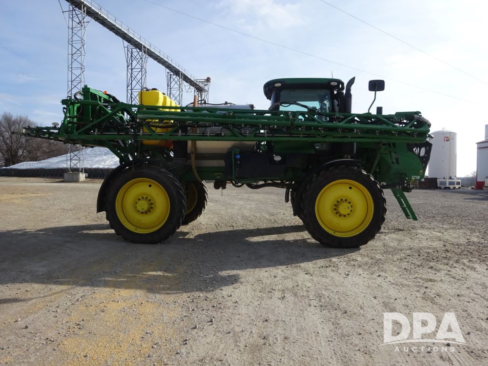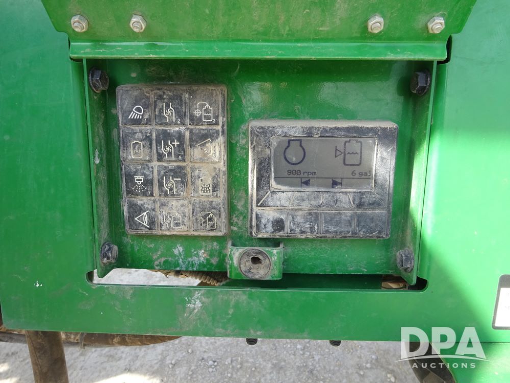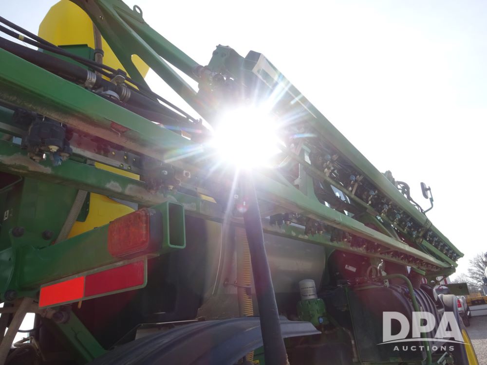 2020 John Deere R4038 Sprayer (PZ14369, Unit 3739), John Deere diesel engine (S/N RG6090U079131), hydrostatic transmission, air conditioning, heat, Am/Fm radio, leather seat, buddy seat, beacon lights, 1000 gallon stainless steel liquid system, 100' boom, rear poly rinse tank, 4 - 50 gallon poly direct injection tanks, 2 - Raven Sidekick Pro pumps, stainless steel chemical inductor, automatic solution control, front fill, Firestone IF380/90R46 tires, fenders, John Deere StarFire 6000 globe, John Deere monitor, shows 3,277 hours.
