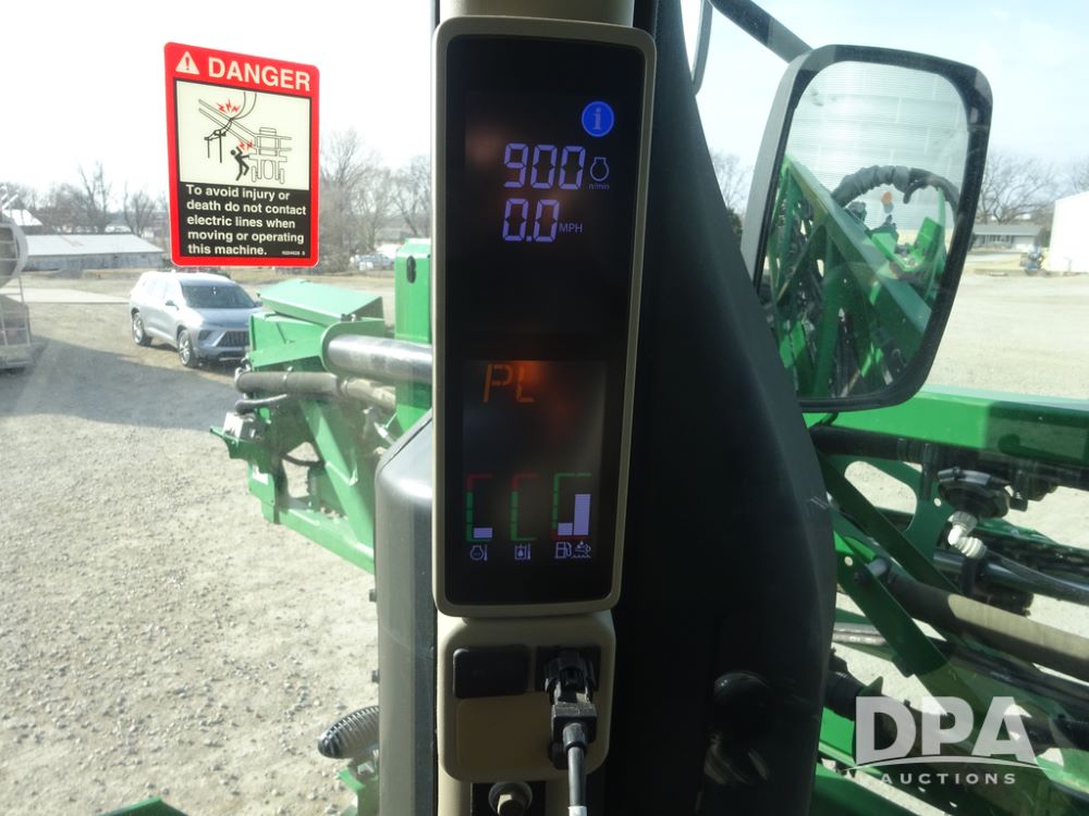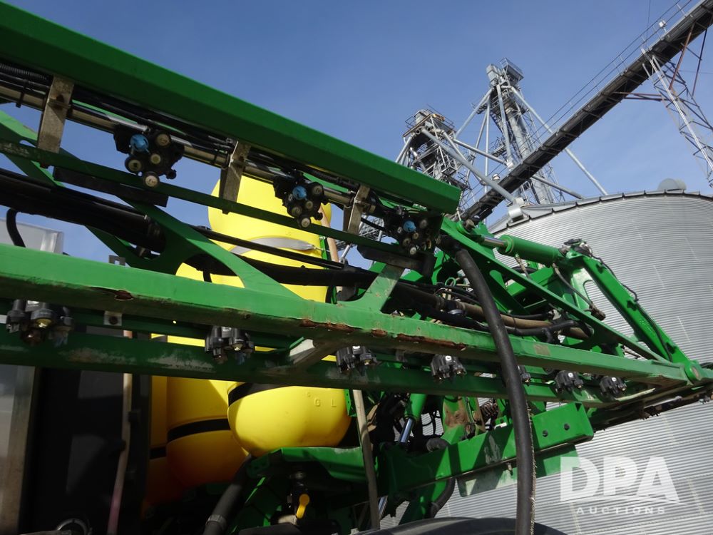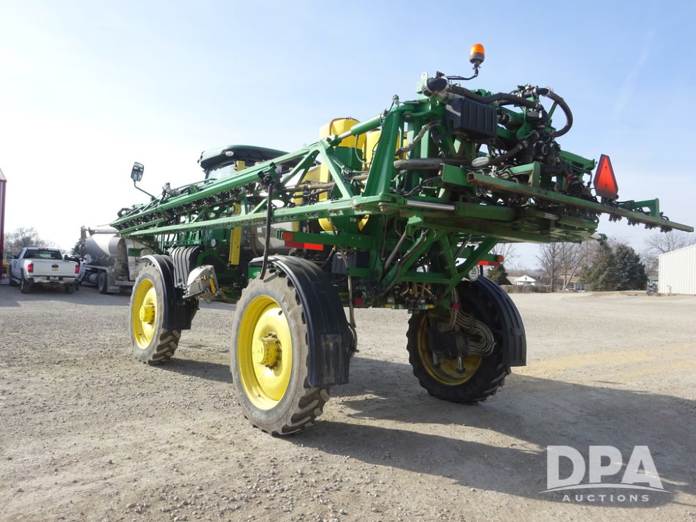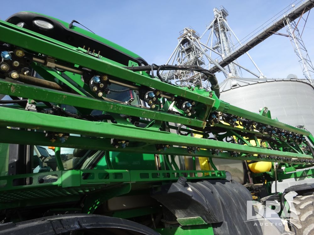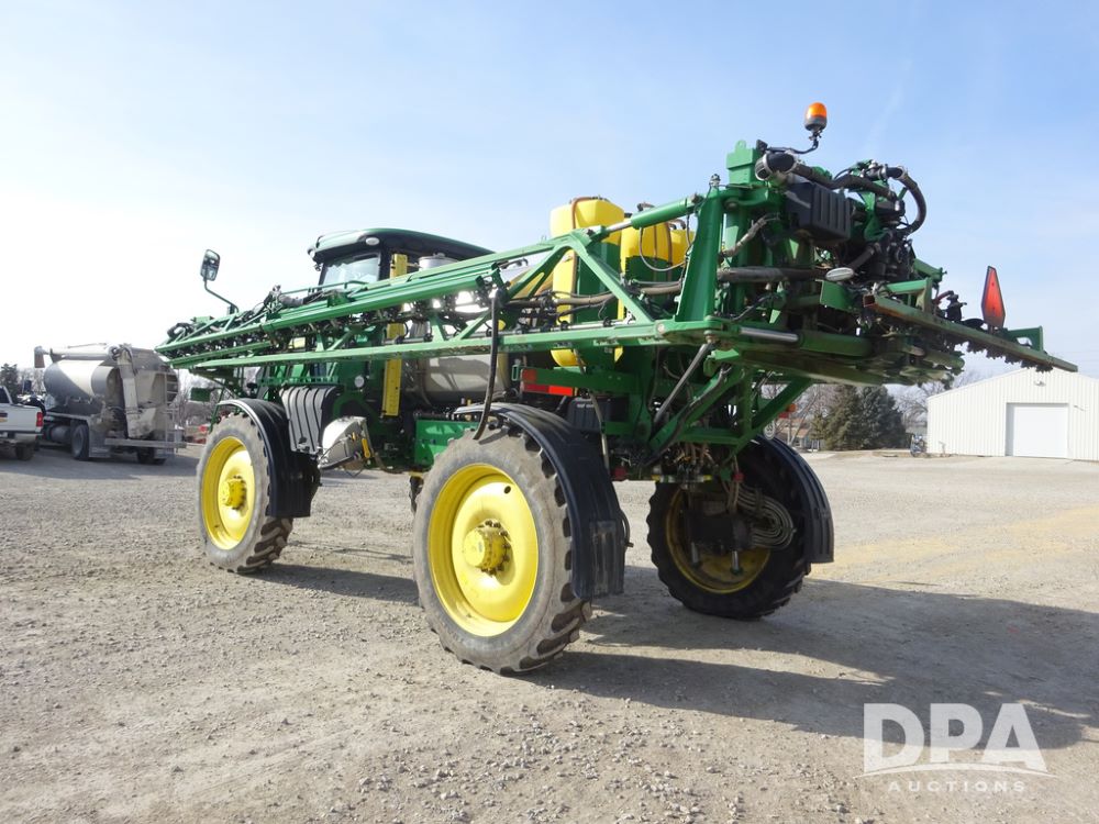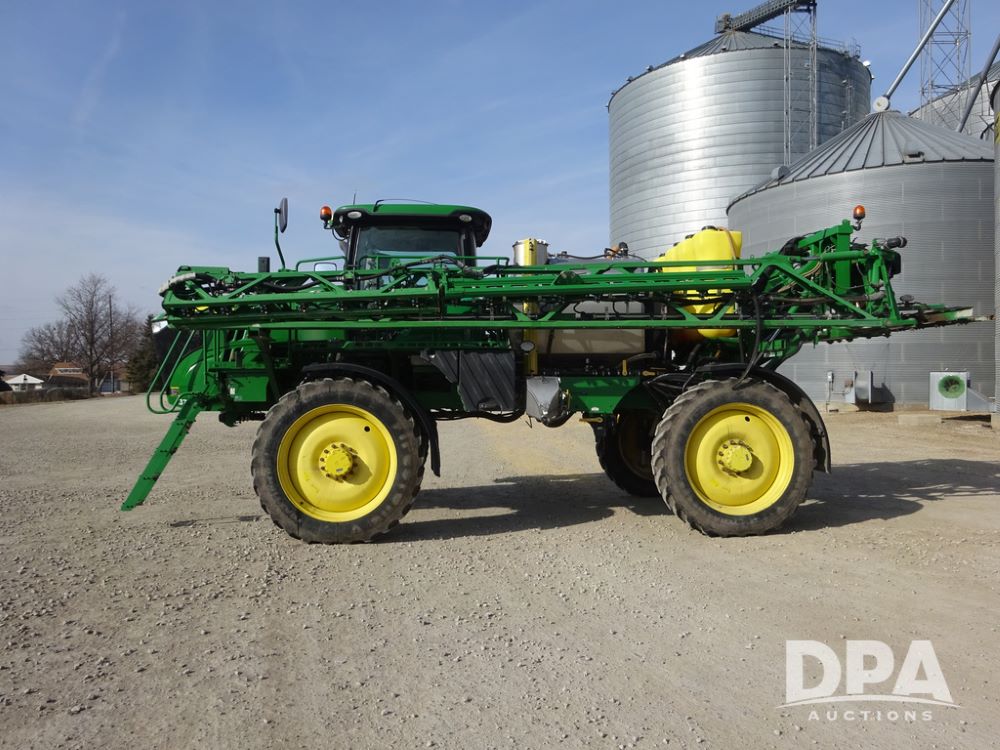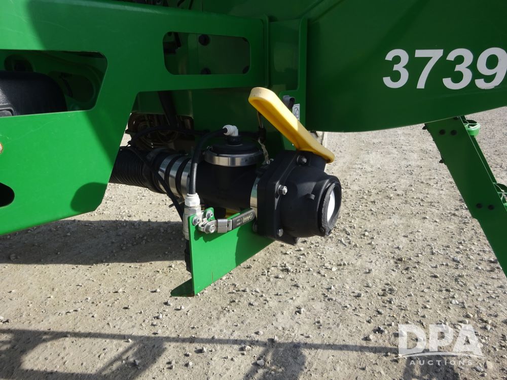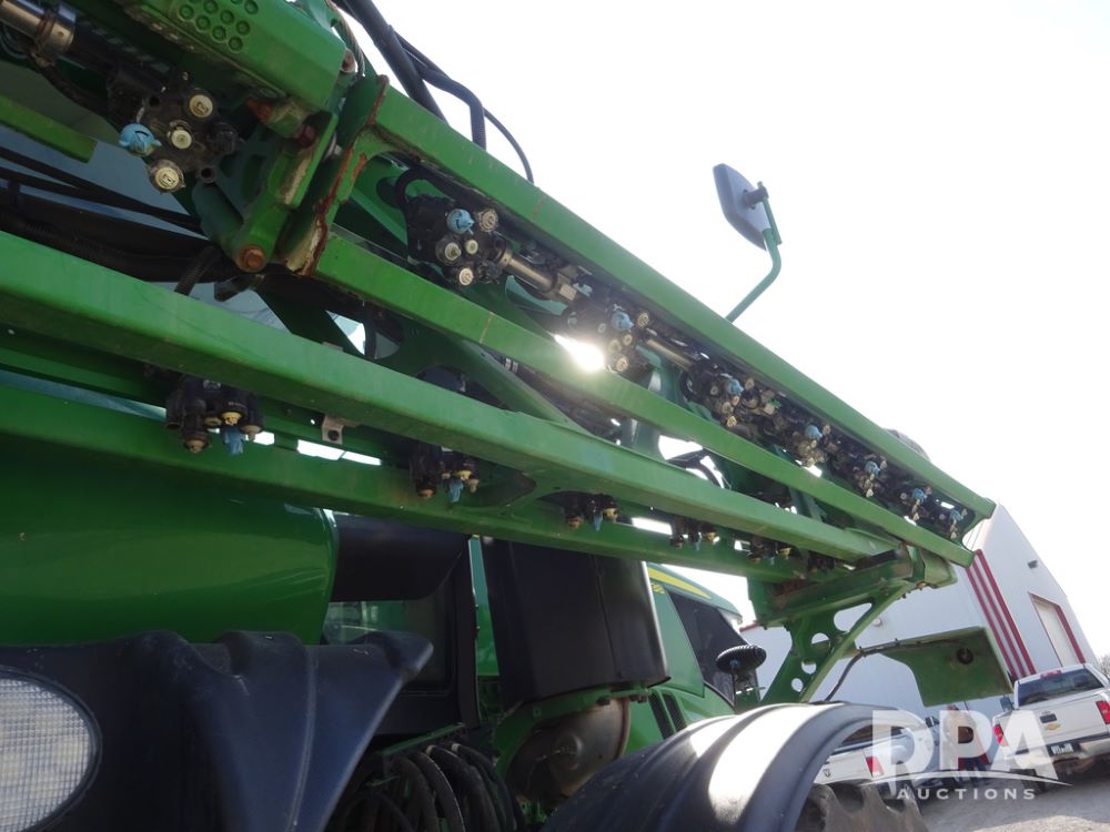 2020 John Deere R4038 Sprayer (PZ14369, Unit 3739), John Deere diesel engine (S/N RG6090U079131), hydrostatic transmission, air conditioning, heat, Am/Fm radio, leather seat, buddy seat, beacon lights, 1000 gallon stainless steel liquid system, 100' boom, rear poly rinse tank, 4 - 50 gallon poly direct injection tanks, 2 - Raven Sidekick Pro pumps, stainless steel chemical inductor, automatic solution control, front fill, Firestone IF380/90R46 tires, fenders, John Deere StarFire 6000 globe, John Deere monitor, shows 3,277 hours.