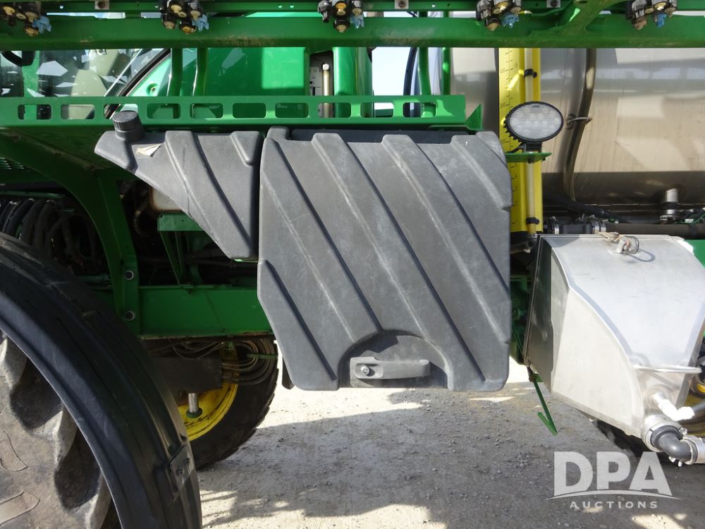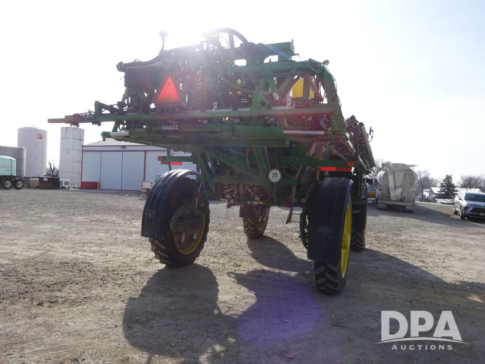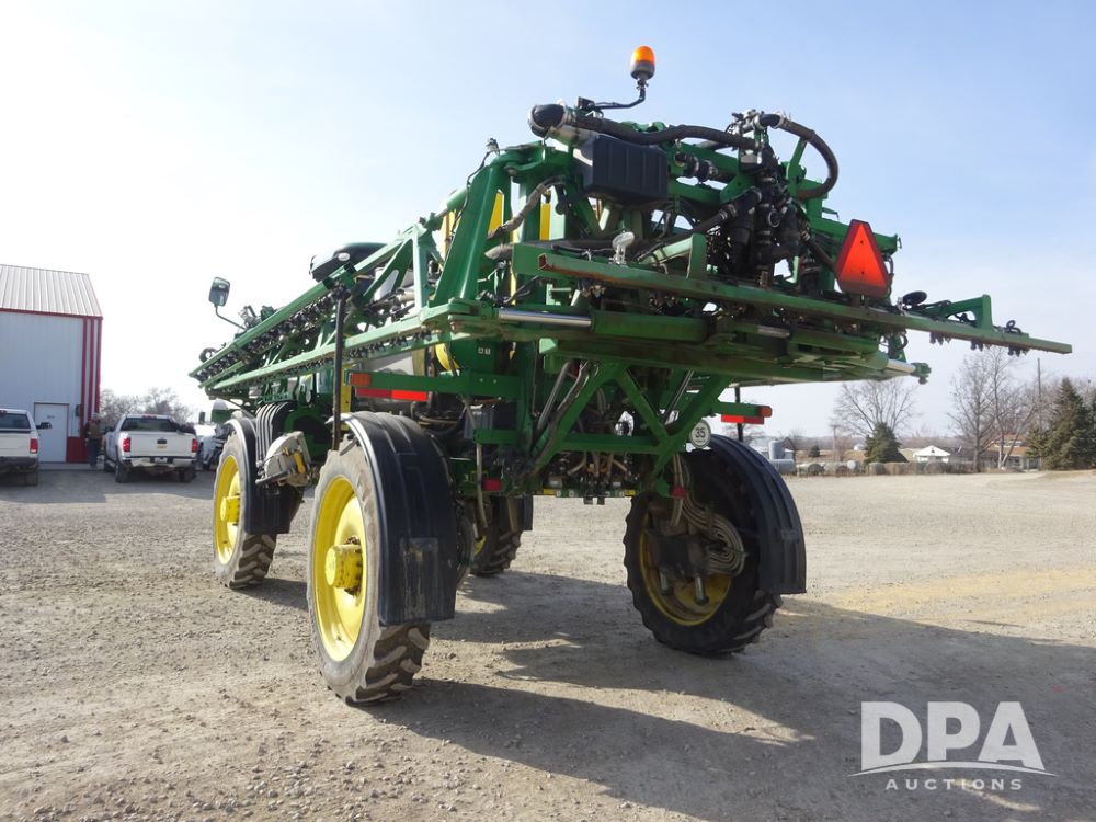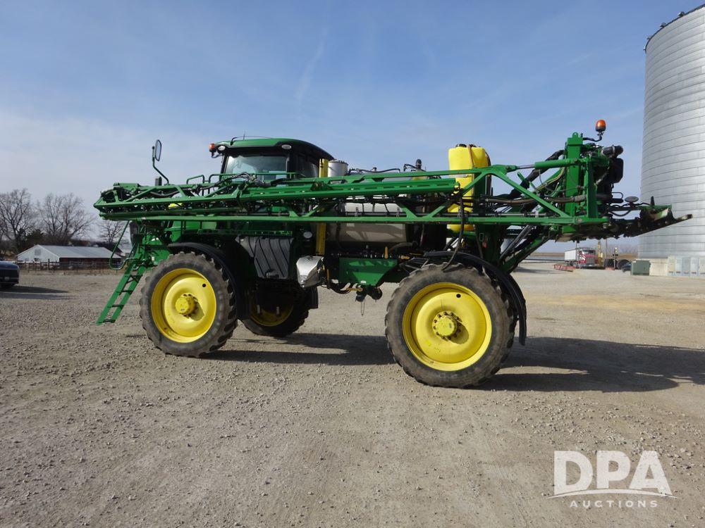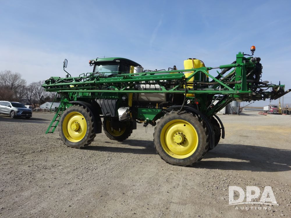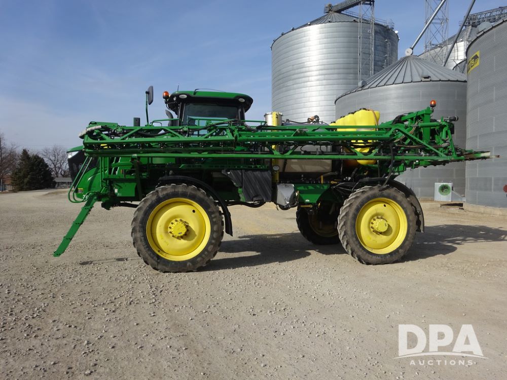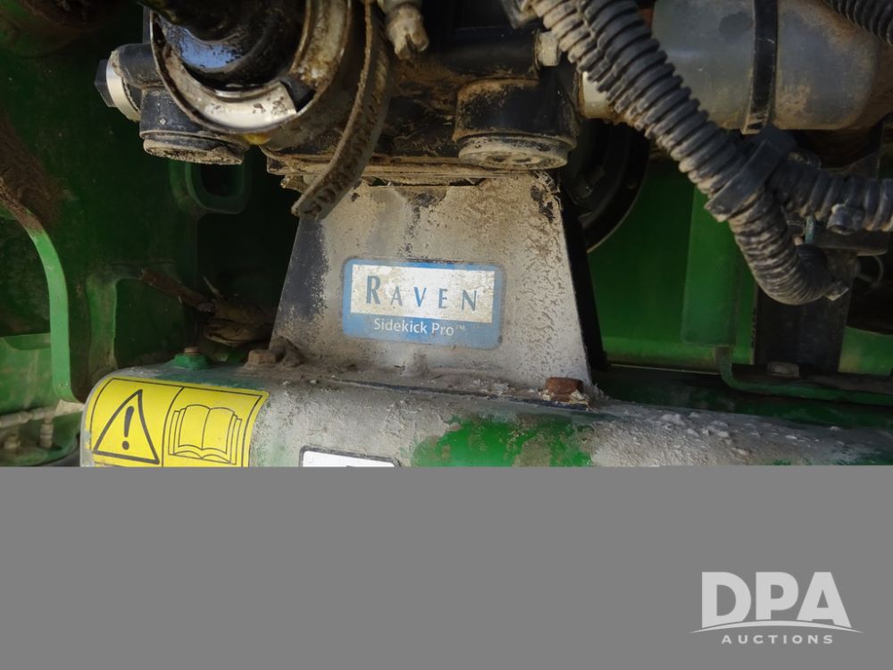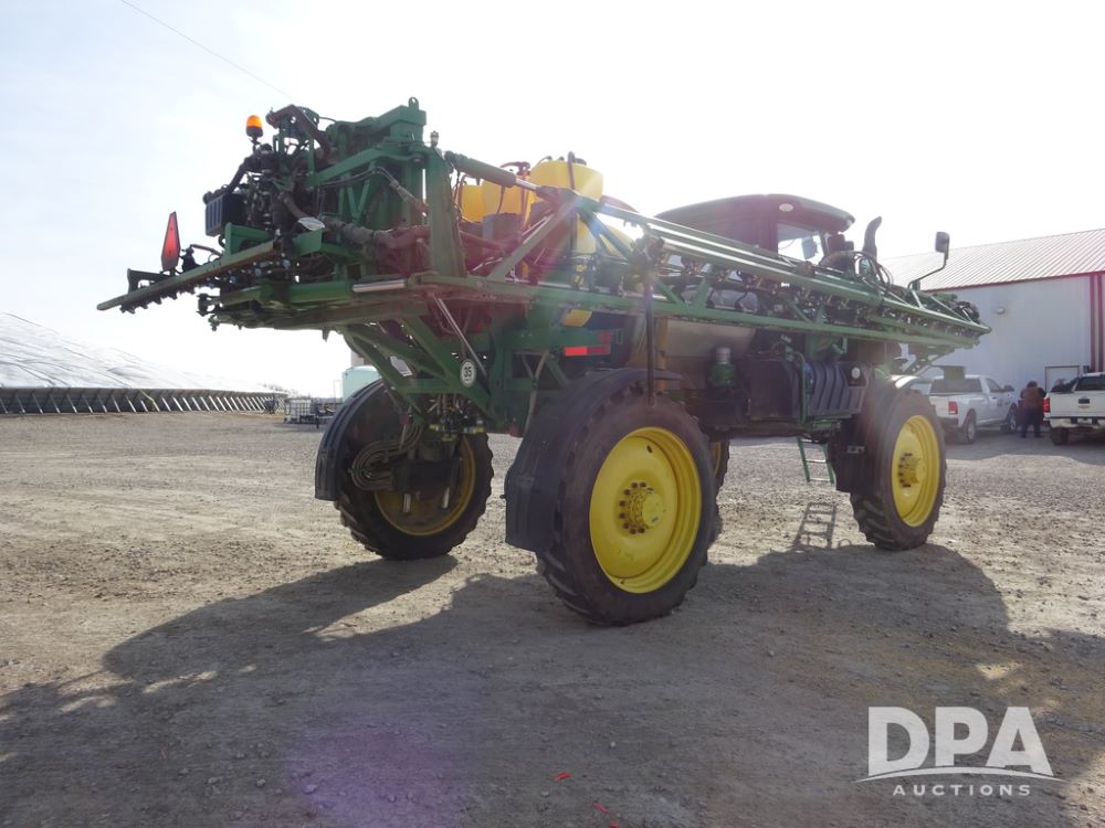 2020 John Deere R4038 Sprayer (PZ14369, Unit 3739), John Deere diesel engine (S/N RG6090U079131), hydrostatic transmission, air conditioning, heat, Am/Fm radio, leather seat, buddy seat, beacon lights, 1000 gallon stainless steel liquid system, 100' boom, rear poly rinse tank, 4 - 50 gallon poly direct injection tanks, 2 - Raven Sidekick Pro pumps, stainless steel chemical inductor, automatic solution control, front fill, Firestone IF380/90R46 tires, fenders, John Deere StarFire 6000 globe, John Deere monitor, shows 3,277 hours.