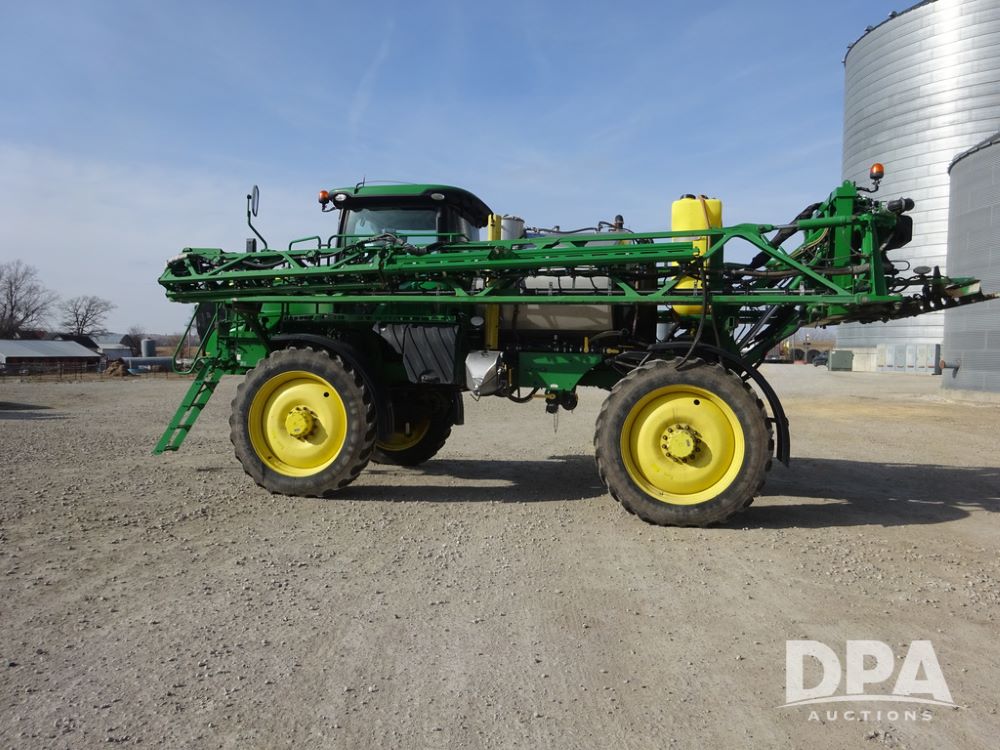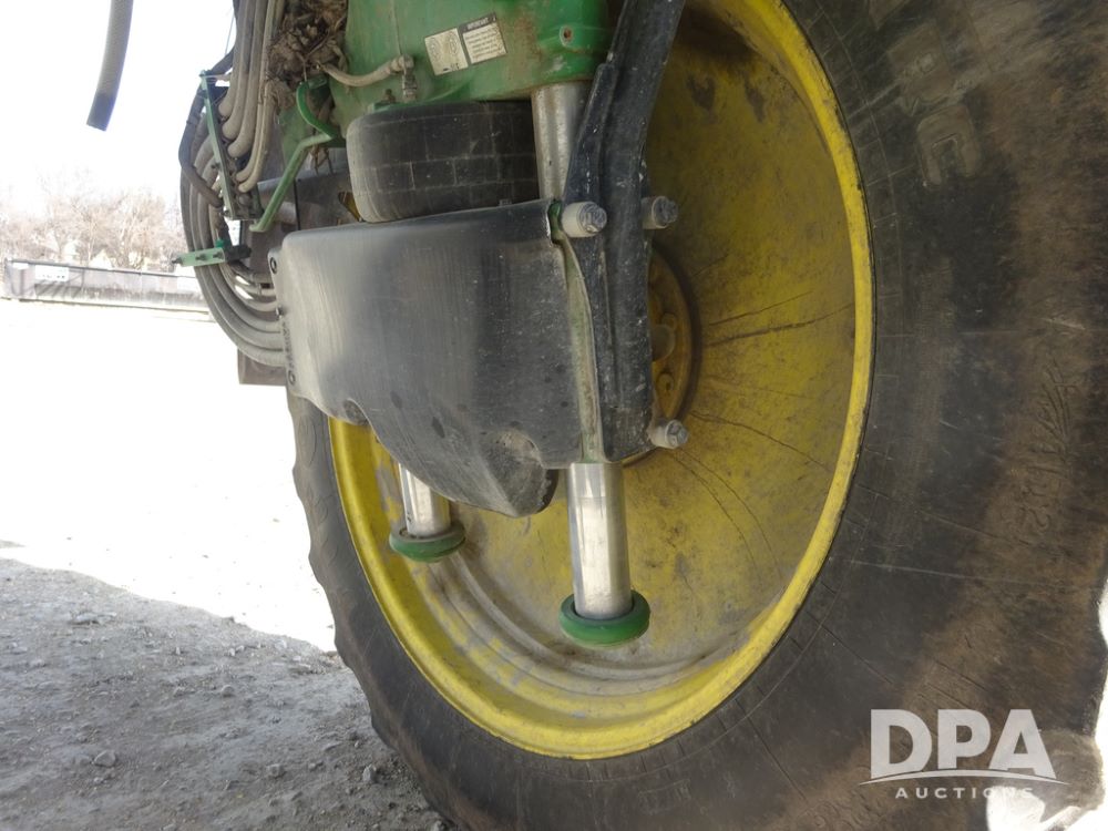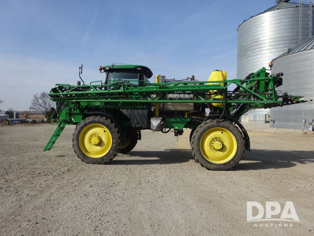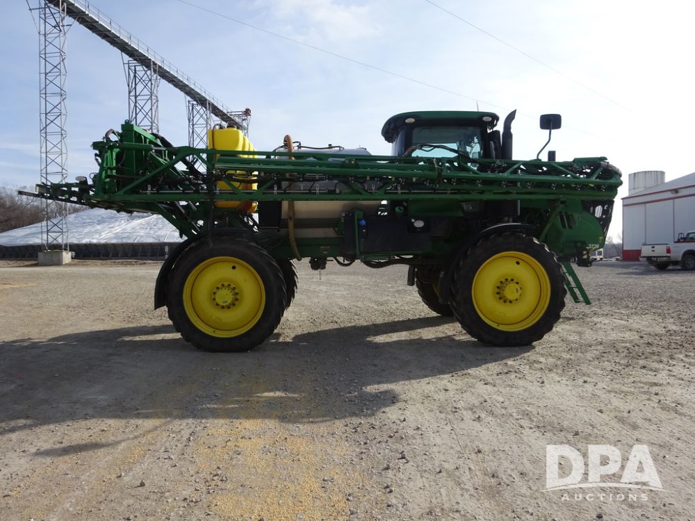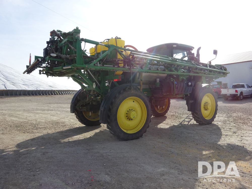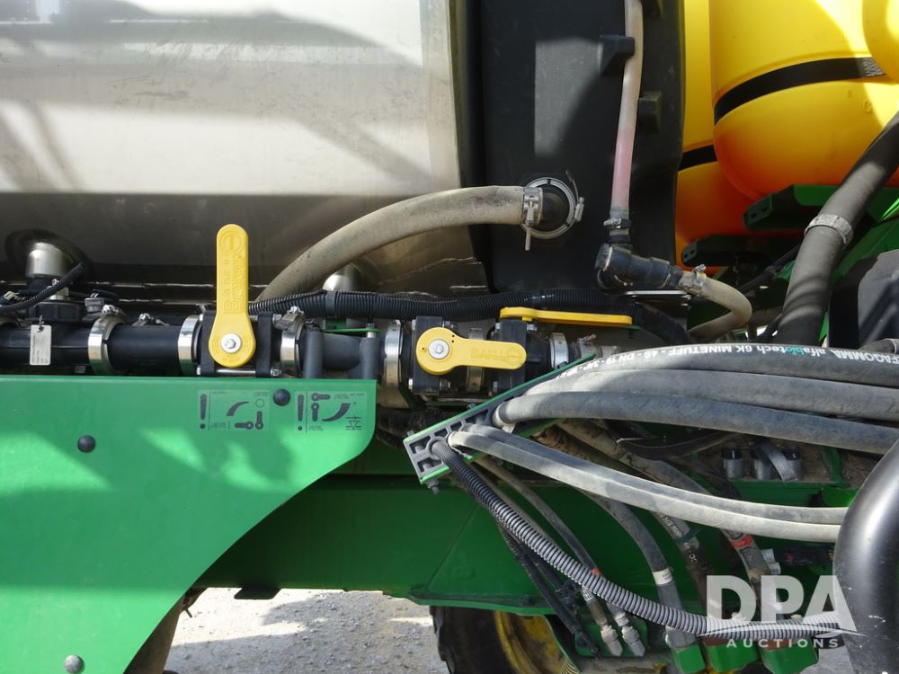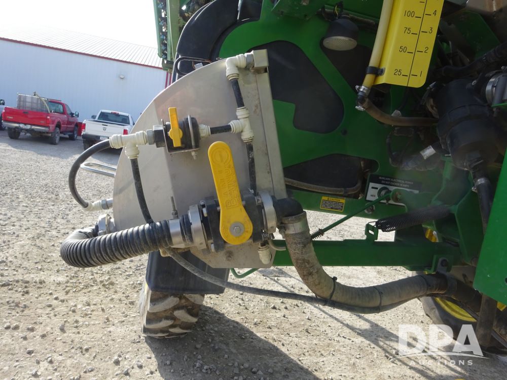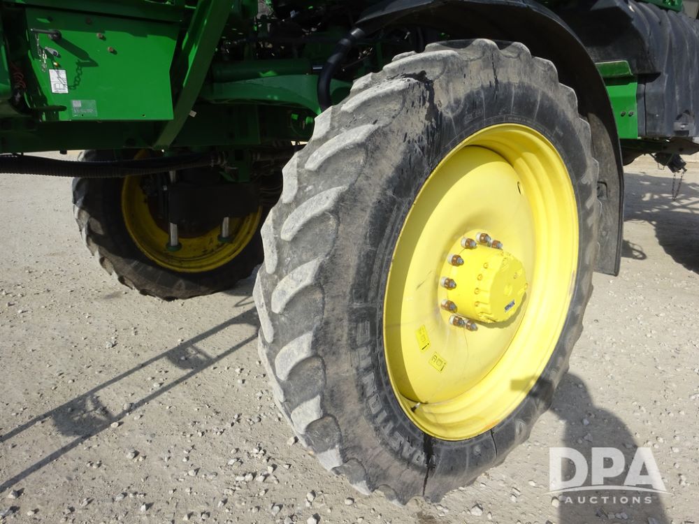 2020 John Deere R4038 Sprayer (PZ14369, Unit 3739), John Deere diesel engine (S/N RG6090U079131), hydrostatic transmission, air conditioning, heat, Am/Fm radio, leather seat, buddy seat, beacon lights, 1000 gallon stainless steel liquid system, 100' boom, rear poly rinse tank, 4 - 50 gallon poly direct injection tanks, 2 - Raven Sidekick Pro pumps, stainless steel chemical inductor, automatic solution control, front fill, Firestone IF380/90R46 tires, fenders, John Deere StarFire 6000 globe, John Deere monitor, shows 3,277 hours.