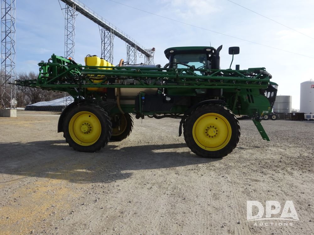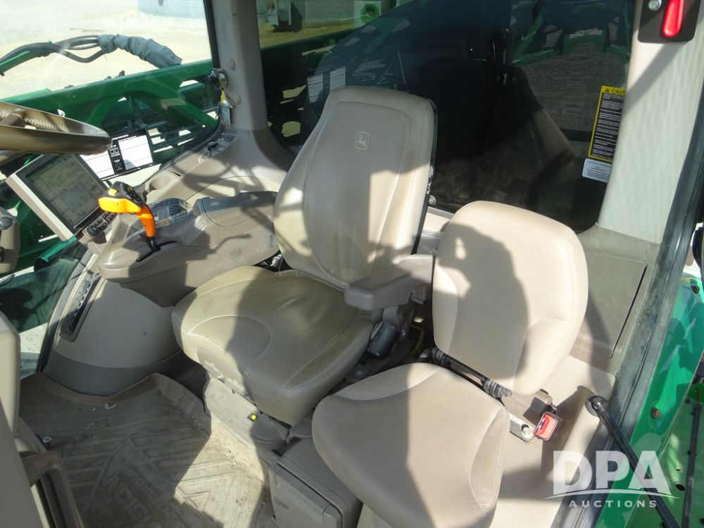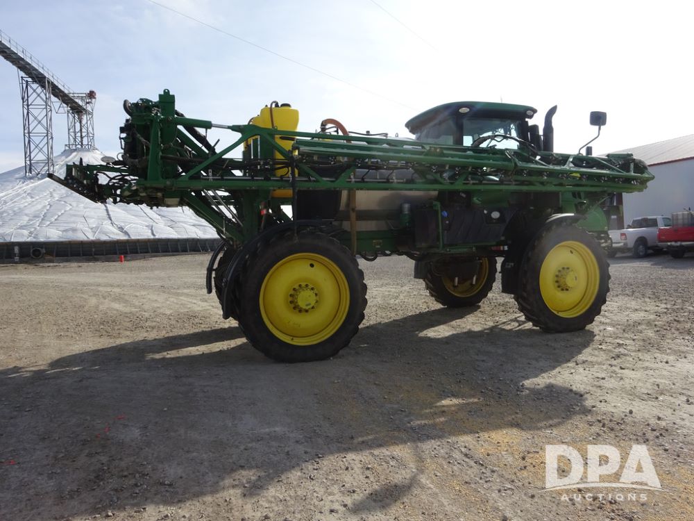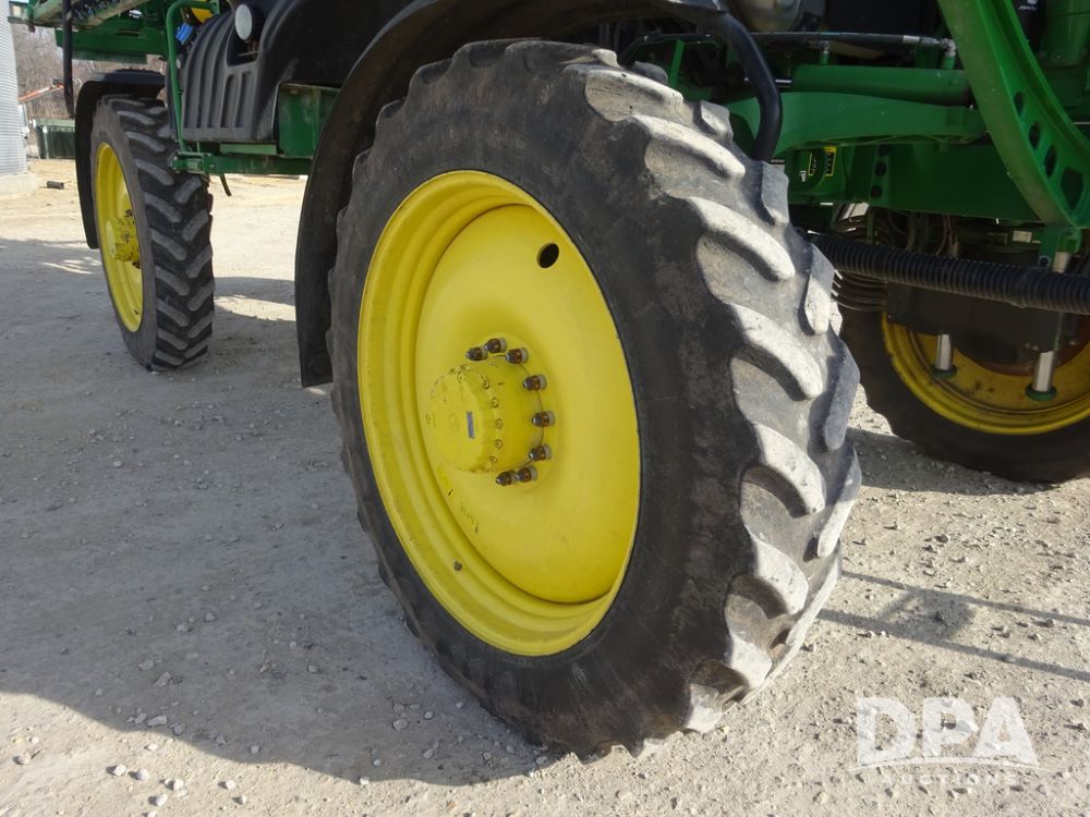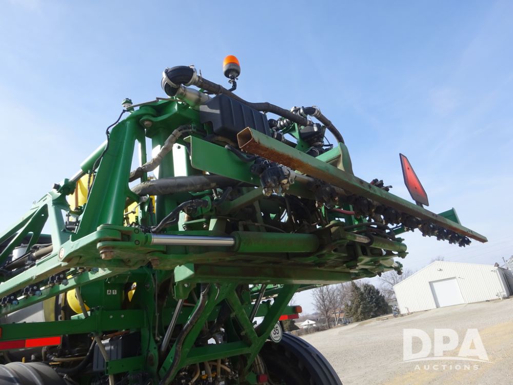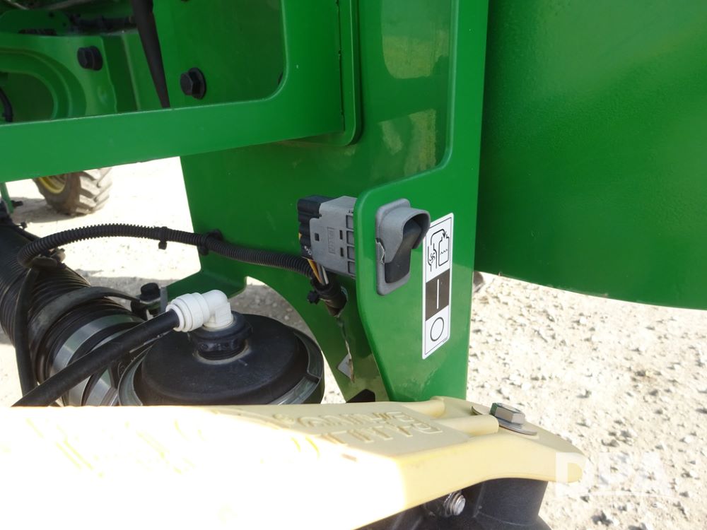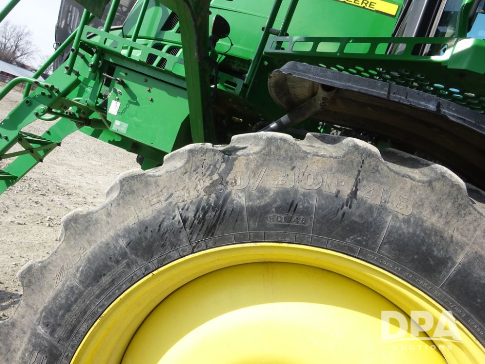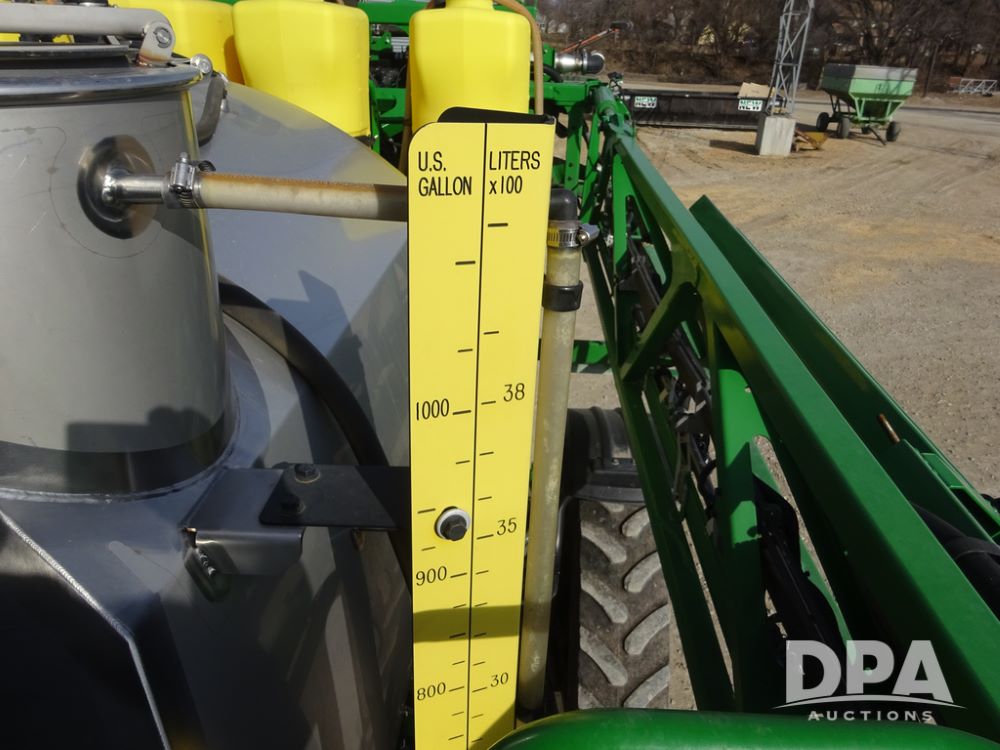 2020 John Deere R4038 Sprayer (PZ14369, Unit 3739), John Deere diesel engine (S/N RG6090U079131), hydrostatic transmission, air conditioning, heat, Am/Fm radio, leather seat, buddy seat, beacon lights, 1000 gallon stainless steel liquid system, 100' boom, rear poly rinse tank, 4 - 50 gallon poly direct injection tanks, 2 - Raven Sidekick Pro pumps, stainless steel chemical inductor, automatic solution control, front fill, Firestone IF380/90R46 tires, fenders, John Deere StarFire 6000 globe, John Deere monitor, shows 3,277 hours.