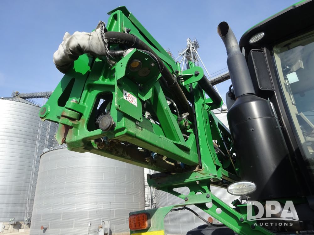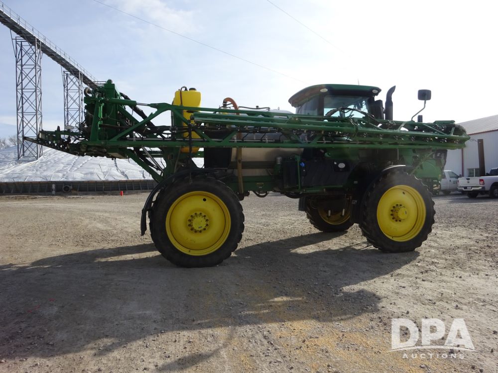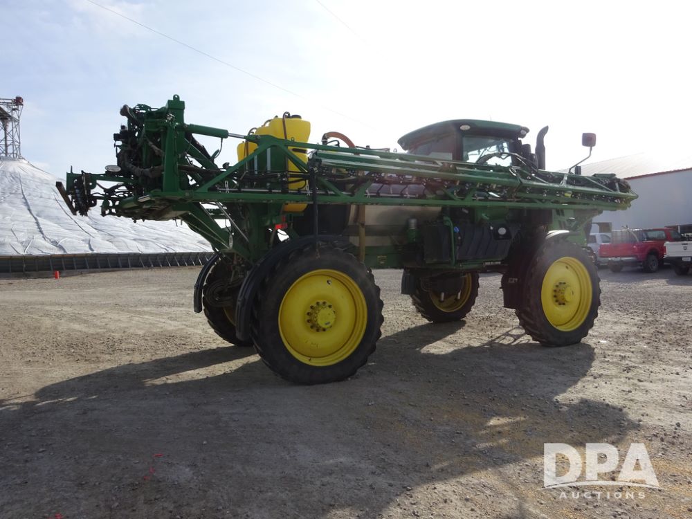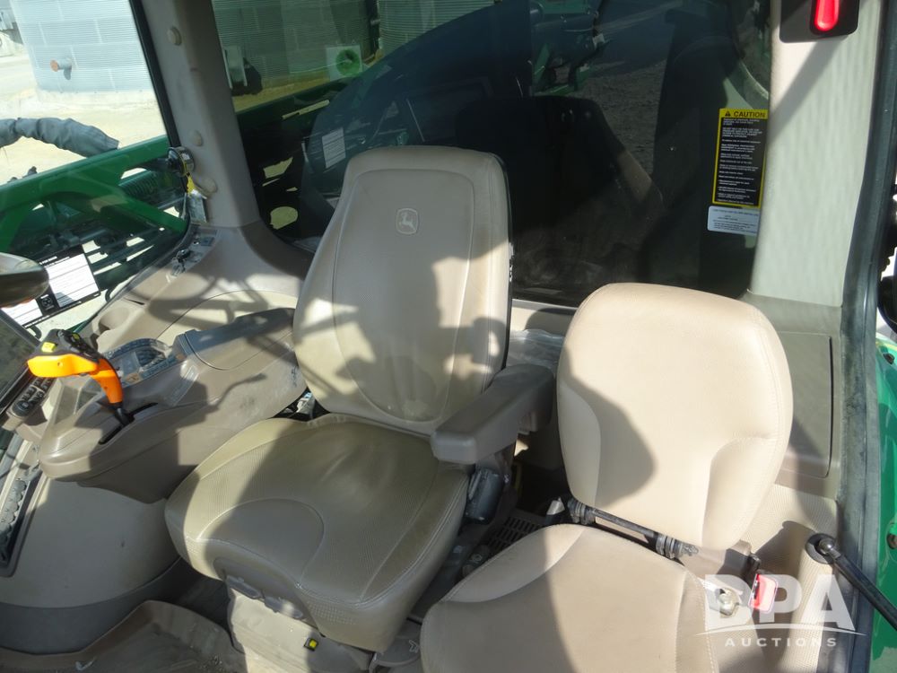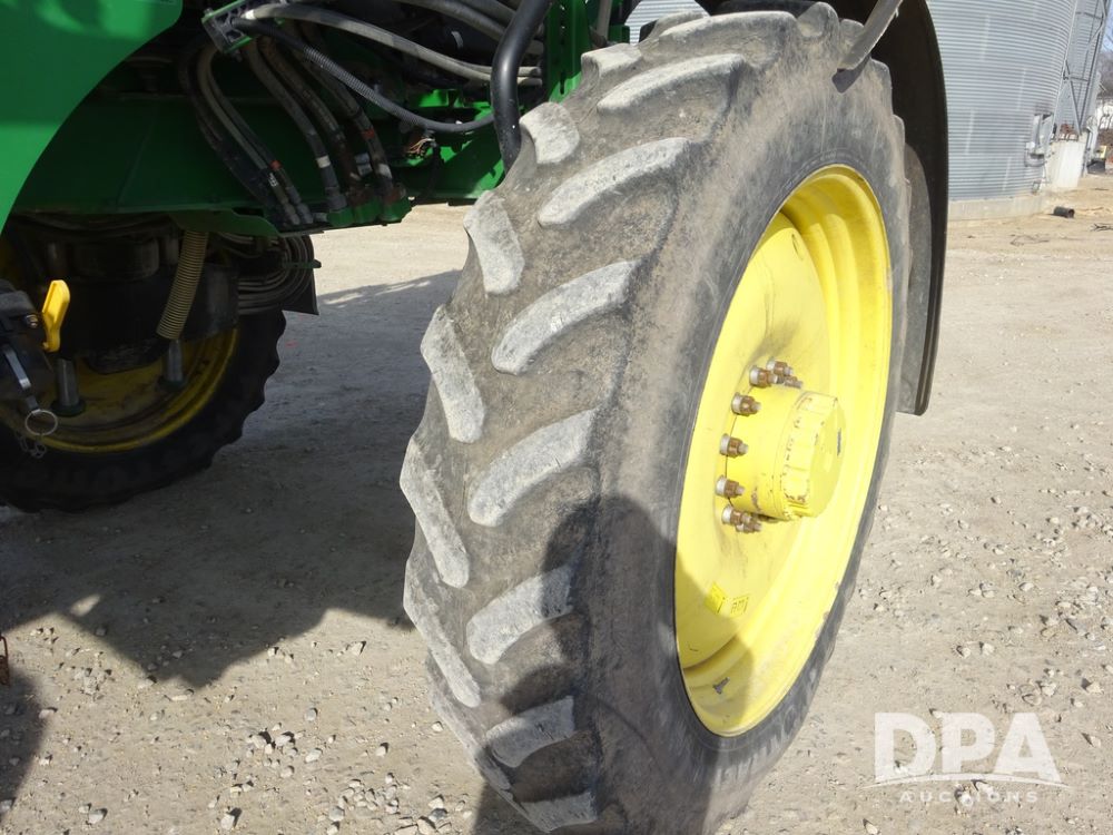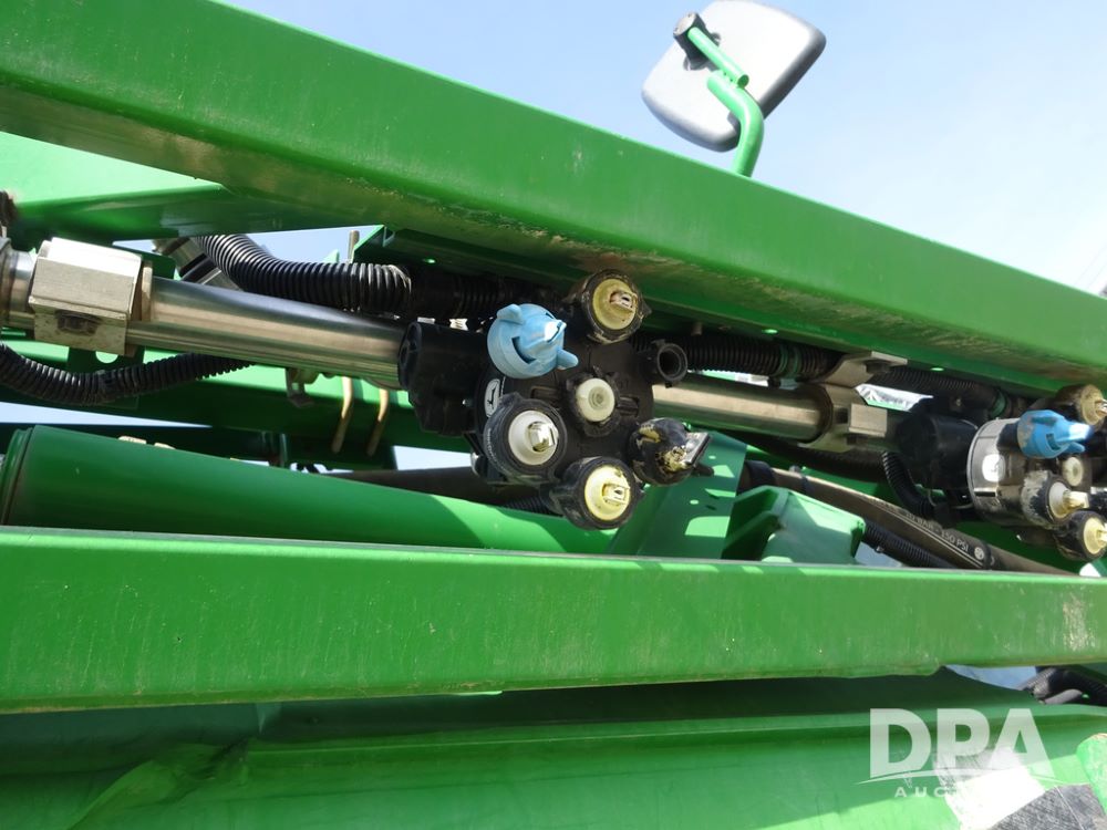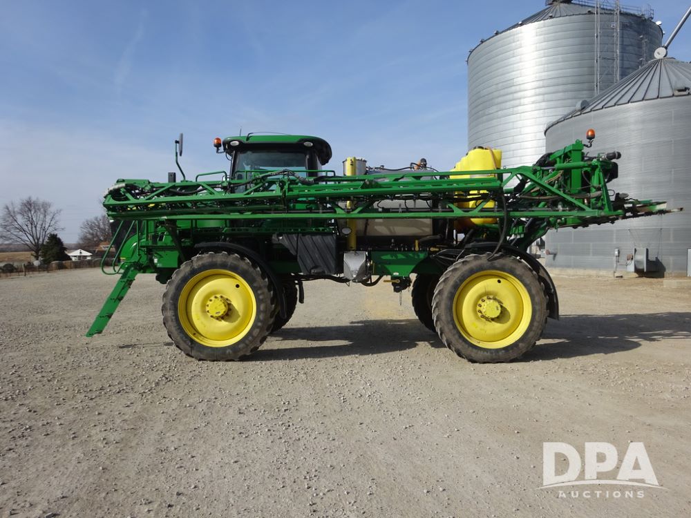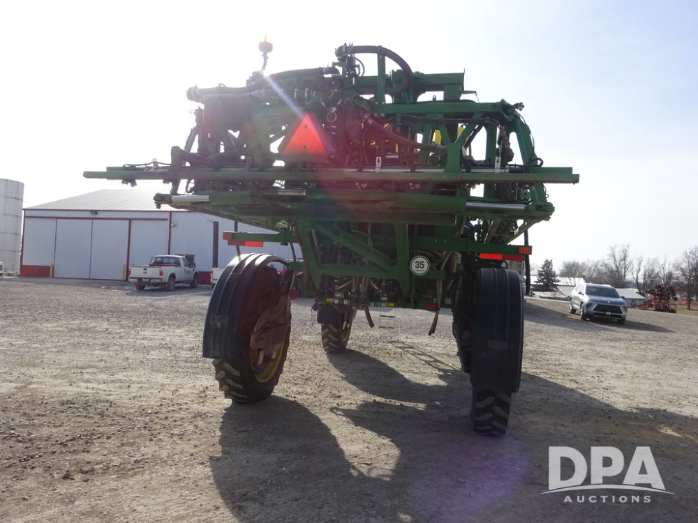2020 John Deere R4038 Sprayer (PZ14369, Unit 3739), John Deere diesel engine (S/N RG6090U079131), hydrostatic transmission, air conditioning, heat, Am/Fm radio, leather seat, buddy seat, beacon lights, 1000 gallon stainless steel liquid system, 100' boom, rear poly rinse tank, 4 - 50 gallon poly direct injection tanks, 2 - Raven Sidekick Pro pumps, stainless steel chemical inductor, automatic solution control, front fill, Firestone IF380/90R46 tires, fenders, John Deere StarFire 6000 globe, John Deere monitor, shows 3,277 hours.