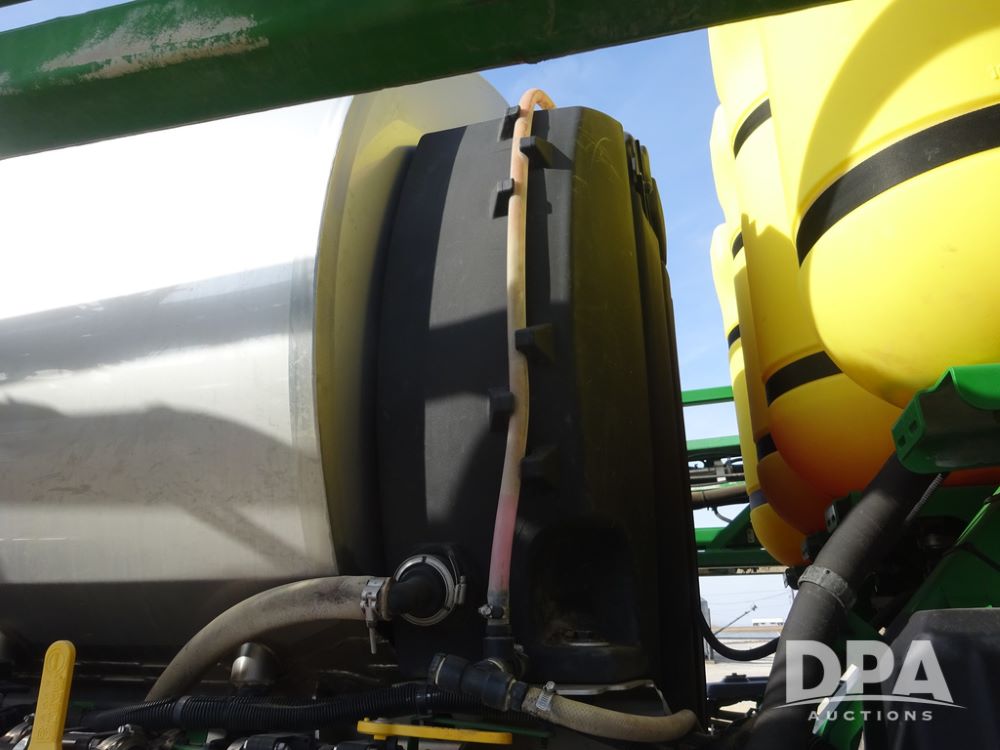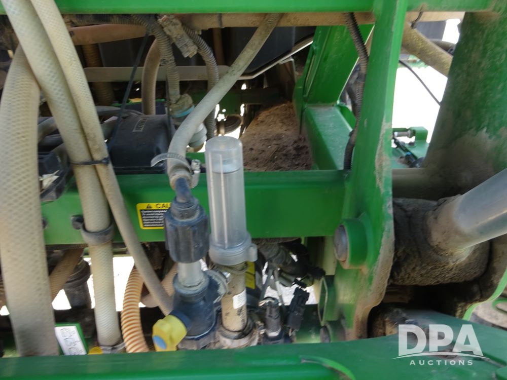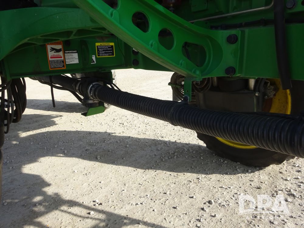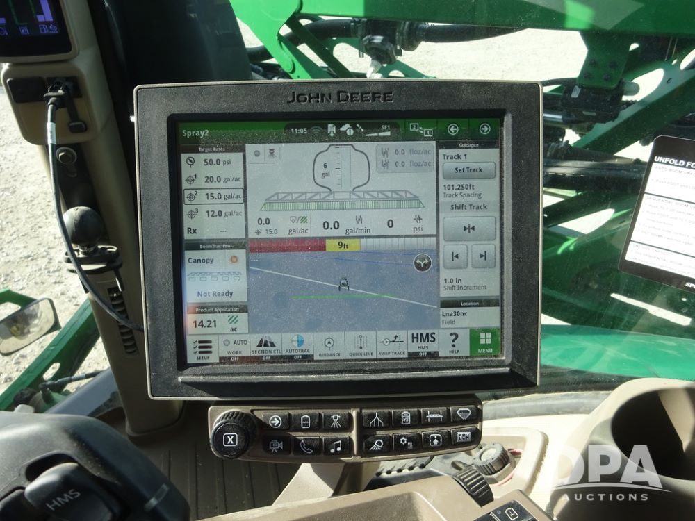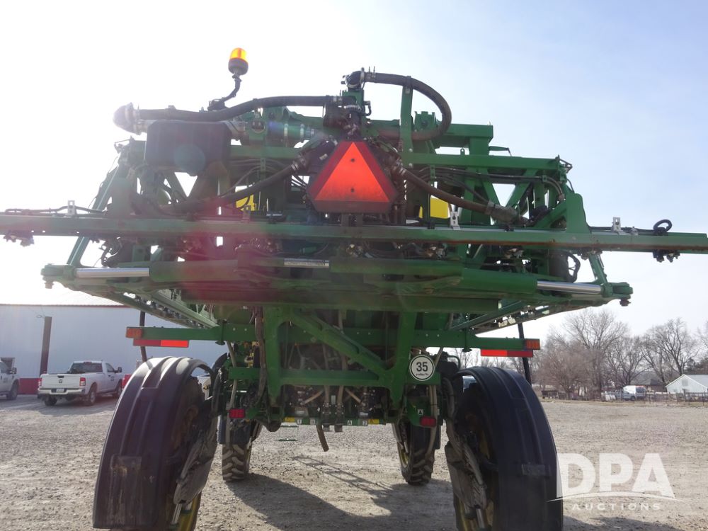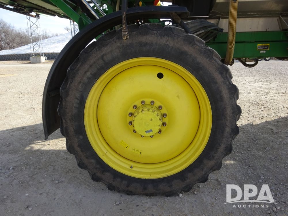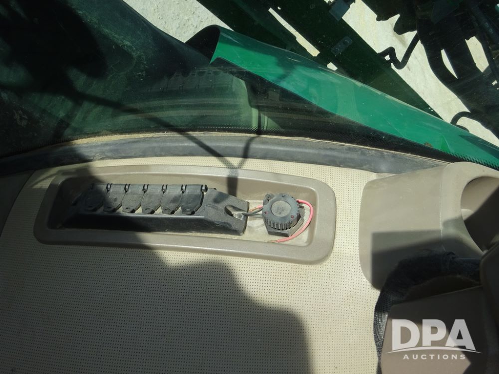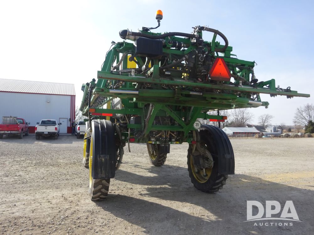 2020 John Deere R4038 Sprayer (PZ14369, Unit 3739), John Deere diesel engine (S/N RG6090U079131), hydrostatic transmission, air conditioning, heat, Am/Fm radio, leather seat, buddy seat, beacon lights, 1000 gallon stainless steel liquid system, 100' boom, rear poly rinse tank, 4 - 50 gallon poly direct injection tanks, 2 - Raven Sidekick Pro pumps, stainless steel chemical inductor, automatic solution control, front fill, Firestone IF380/90R46 tires, fenders, John Deere StarFire 6000 globe, John Deere monitor, shows 3,277 hours.