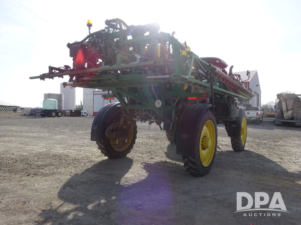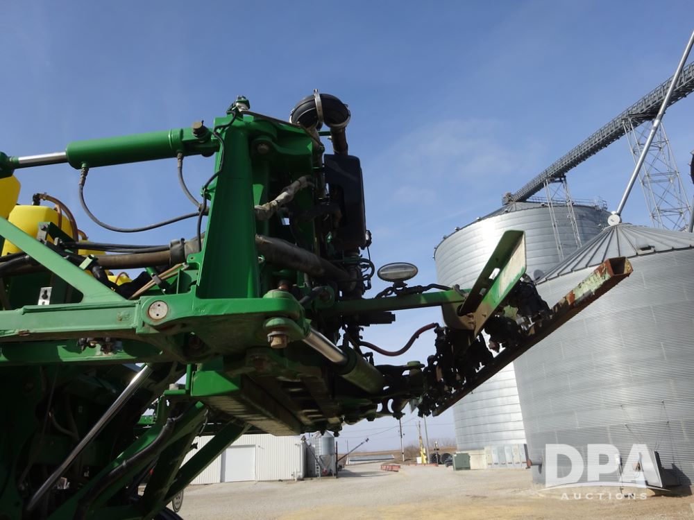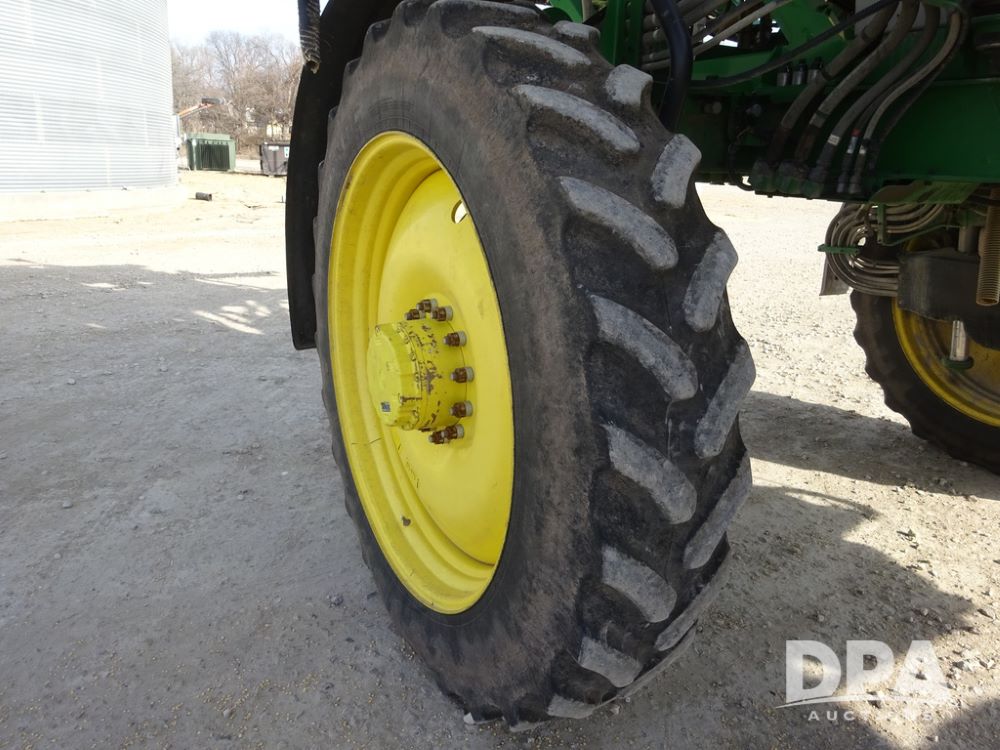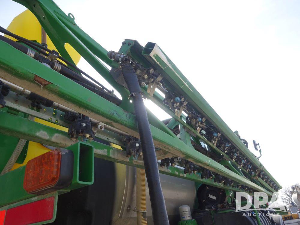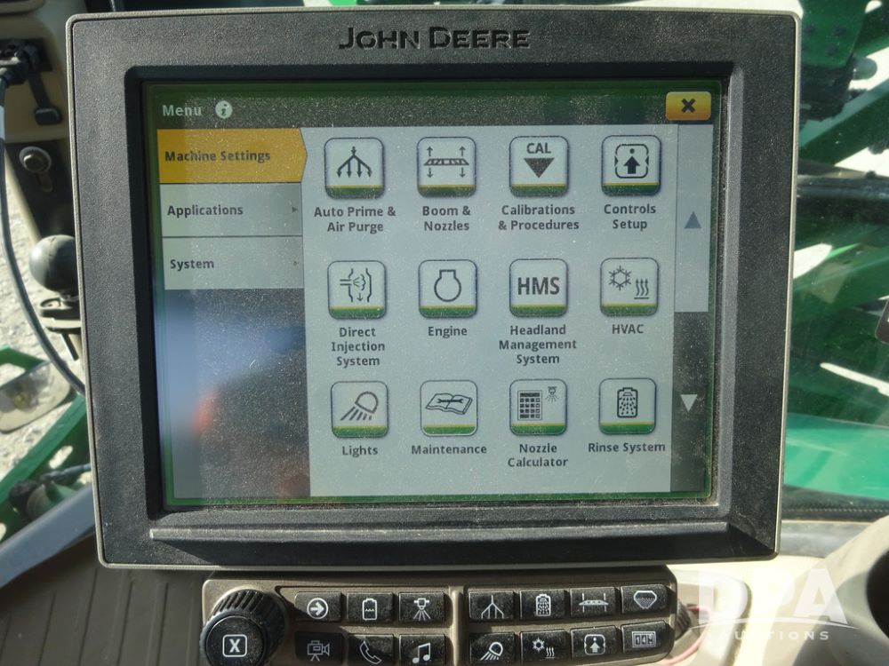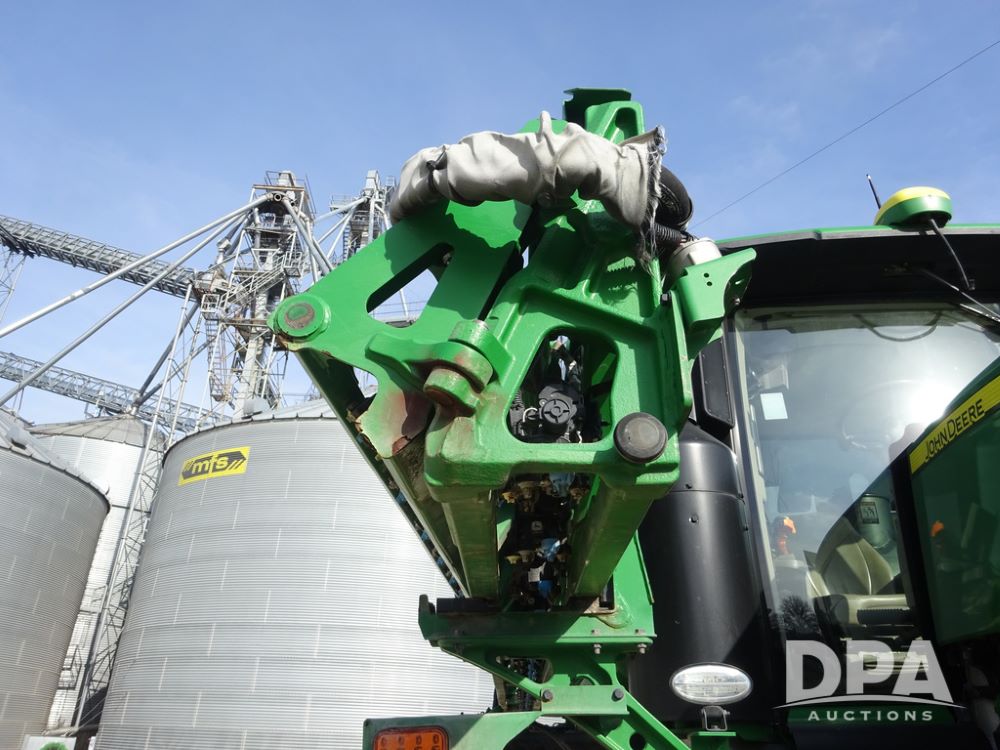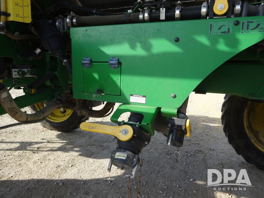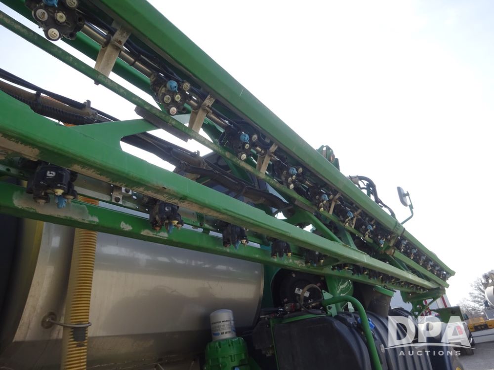 2020 John Deere R4038 Sprayer (PZ14369, Unit 3739), John Deere diesel engine (S/N RG6090U079131), hydrostatic transmission, air conditioning, heat, Am/Fm radio, leather seat, buddy seat, beacon lights, 1000 gallon stainless steel liquid system, 100' boom, rear poly rinse tank, 4 - 50 gallon poly direct injection tanks, 2 - Raven Sidekick Pro pumps, stainless steel chemical inductor, automatic solution control, front fill, Firestone IF380/90R46 tires, fenders, John Deere StarFire 6000 globe, John Deere monitor, shows 3,277 hours.