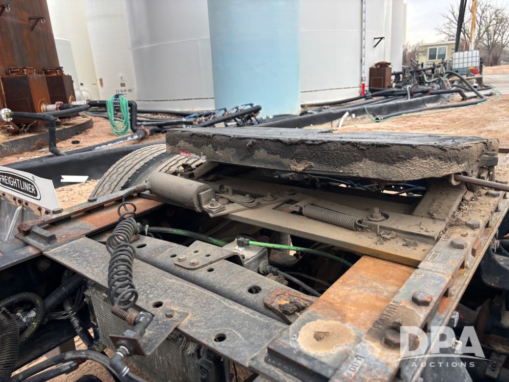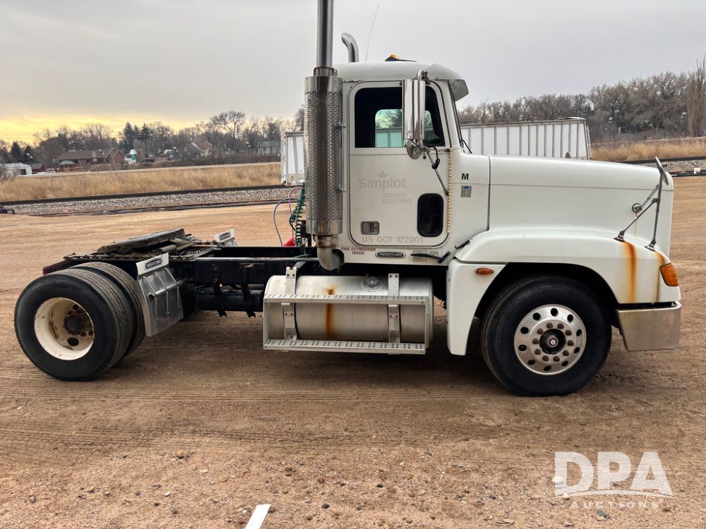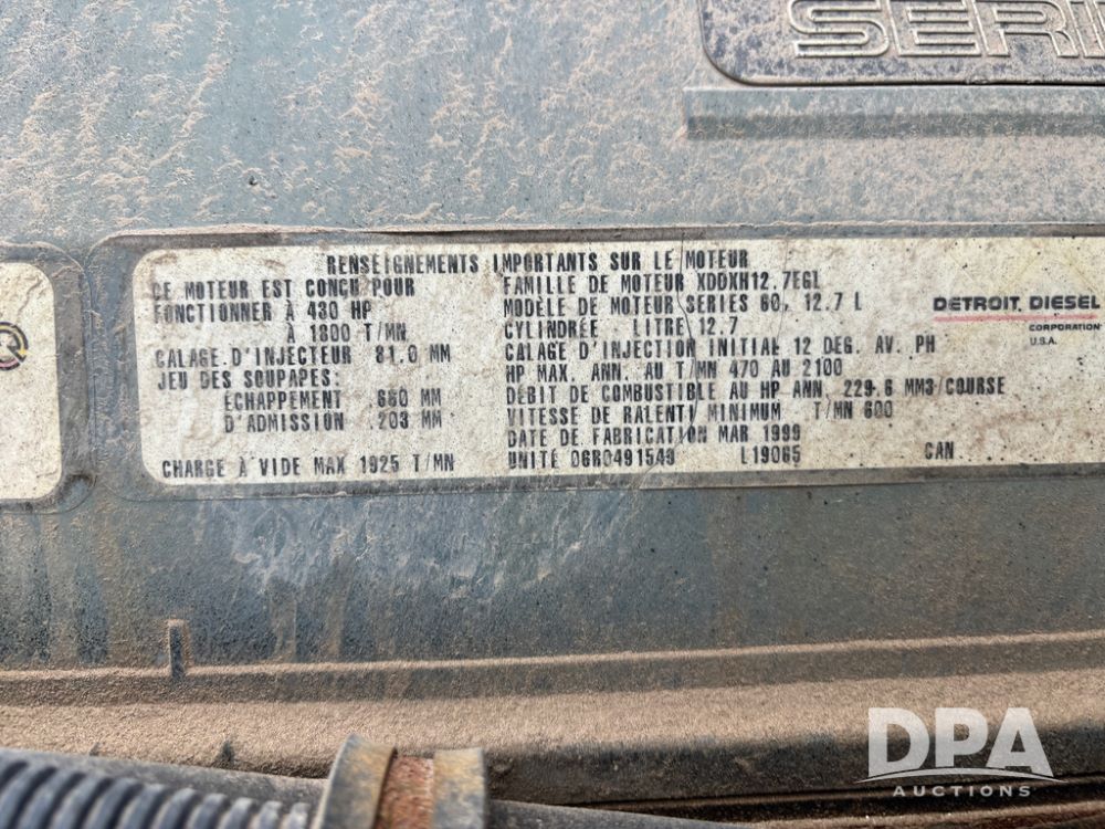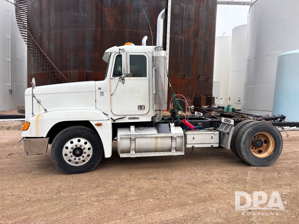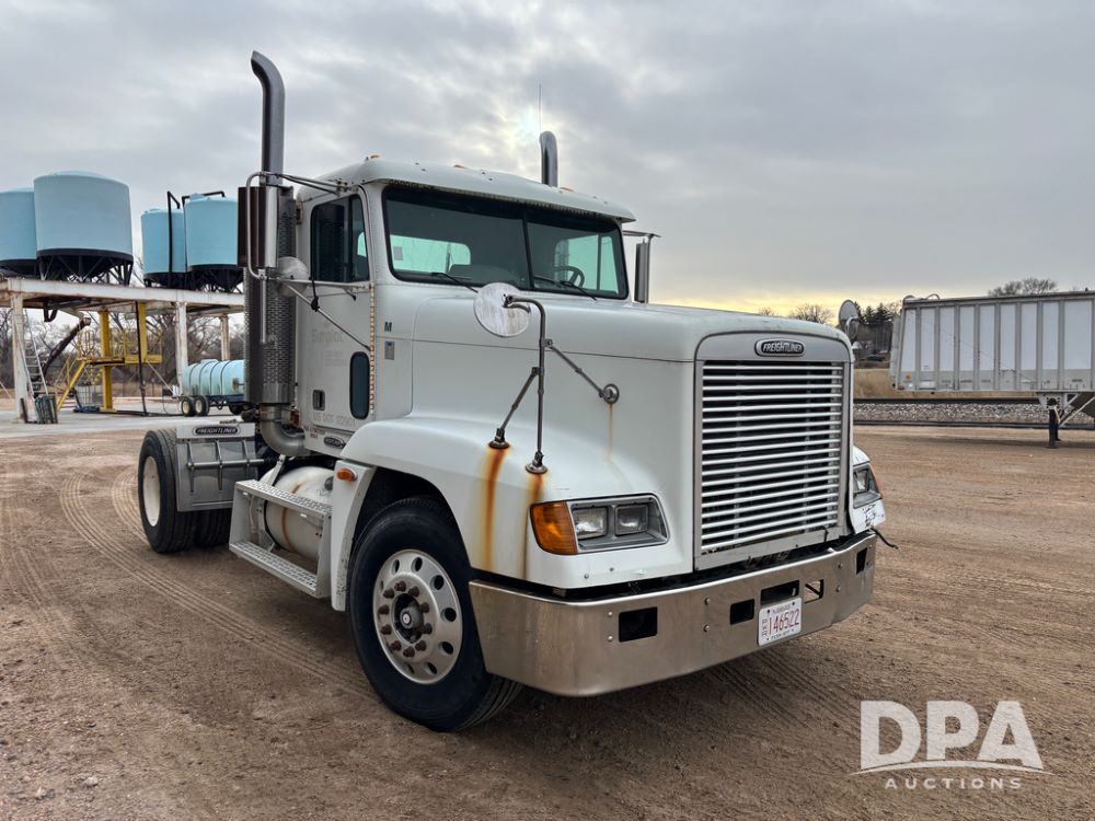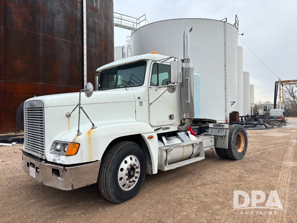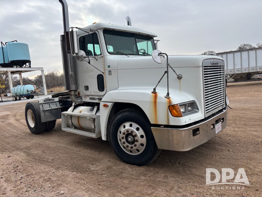 1999 Freightliner Truck (DR13139 Unit 153965), 12.7 liter Detroit diesel engine, Super 10 speed transmission, single axle, air ride suspension, air slide 5th wheel plate, dual aluminum fuel tanks, dual chrome stacks, engine brake, odometer reads 806,699 miles.